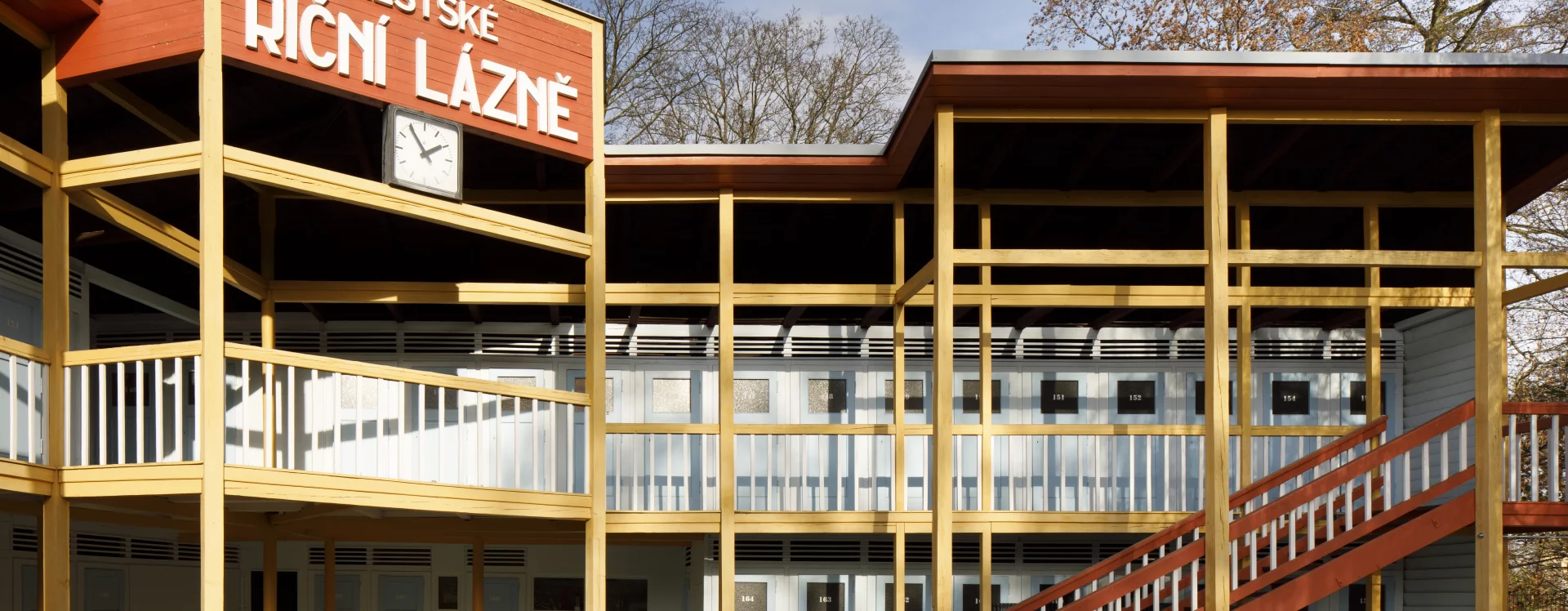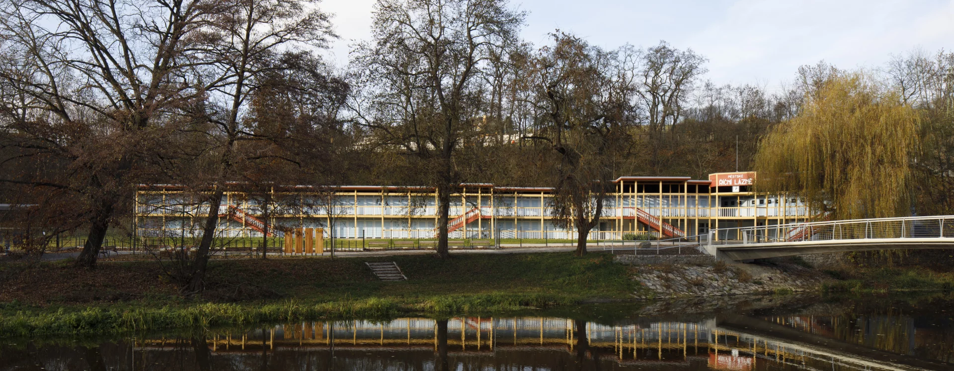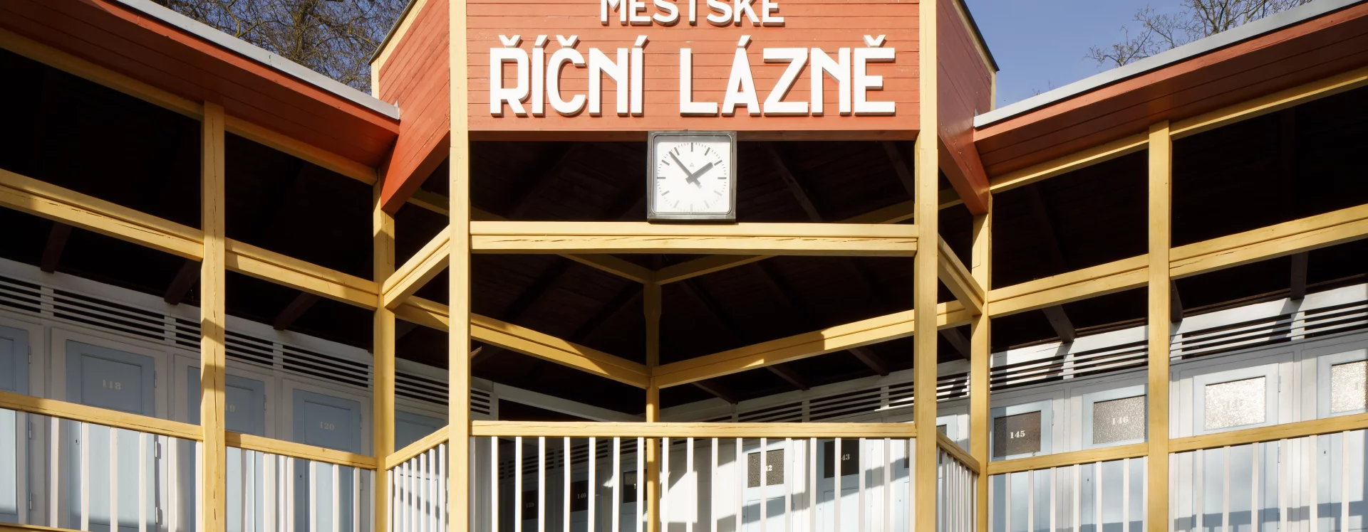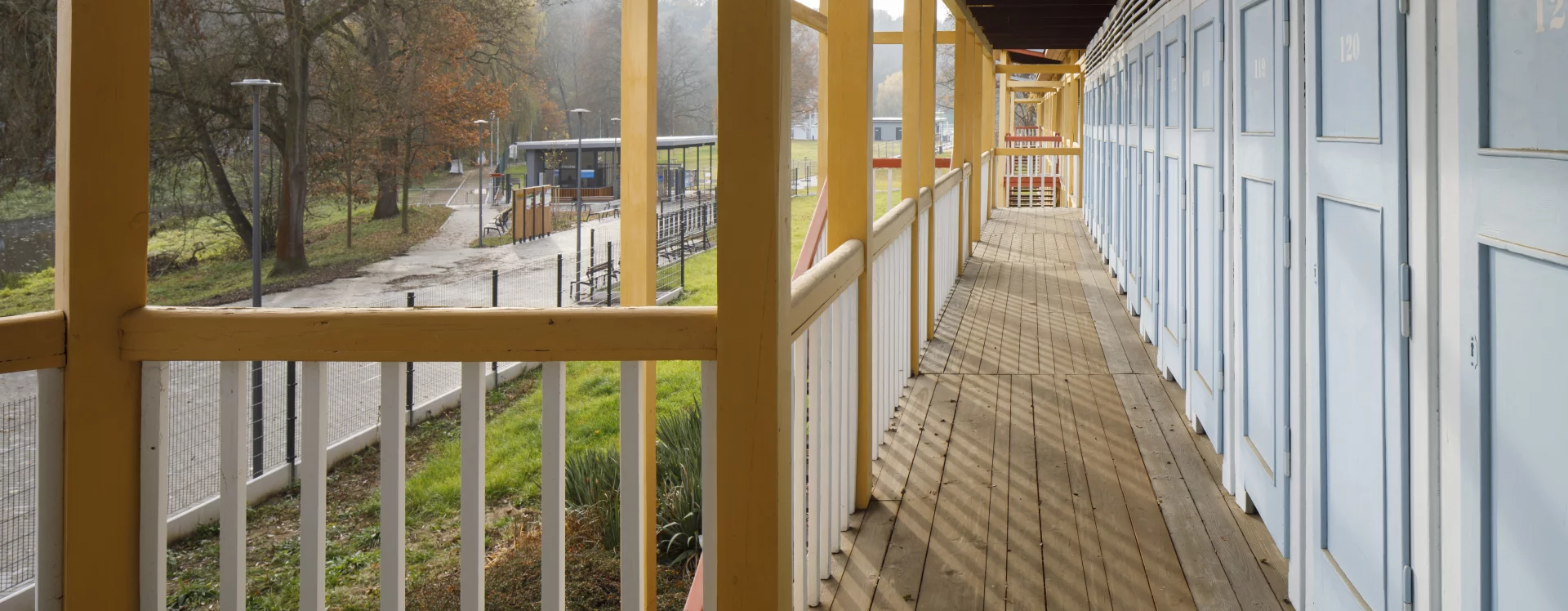 The first river spa in Třebíč was built in 1910 on the right bank of the Jihlava River. The area on its left bank was built in 1933–1934 as a modern municipal swimming pool with a capacity of 1,200 people according to the design of the Brno architect Bohuslav Fuchs. Within his work, this is a unique work, not typologically, as the architect had already designed several outdoor spa areas in Brno – the reconstruction of the Riviéra river spa (1927) or the spa on Svratecký náhon (1928) or the summer spa in Zábrdovice (1930) – the Třebíč spa differs from the catalogue of his works mainly in the use of wood as the main structural material. The two-storey building of the changing cabins is designed as a subtle wooden skeleton structure on the ground plan of an elongated L with four staircases. An open gallery runs along the entire length of the floor, which is connected to the changing cabins closed by cassette doors. The layout of the individual wings differs according to the functional division, while the central part on the ground floor was intended for refreshments and hygiene facilities. The counter roof with a slight slope is supported by wooden columns across both floors and covered with sheet metal. The changing cabin building is It has preserved a high degree of authenticity, including the original wooden structure, layout and many details (only the original color scheme could not be determined, the current one is modern) and was declared a cultural monument in 2011.