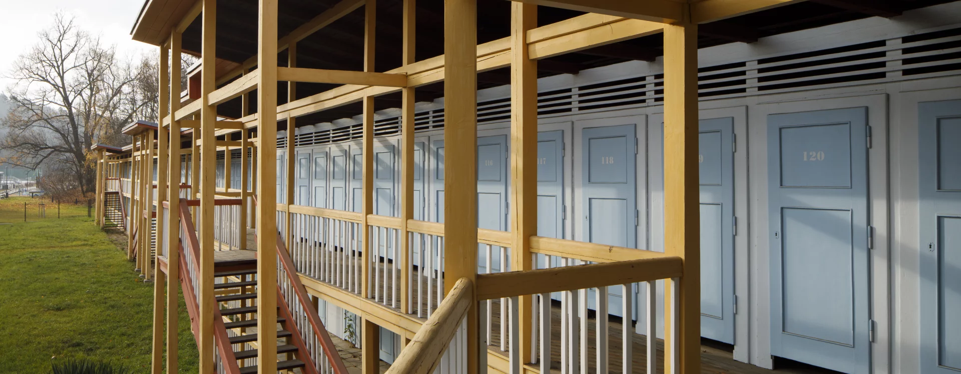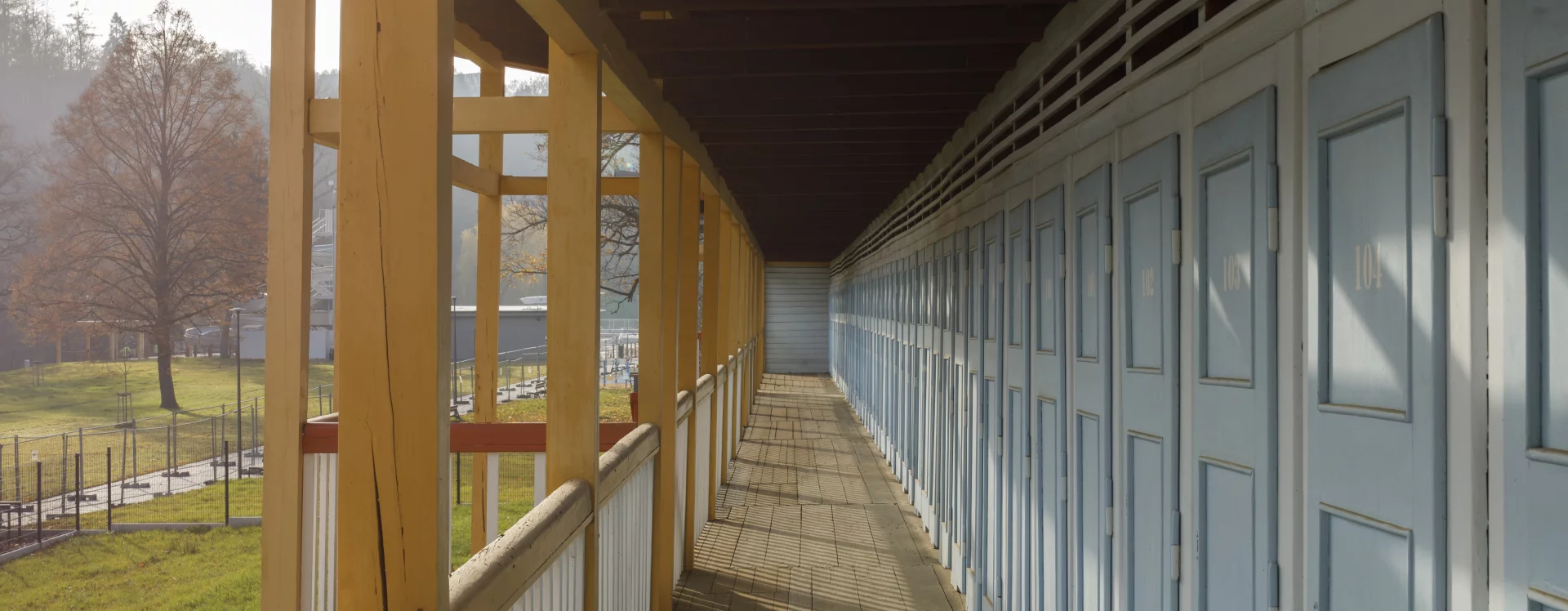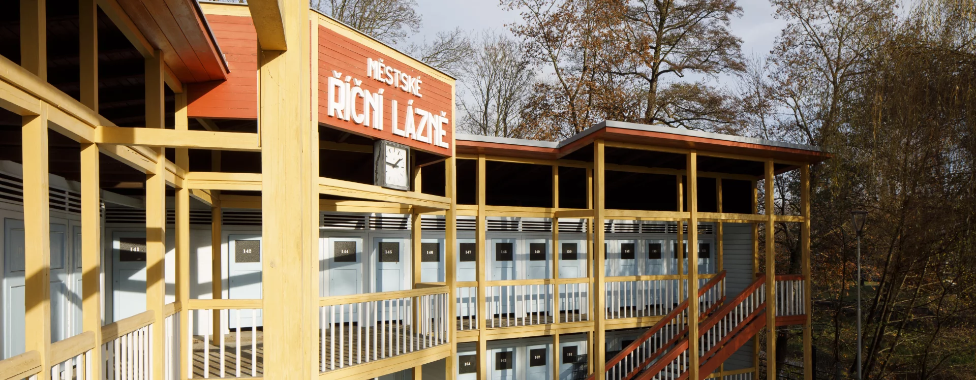 The first river spa in Třebíč was built in 1910 on the right bank of the Jihlava River. The area on its left bank was built in 1933–1934 as a modern municipal swimming pool with a capacity of 1,200 people according to the design of the Brno architect Bohuslav Fuchs. Within his work, this is a unique work, not typologically, as the architect had already designed several outdoor spa areas in Brno – the reconstruction of the Riviéra river spa (1927) or the spa on Svratecký náhon (1928) or the summer spa in Zábrdovice (1930) – the Třebíč spa differs from the catalogue of his works mainly in the use of wood as the main structural material. The two-storey building of the changing cabins is designed as a subtle wooden skeleton structure on the ground plan of an elongated L with four staircases. An open gallery runs along the entire length of the floor, which is connected to the changing cabins closed by cassette doors. The layout of the individual wings differs according to the functional division, while the central part on the ground floor was intended for refreshments and hygiene facilities. The counter roof with a slight slope is supported by wooden columns across both floors and covered with sheet metal. The changing cabin building is It has preserved a high degree of authenticity, including the original wooden structure, layout and many details (only the original color scheme could not be determined, the current one is modern) and was declared a cultural monument in 2011.