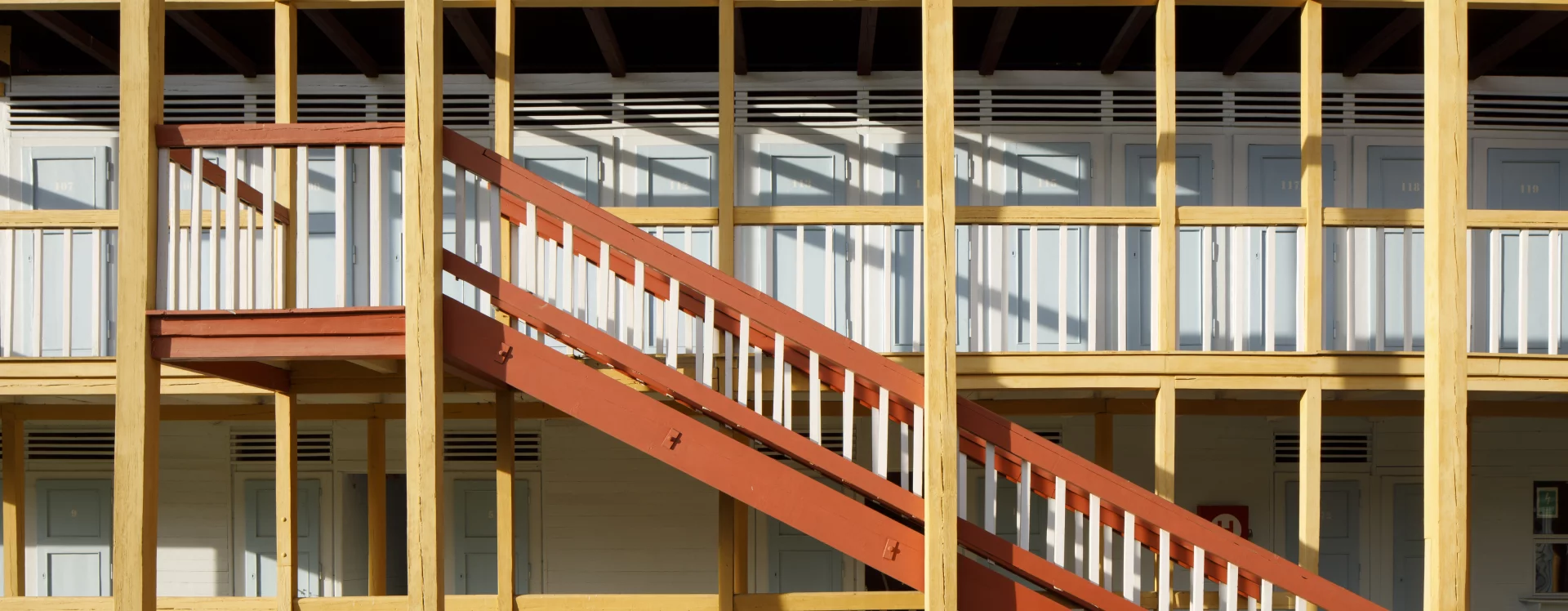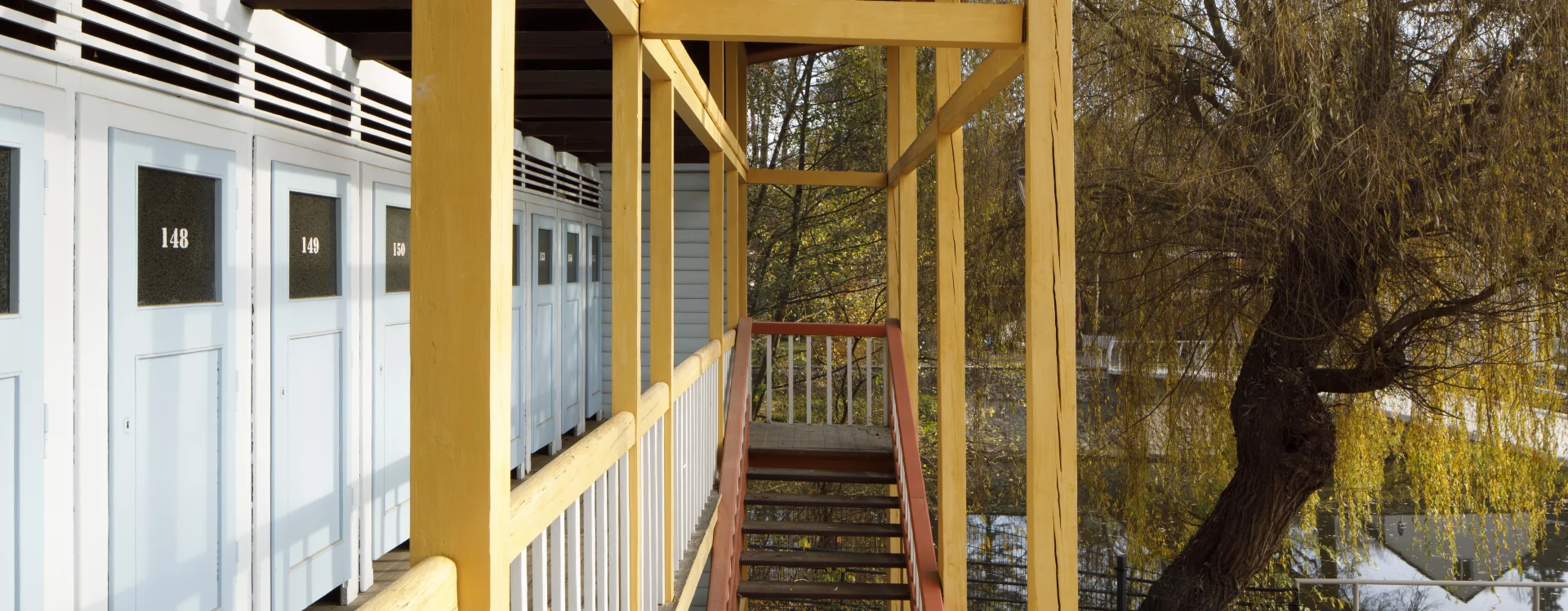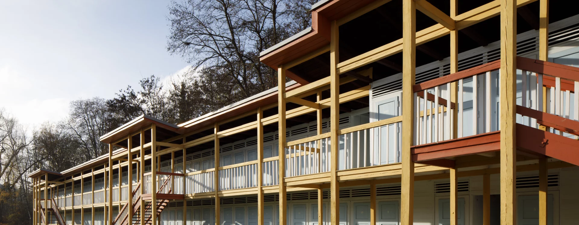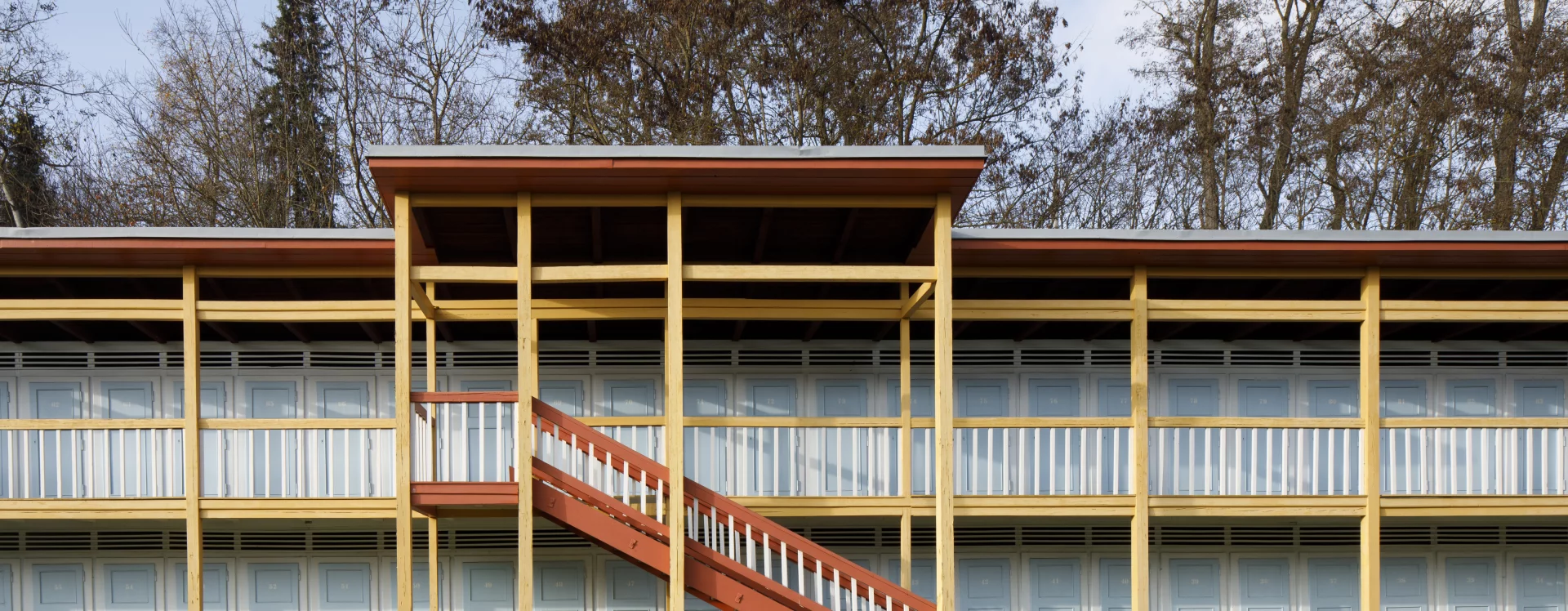 The first river spa in Třebíč was built in 1910 on the right bank of the Jihlava River. The area on its left bank was built in 1933–1934 as a modern municipal swimming pool with a capacity of 1,200 people according to the design of the Brno architect Bohuslav Fuchs. Within his work, this is a unique work, not typologically, as the architect had already designed several outdoor spa areas in Brno – the reconstruction of the Riviéra river spa (1927) or the spa on Svratecký náhon (1928) or the summer spa in Zábrdovice (1930) – the Třebíč spa differs from the catalogue of his works mainly in the use of wood as the main structural material. The two-storey building of the changing cabins is designed as a subtle wooden skeleton structure on the ground plan of an elongated L with four staircases. An open gallery runs along the entire length of the floor, which is connected to the changing cabins closed by cassette doors. The layout of the individual wings differs according to the functional division, while the central part on the ground floor was intended for refreshments and hygiene facilities. The counter roof with a slight slope is supported by wooden columns across both floors and covered with sheet metal. The changing cabin building is It has preserved a high degree of authenticity, including the original wooden structure, layout and many details (only the original color scheme could not be determined, the current one is modern) and was declared a cultural monument in 2011.