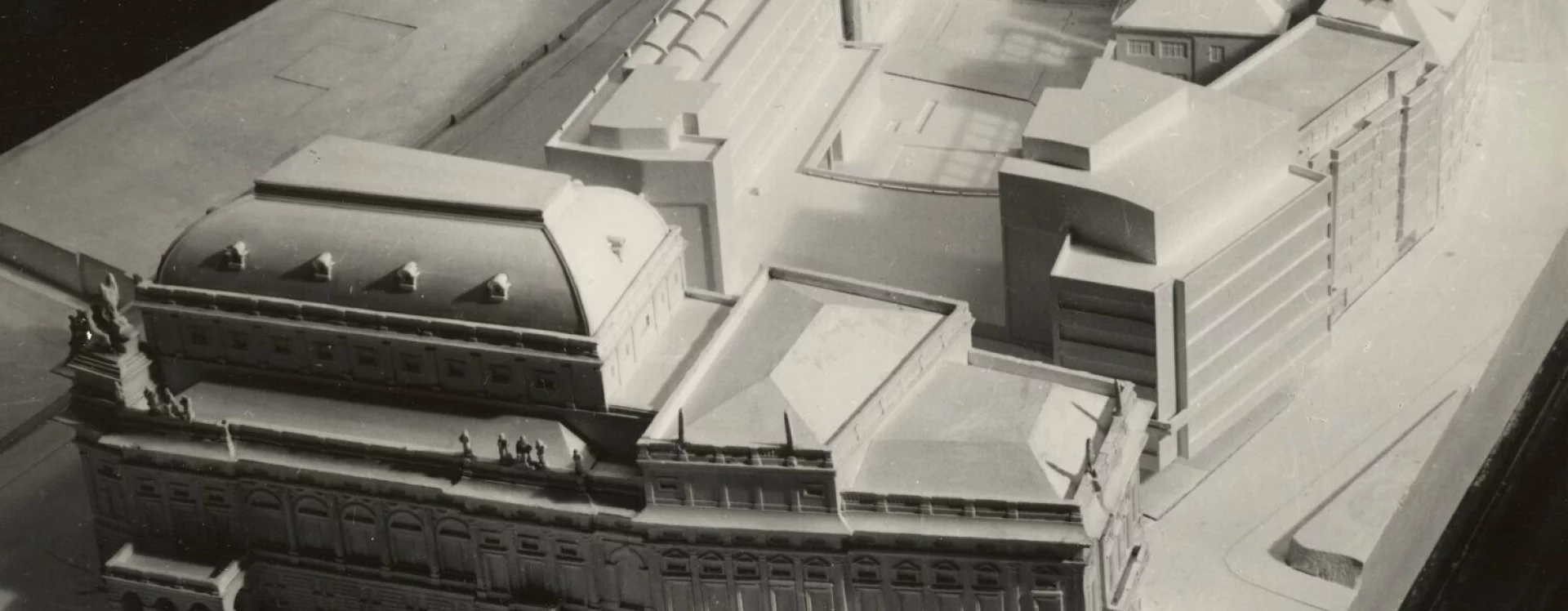 The second phase of the competition in 1964 confirmed the Fuchs family team as the winner again. The subsequent study, prepared by Bohuslav Fuchs and his son Kamil, followed the line of the neighboring monastery, creating a free space in front of the new building, allowing a wide opening of views of the main facade of the theater. The overall solution was characterized by extraordinary sensitivity to the historical, urban and symbolic context of the place and an effort to combine them with the principles of modern architecture.