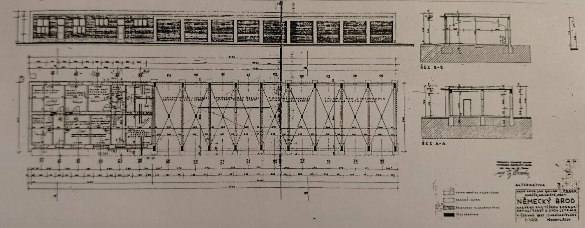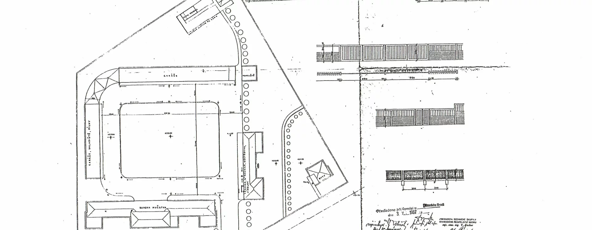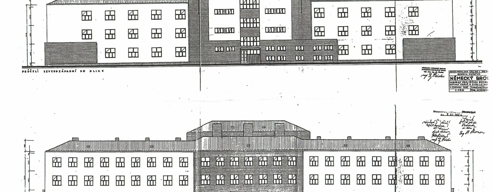 The design for the barracks and airfield in the north-western part of the town, close to the railway line, was drawn up in June 1937 by the architect Jan Gillar (1904–1967), a pupil of Gočár. His task lay primarily in the artistic conception and detailed development of clearly defined military requirements, overseen by the military engineer and construction director, Lieutenant Colonel Jan Junek.