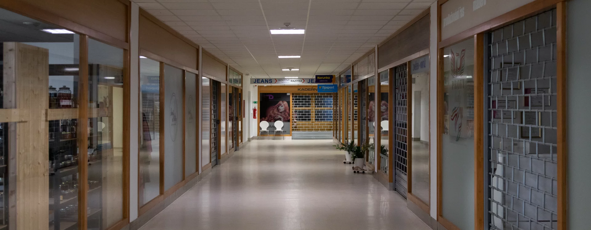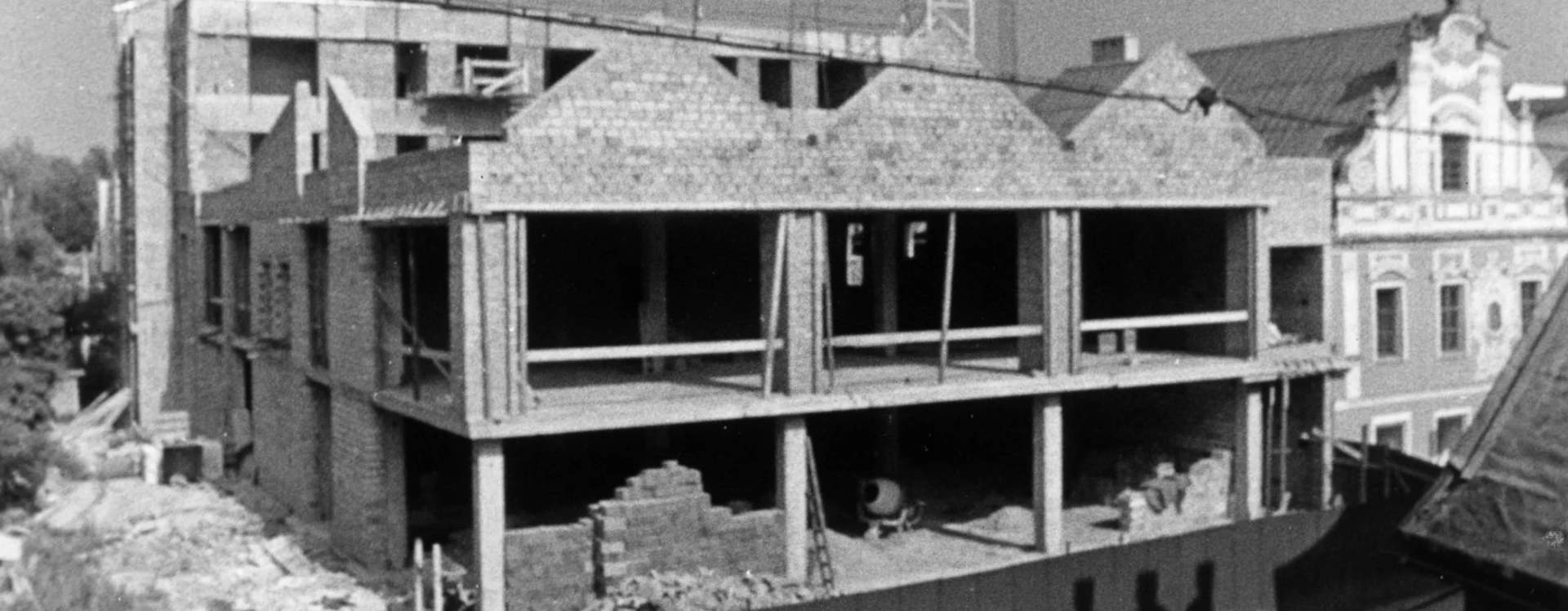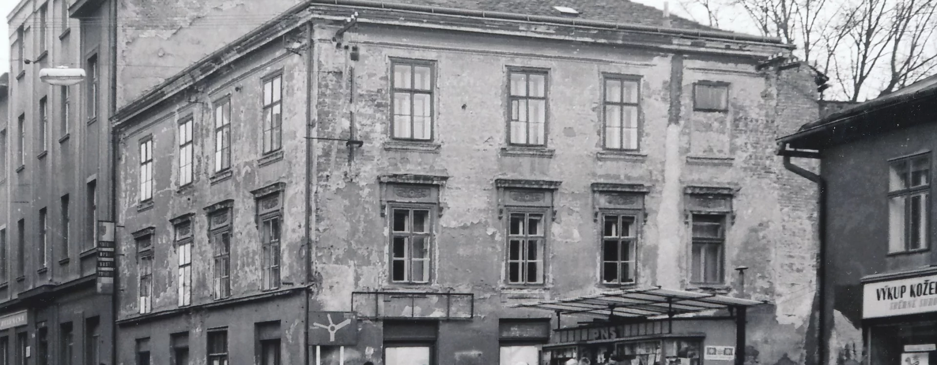 The multifunctional building, constructed using the MS 71 prefabricated frame system, was officially approved in 1984, but by the early 1990s it had already undergone changes in both ownership and appearance. In 1992, the Potraviny Mana grocery store began operating there. The new owner made partial exterior modifications, including new paintwork, the addition of advertising signs, and reflective window films on the first floor. The second floor was renovated in 1998 and converted into a 24-hour games hall. The building’s current form dates from 2014 and bears little resemblance to the original design. The former trio of gable attics was demolished and replaced with only two gables with small windows at their peaks. The previously fully glazed ground floor was bricked in and fitted with sliding doors and standard windows, which also occurred on the second floor. Driml’s architectural features on the southern facade were removed during the renovation, interrupting the original stylistic connection with the Smetana Square I. housing estate.
