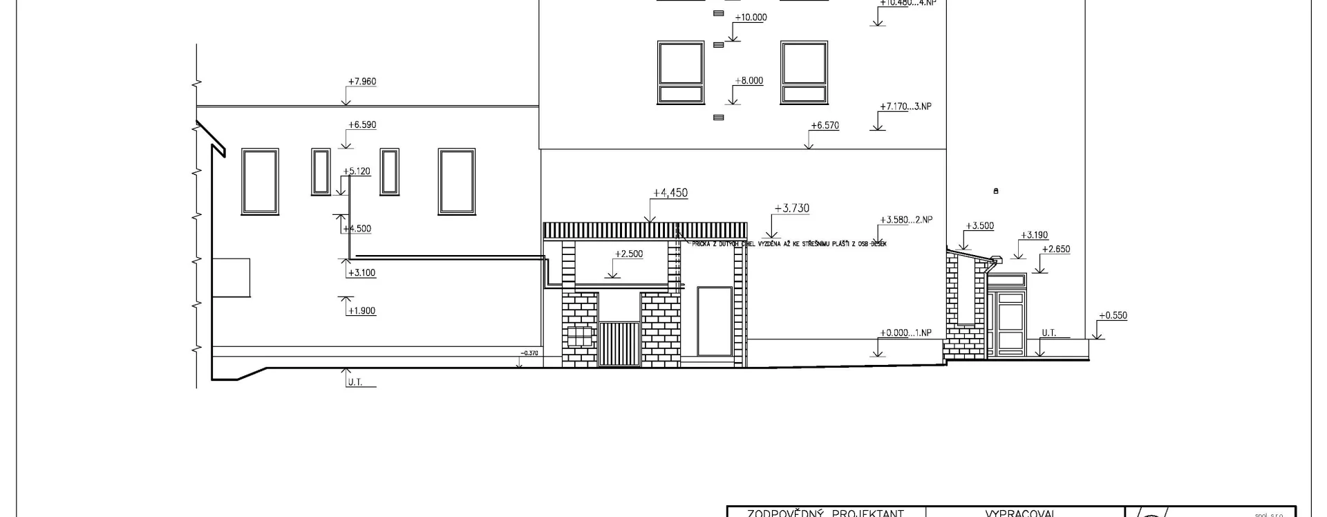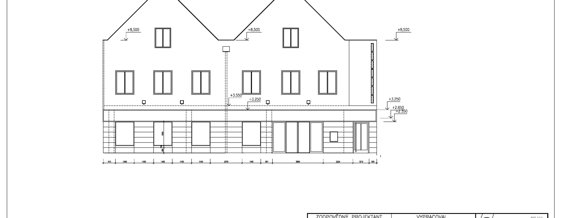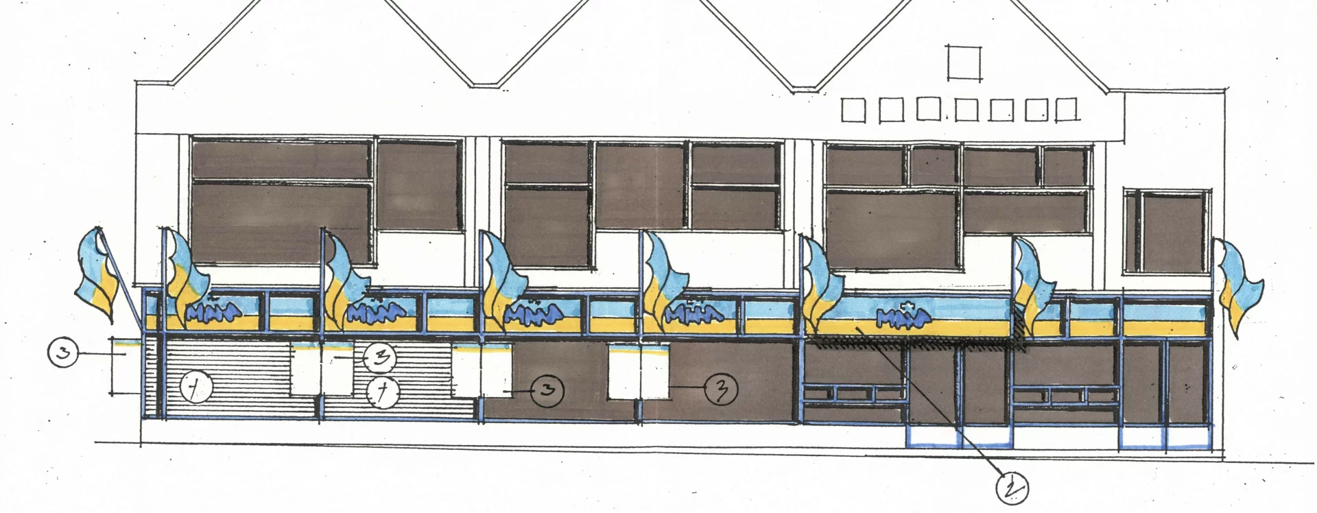 The multifunctional building, constructed using the MS 71 prefabricated frame system, was officially approved in 1984, but by the early 1990s it had already undergone changes in both ownership and appearance. In 1992, the Potraviny Mana grocery store began operating there. The new owner made partial exterior modifications, including new paintwork, the addition of advertising signs, and reflective window films on the first floor. The second floor was renovated in 1998 and converted into a 24-hour games hall. The building’s current form dates from 2014 and bears little resemblance to the original design. The former trio of gable attics was demolished and replaced with only two gables with small windows at their peaks. The previously fully glazed ground floor was bricked in and fitted with sliding doors and standard windows, which also occurred on the second floor. Driml’s architectural features on the southern facade were removed during the renovation, interrupting the original stylistic connection with the Smetana Square I. housing estate.