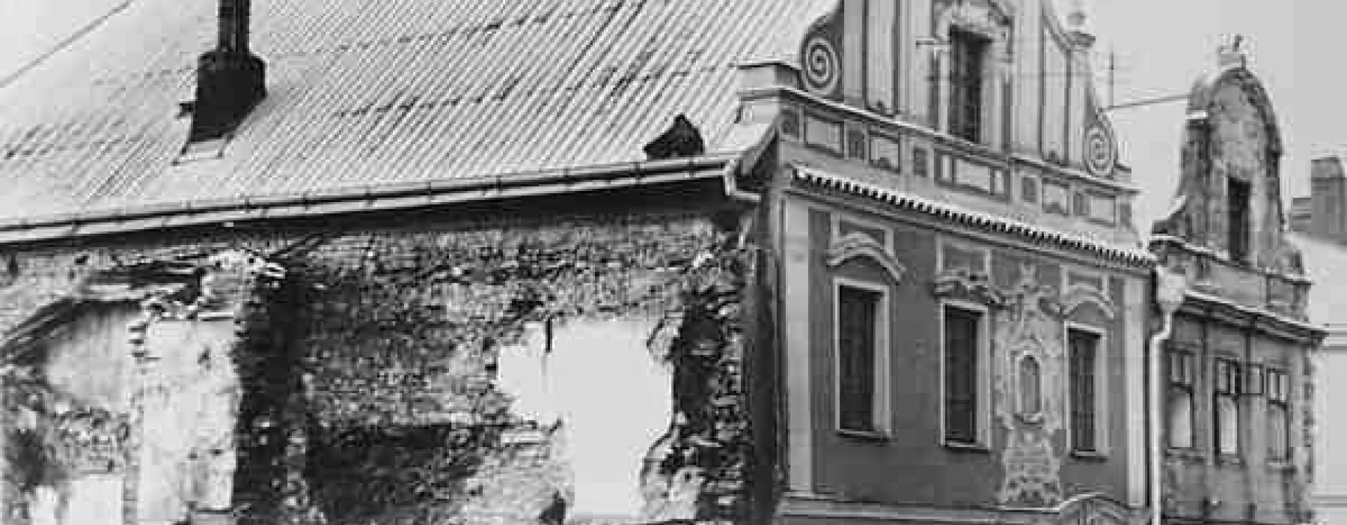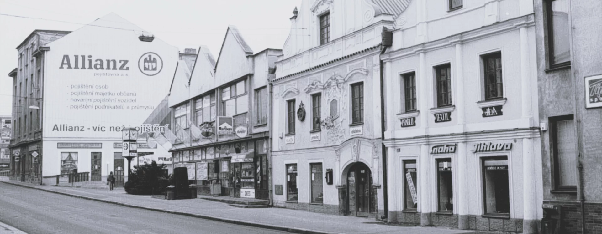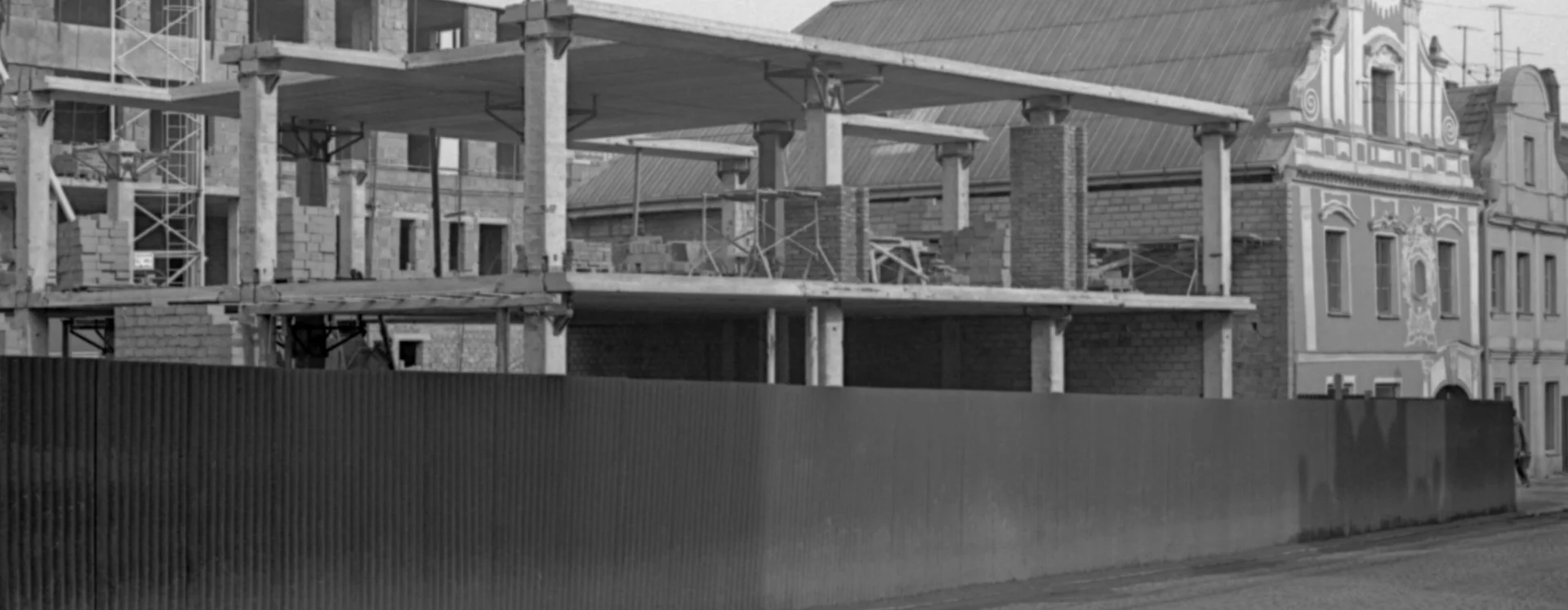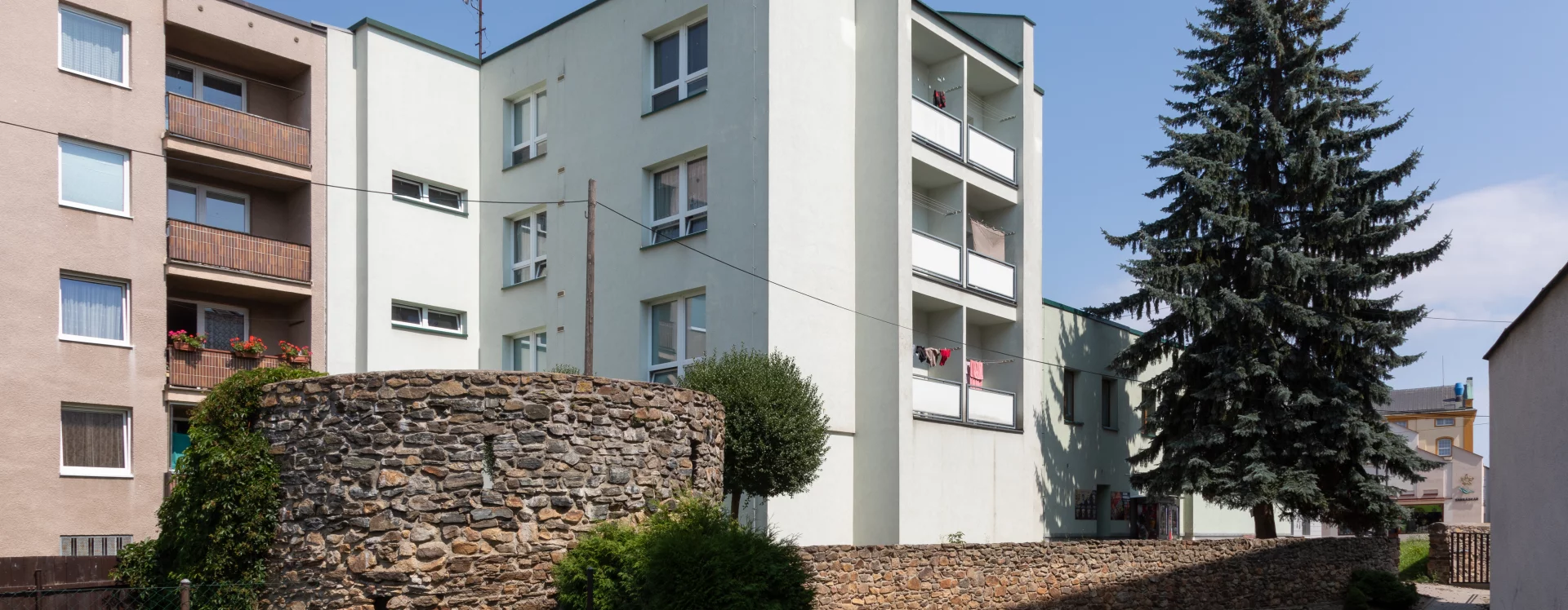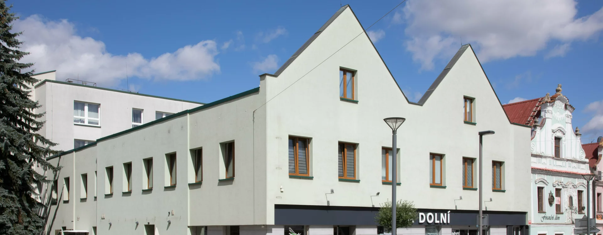 The construction of the building, formerly known as the Centrum department store and later Potraviny Mana, was connected to the development of the Smetana Square I. housing estate (HB-VP-SN1). The estate, consisting of 282 residential units, lies immediately adjacent to the historic town centre and is enclosed between the Gothic stone town walls with bastions and the square, which is dominated by Baroque townhouses. Its construction required the demolition of numerous historic buildings, a consequence of the prolonged housing shortage the town faced throughout the 20th century. The shopping centre neighbours a protected townhouse with a Baroque facade and ornate gable, while the building itself is defined by the town walls on one side and the residential blocks marking the end of V Rámech street on the other.