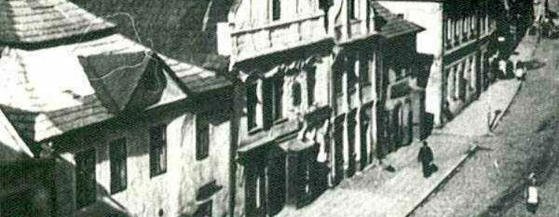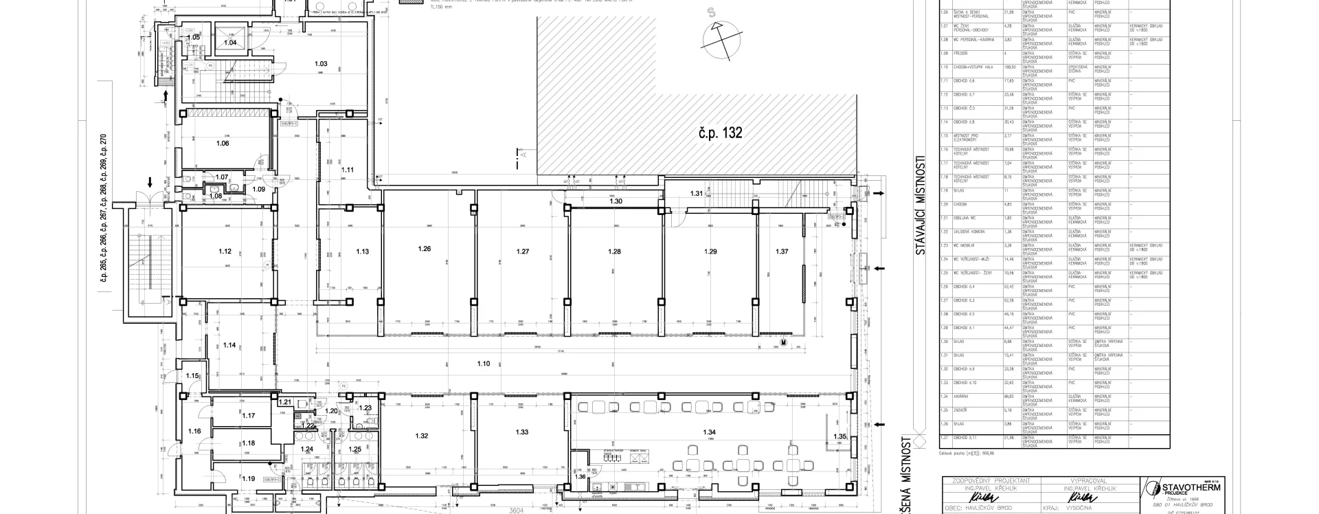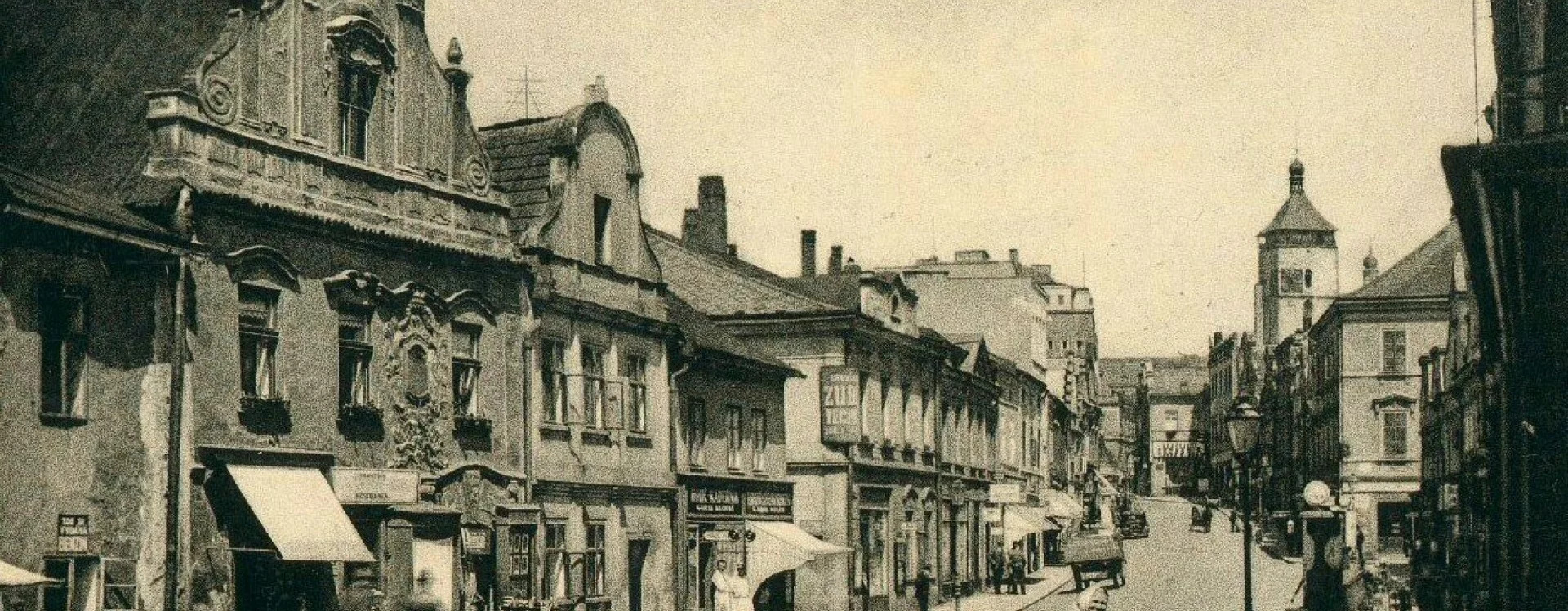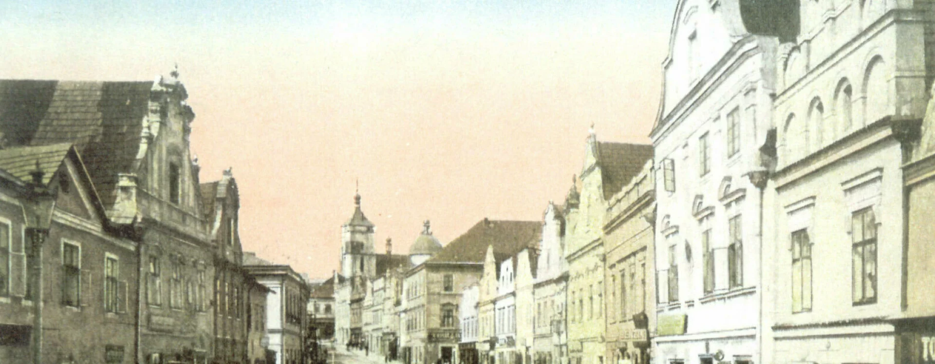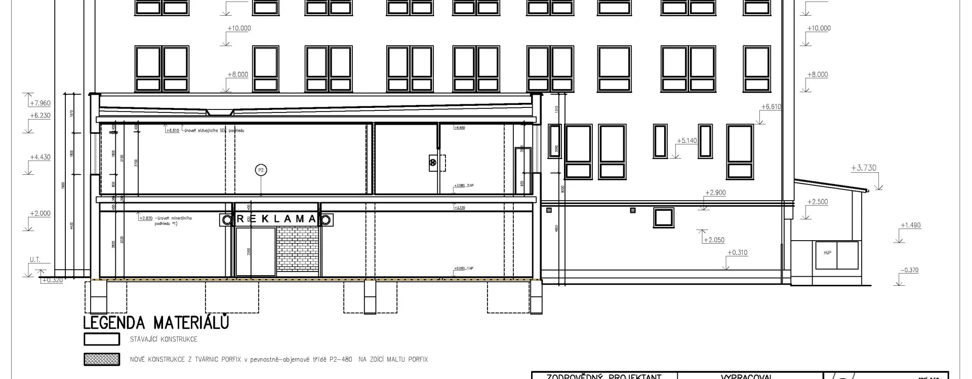 The construction of the building, formerly known as the Centrum department store and later Potraviny Mana, was connected to the development of the Smetana Square I. housing estate (HB-VP-SN1). The estate, consisting of 282 residential units, lies immediately adjacent to the historic town centre and is enclosed between the Gothic stone town walls with bastions and the square, which is dominated by Baroque townhouses. Its construction required the demolition of numerous historic buildings, a consequence of the prolonged housing shortage the town faced throughout the 20th century. The shopping centre neighbours a protected townhouse with a Baroque facade and ornate gable, while the building itself is defined by the town walls on one side and the residential blocks marking the end of V Rámech street on the other.
