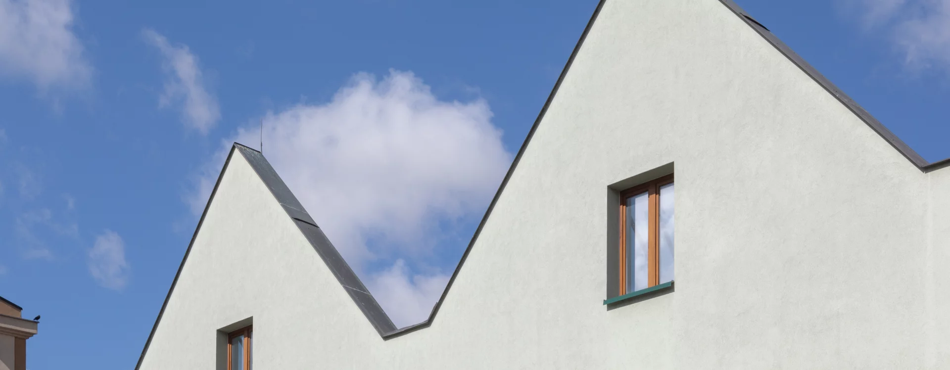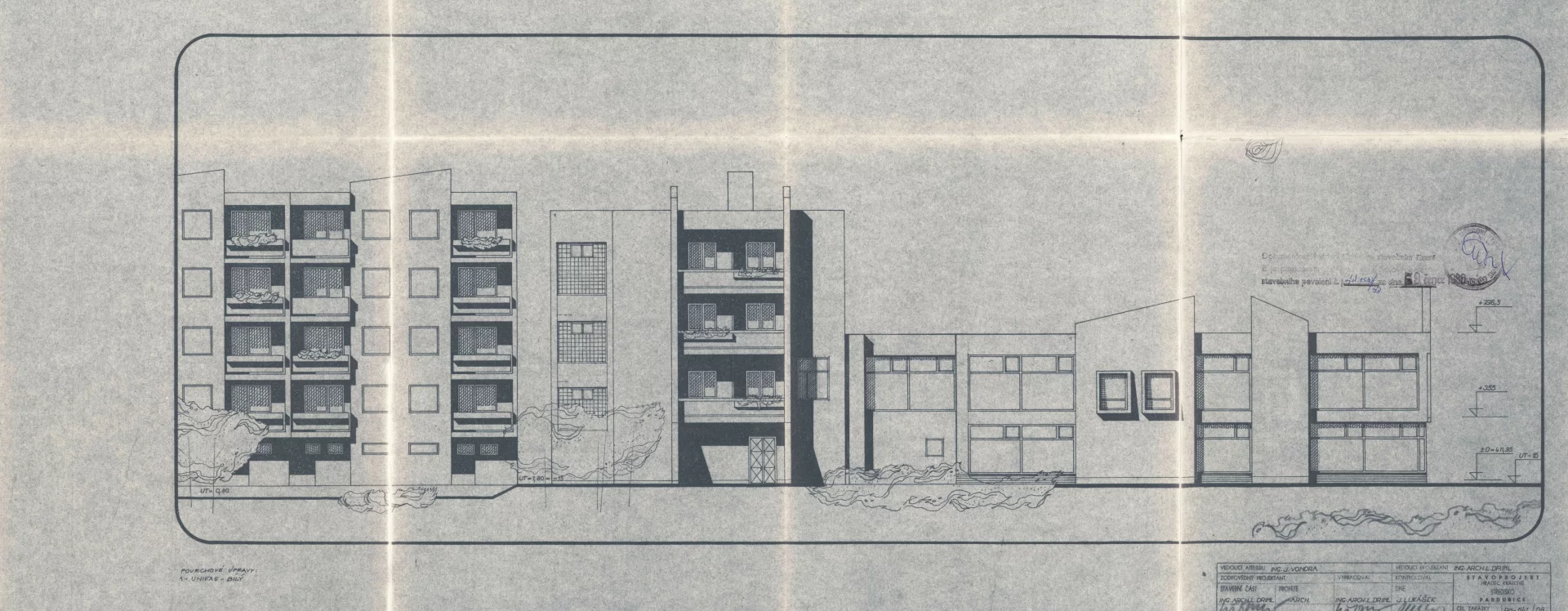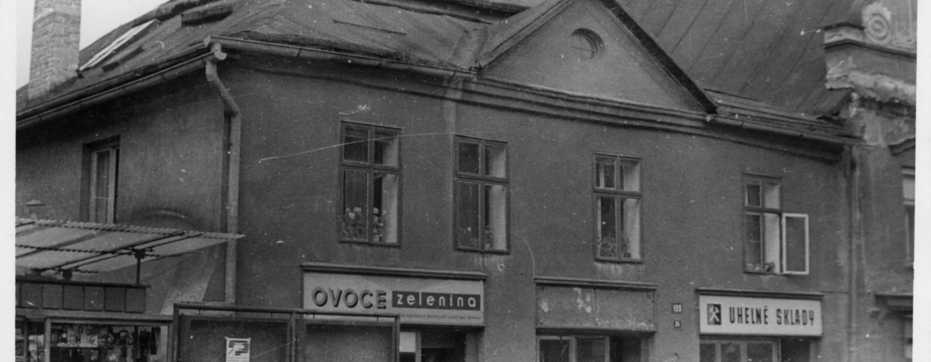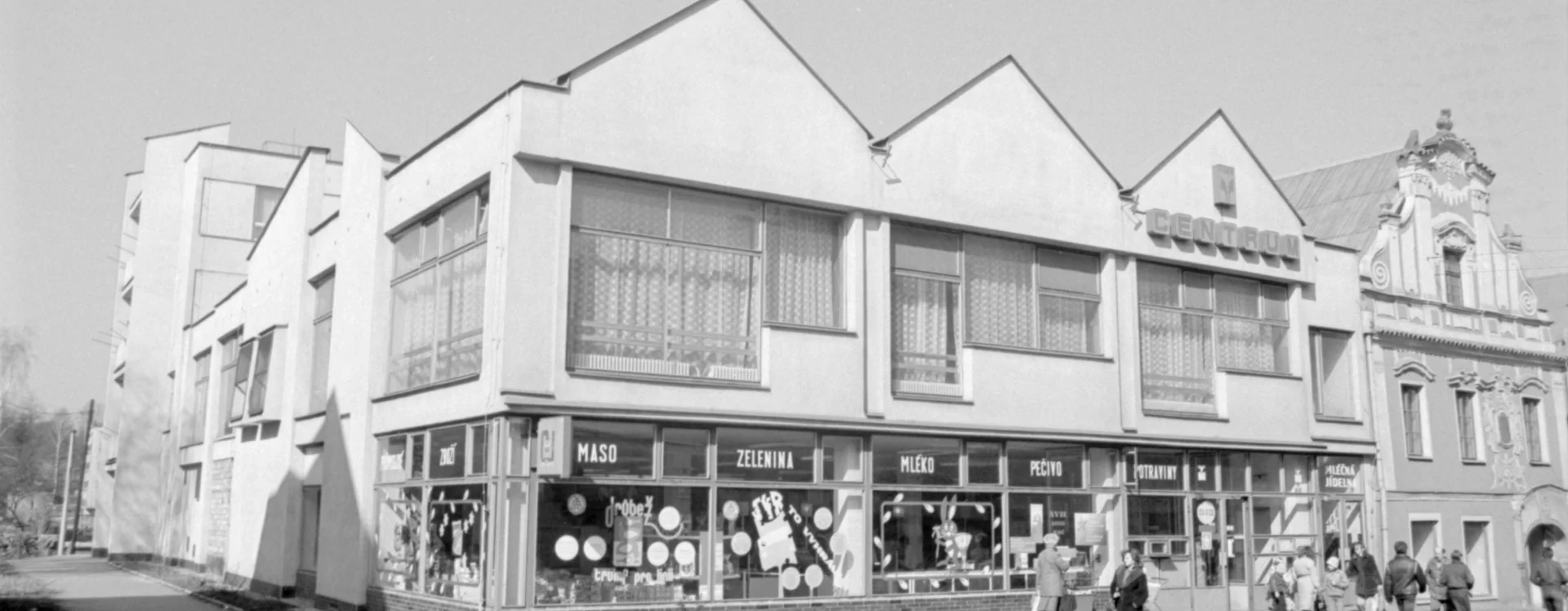 The housing estate and its civic facilities were designed by architect Lubomír Driml of the Pardubice branch of Stavoprojekt. He designed the department store only shortly before the completion of the residential construction in 1977. Driml drew from the artistic and architectural elements of the Smetana Square I. housing estate. He divided the facade of the two-storey shopping centre into three symmetrical sections, referencing the original local layout. The ground floor, housing a grocery store, features full-length glass display windows, while the second floor, containing a milk bar, is defined by bands of tall glass windows. The most striking architectural feature is a series of regular triangular gables which are the same height as the neighbouring historic townhouses. Driml deliberately left them devoid of decorative detail, approaching a postmodern and contextual architectural thinking. Of particular note is the original southern facade, which he visually linked to the adjoining residential blocks by introducing vertical elements that interrupt its uniformity. The sloped walls are capped at gable height with irregular chamfers, and projecting window recesses further articulate the surface. The four-storey rear section of the building was intended for storage, a boiler room and twelve residential units, which had been part of the project from the outset.