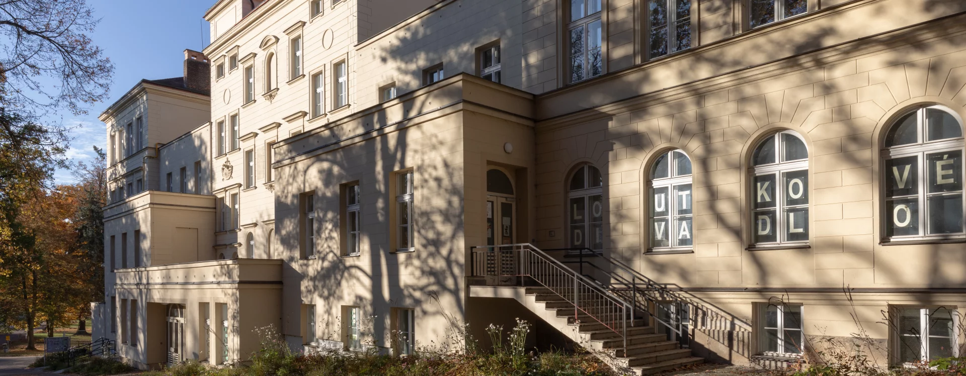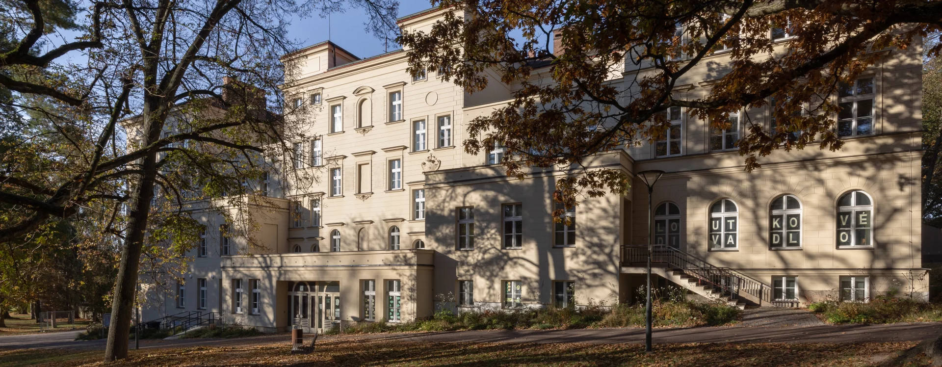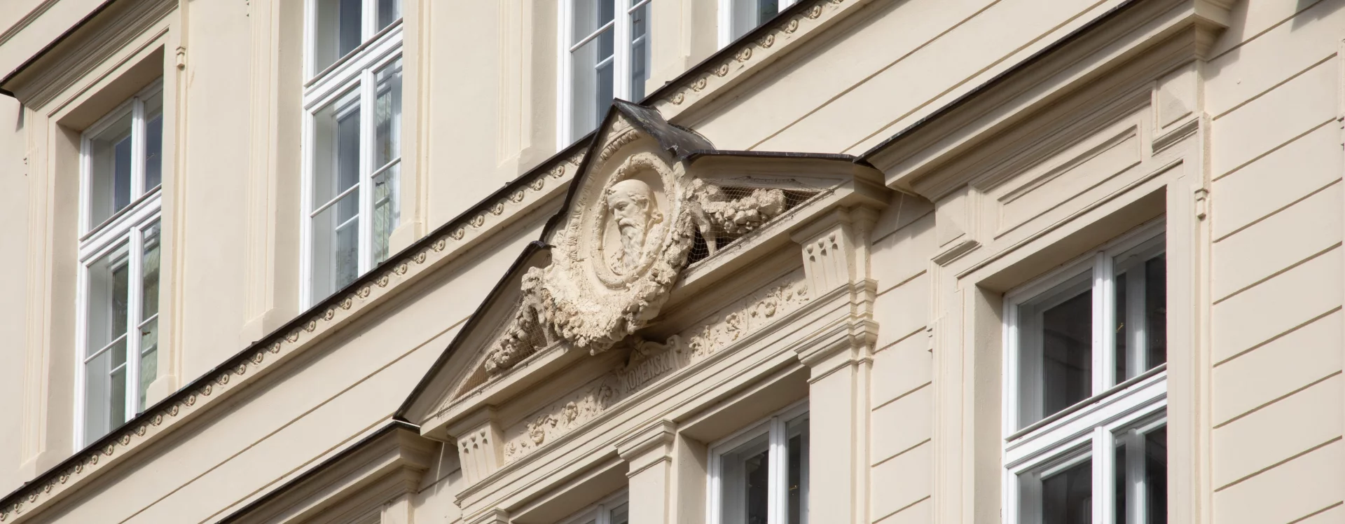 A grandly designed two-storey building was erected, which the architect sited on the open space of Rubeš Square, at the point where Budoucnost Park begins. To emphasize the importance of the building as an educational institution, he chose the Neo-Renaissance style for its decoration—which was then a well-established artistic form commonly used for schools, museums, theatres and scientific institutes, evoking the Renaissance as a period of exceptional cultural development, advanced learning, and knowledge. Kheil highlighted this concept through additional decoration to the facade. Above the main entrances (the left leading to the girls’ school and the right to the boys’ school), he placed busts of the eminent Czech educators Jan Amos Comenius and his modern-day successor Gustav Adolf Lindner. Both were created by Karel Vlačiha (1850–1932), a Prague-based sculptor, stucco artist, and highly prolific restorer.