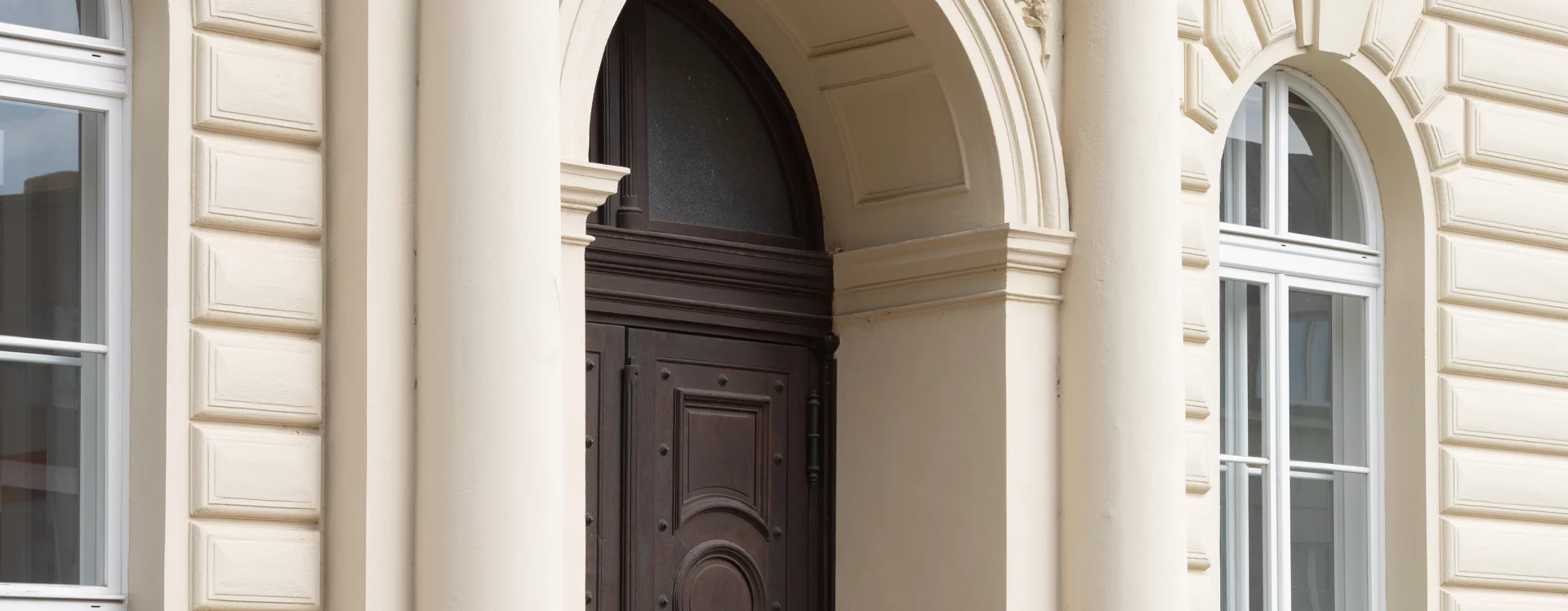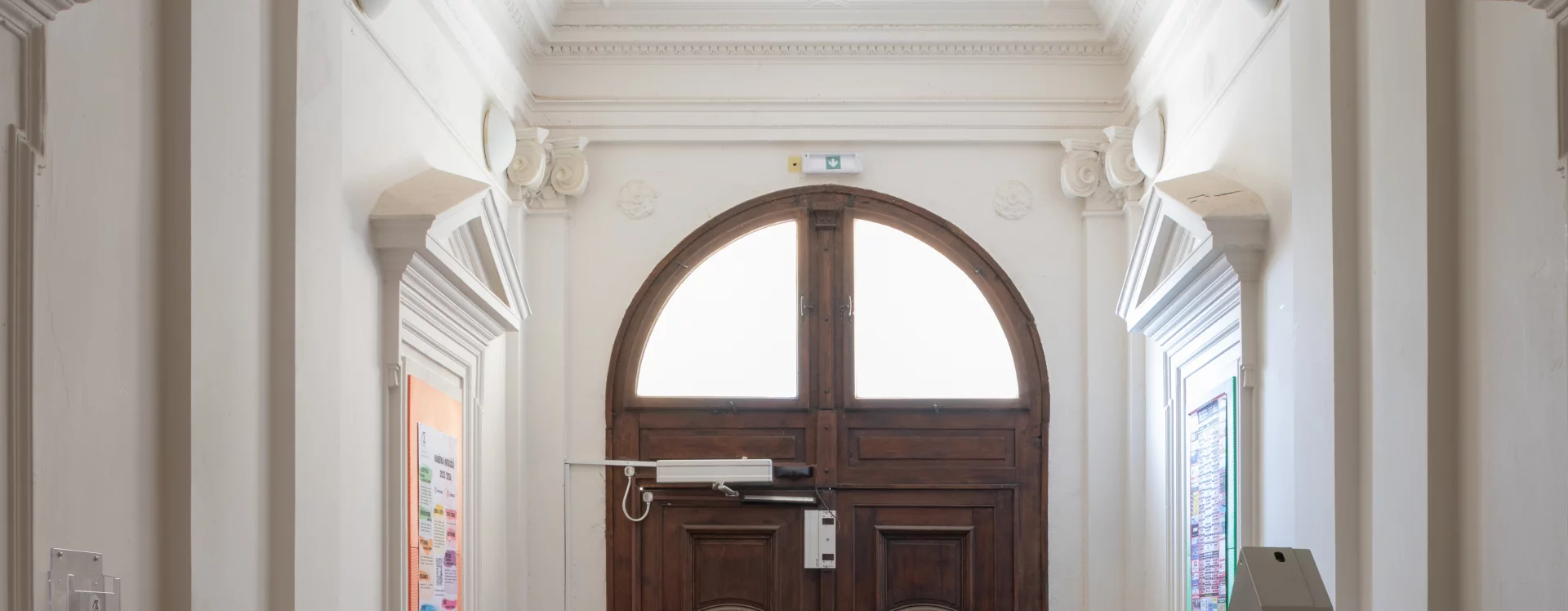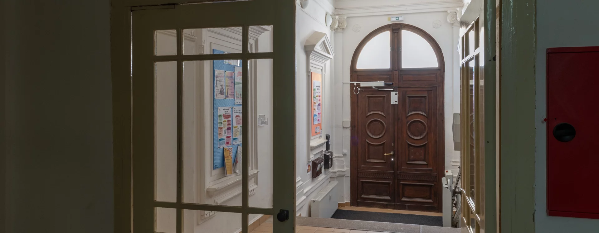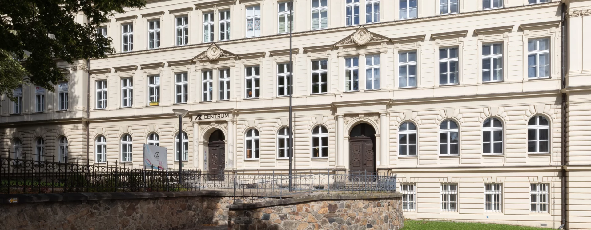 A grandly designed two-storey building was erected, which the architect sited on the open space of Rubeš Square, at the point where Budoucnost Park begins. To emphasize the importance of the building as an educational institution, he chose the Neo-Renaissance style for its decoration—which was then a well-established artistic form commonly used for schools, museums, theatres and scientific institutes, evoking the Renaissance as a period of exceptional cultural development, advanced learning, and knowledge. Kheil highlighted this concept through additional decoration to the facade. Above the main entrances (the left leading to the girls’ school and the right to the boys’ school), he placed busts of the eminent Czech educators Jan Amos Comenius and his modern-day successor Gustav Adolf Lindner. Both were created by Karel Vlačiha (1850–1932), a Prague-based sculptor, stucco artist, and highly prolific restorer.