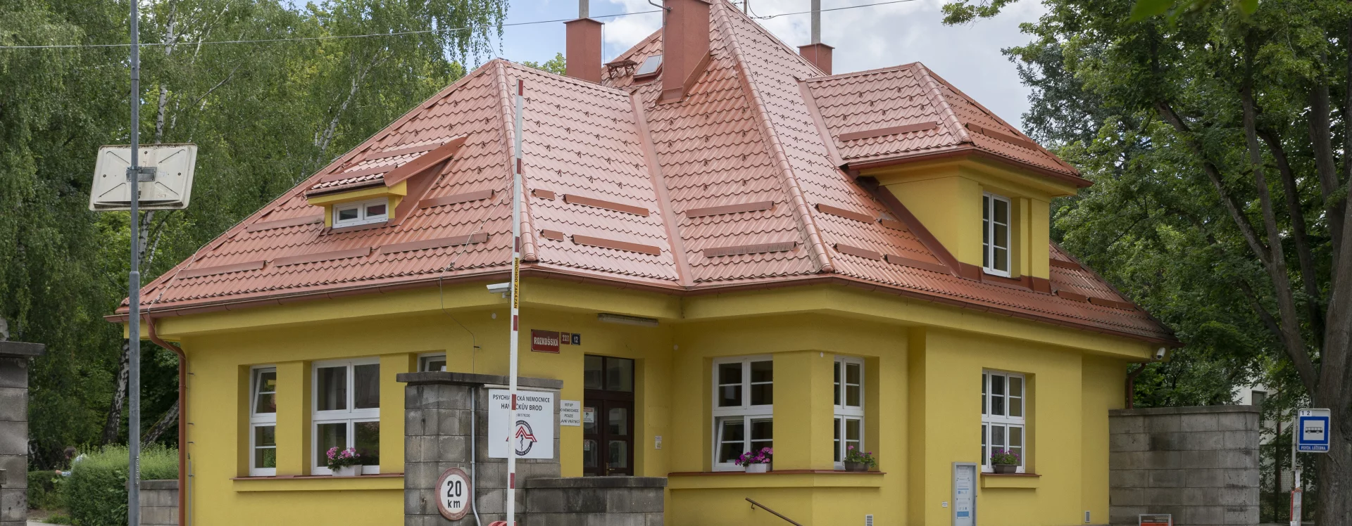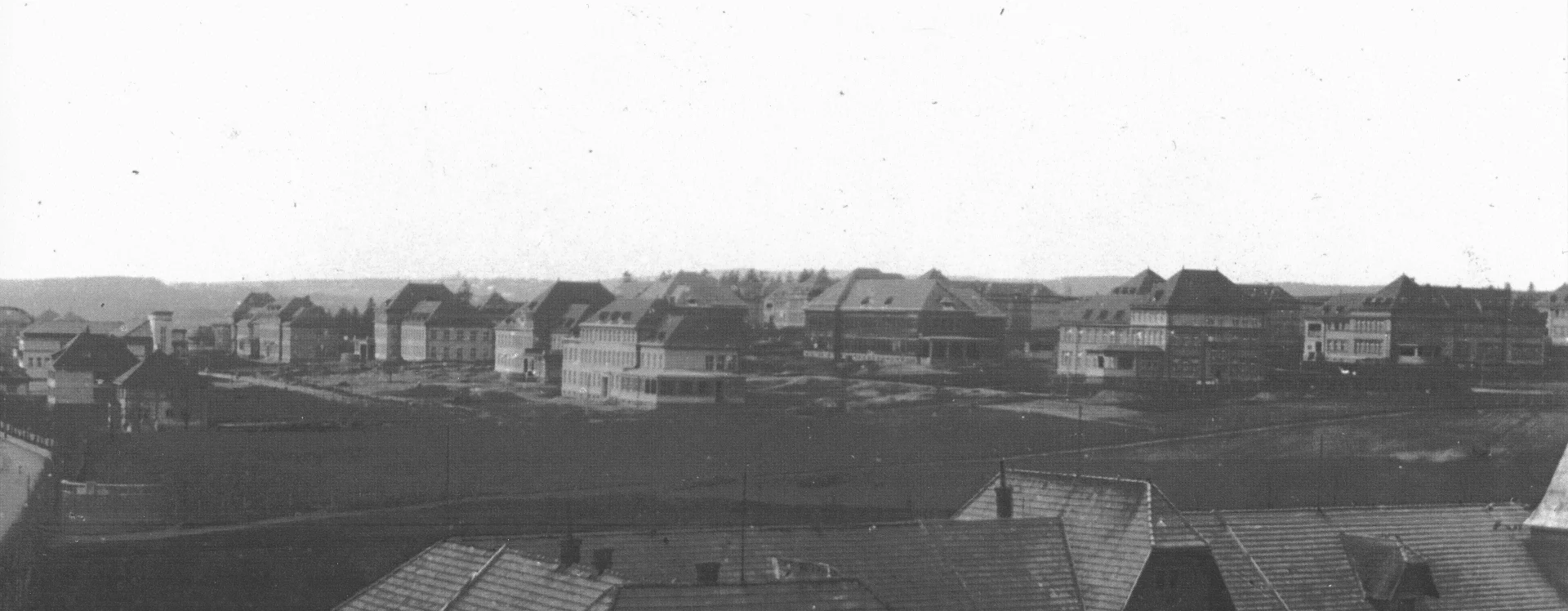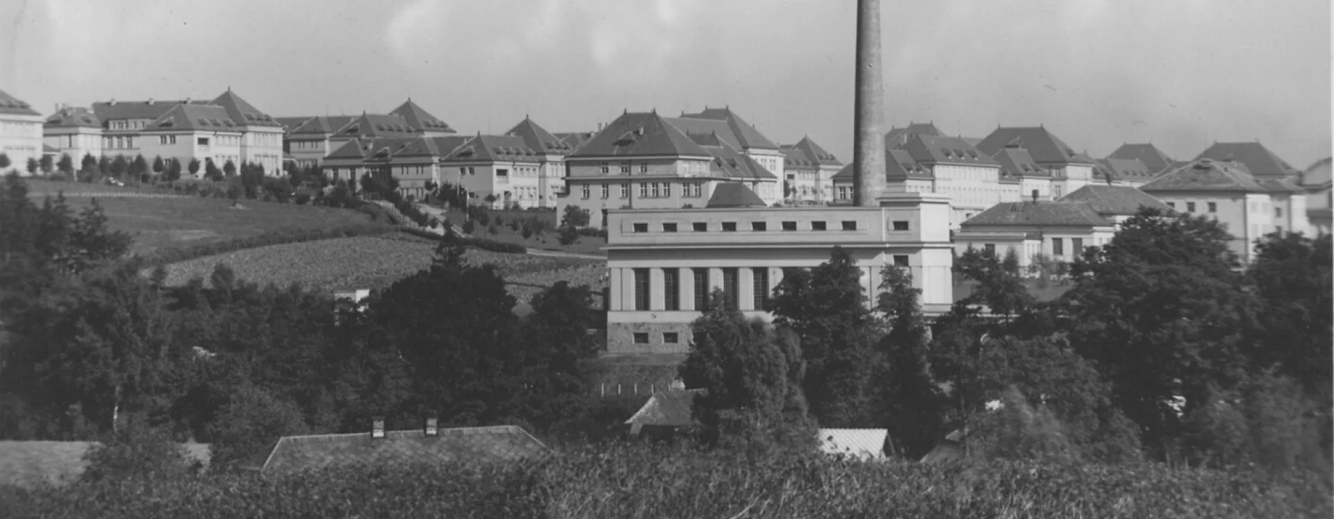 Work on the entire complex, deliberately separated from the surrounding urban developments, began in 1920. The first structures to be built were the service buildings, gradually followed by the remaining facilities. Some of the older, inadequate buildings—such as the kitchen and the gatehouse—were rebuilt according to new designs. A one-kilometre railway siding branching from the main Prague–Znojmo line was also constructed “to facilitate and reduce the cost of transporting wagonloads of materials required both for the construction of the institution and for its future operation.”