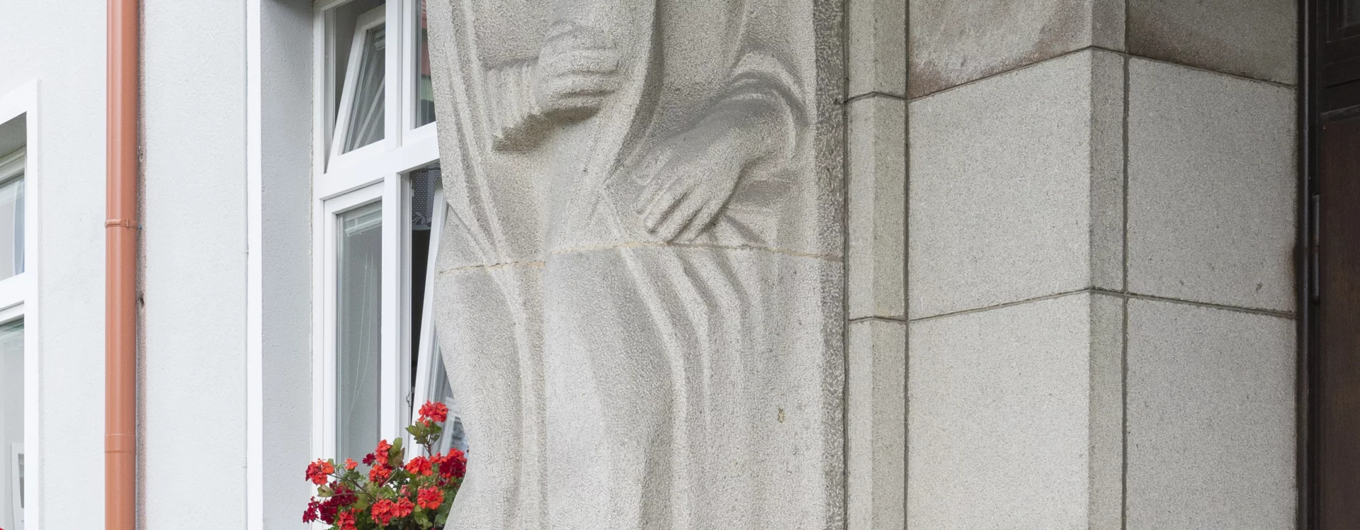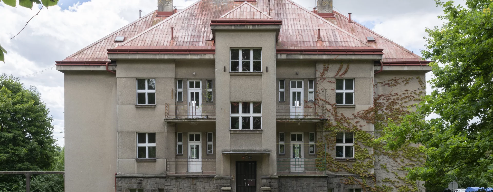 The Brod complex was to be built according to the “pavilion system”, characterized by logical organization and clarity. The buildings integrated with gardens while landscaped greenery was intended to give the institution an overall pleasant and harmonious appearance. Wallenfels arranged the buildings according to a simple, rational system. He visually separated the patient wards—designed as large residential houses—from the more austere service buildings that ensured the running of the institution. Along Rozkošská street, Wallenfels positioned the facilities responsible for the daily functioning of the complex, which he referred to as utility or service buildings. These included the kitchen, laundry, garages and the boiler house. He placed the administrative building—the only structure in the complex with sculptural decoration, designed by the eminent Czech sculptor Jan Lauda (1898–1959)—directly opposite the main entrance.
