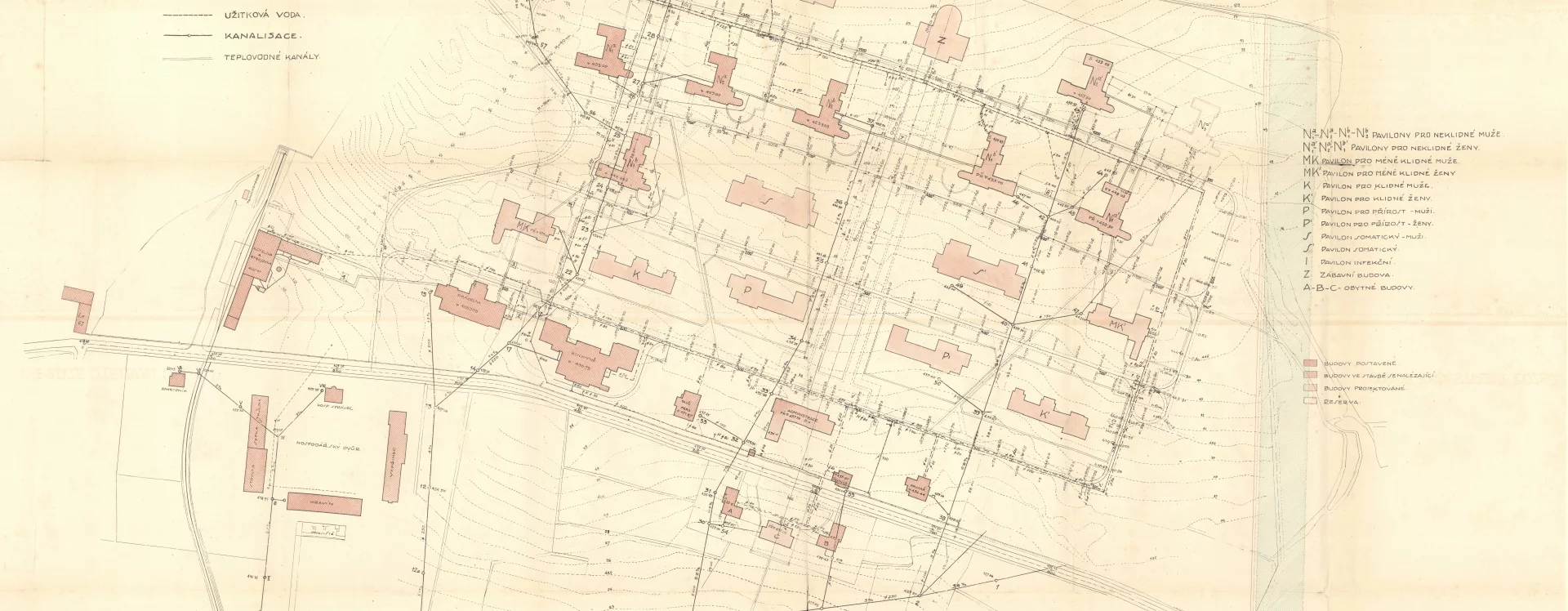 After eight years of construction, the institution was ready to start admitting patients. It was officially opened on 21 May 1928, while building work—originally budgeted at 55 million crowns—continued for another six years. The complex, covering an area of 43 hectares, was officially completed in 1934. Some of the originally planned pavilions were never realized, a decision which undoubtedly resulted from the austerity measures brought about not only by the height of the economic crisis but, above all, by the growing threat posed by Adolf Hitler’s rise to power and the consequent need to redirect substantial state funds towards the defence of the country against possible aggression.