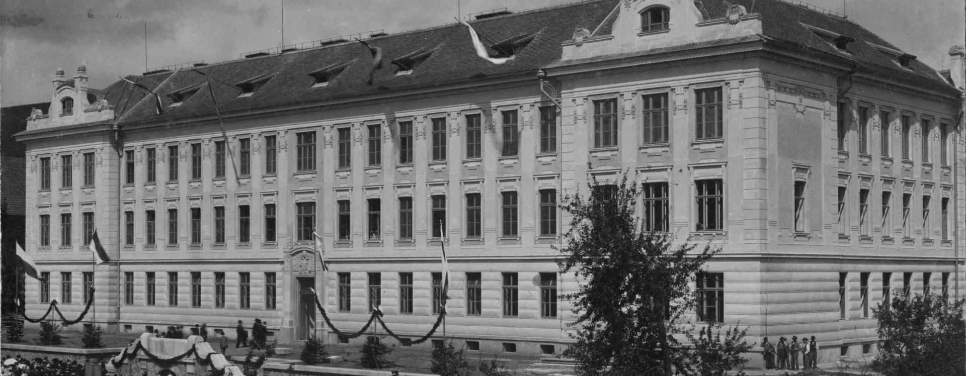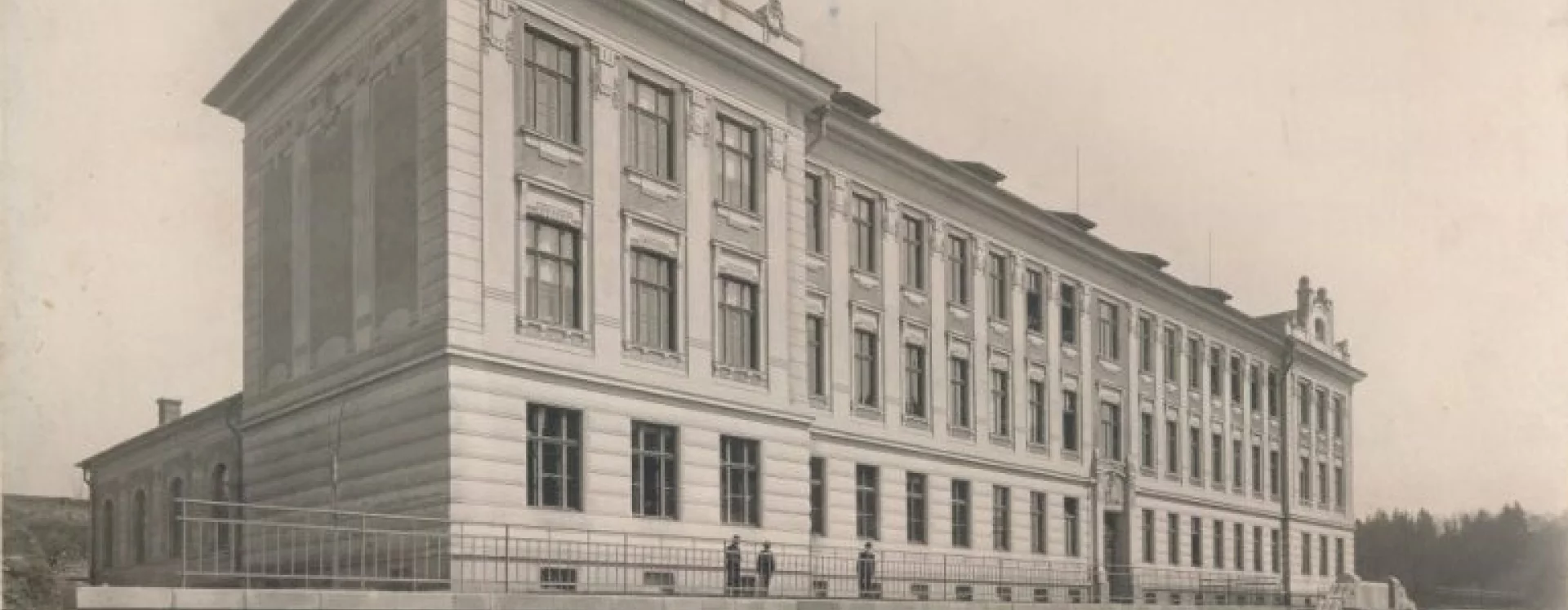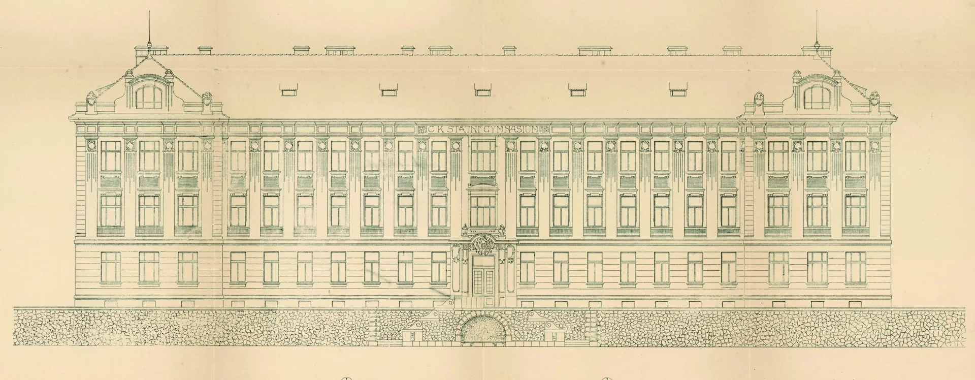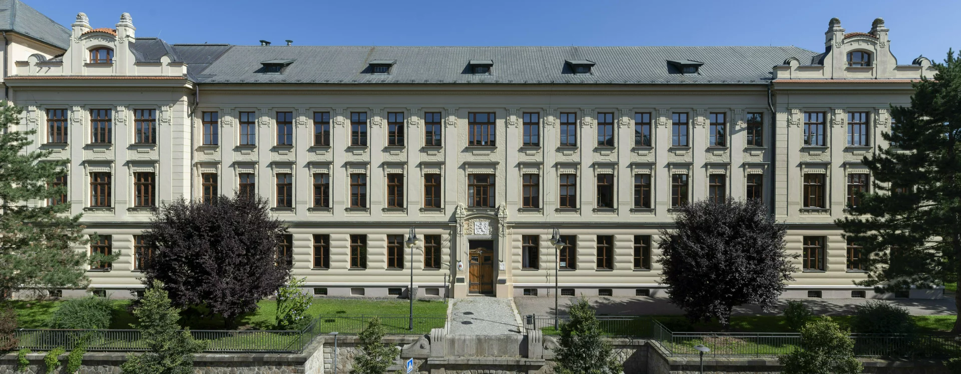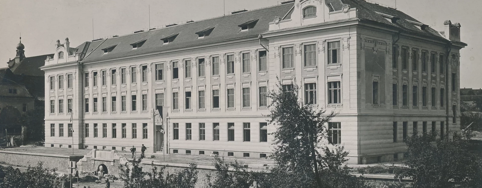 At the beginning of the 20th century, a new secondary school was built on the site of the former monastery garden, which also gave rise to a new street named “Školní” (School) after the exclusive purpose of the local buildings. The secondary (Latin) school was founded in Německý Brod in 1735 and occupied several different buildings over the course of its existence. In 1897, negotiations began between the town and the Ministry of Culture and National Education concerning the construction of a new school. The site selected was the former monastery garden, extending from the monastery towards the Church of the Holy Trinity. The construction department of the imperial-royal governor’s office in Prague was commissioned to draw up the plans. The design for the new secondary school was created in 1905 by the then building councillor Ludvík Lábler. The architect, whose work was largely rooted in historicist styles, designed a three-storey building with a small basement on an L-shaped plan. A gym hall, added to the western end of the north façade, completed the layout in a U-shape. The design blends historicist elements with Art Nouveau motifs. The rusticated ground floor band, tall pilaster order framing the windows, monumental entrance portal, window jambs, accentuated risalits with gables, and the heavy cornice all reflect the Neo-Renaissance style, while the stucco decoration shows the influence of the emerging Art Nouveau. Nevertheless, the work of the renowned architect and conservationist met with the disapproval of the local imperial-royal conservator, Zdeněk Wirth, who lamented the loss of the monastery garden and the disruption of the town’s overall silhouette caused by the oversized structure.