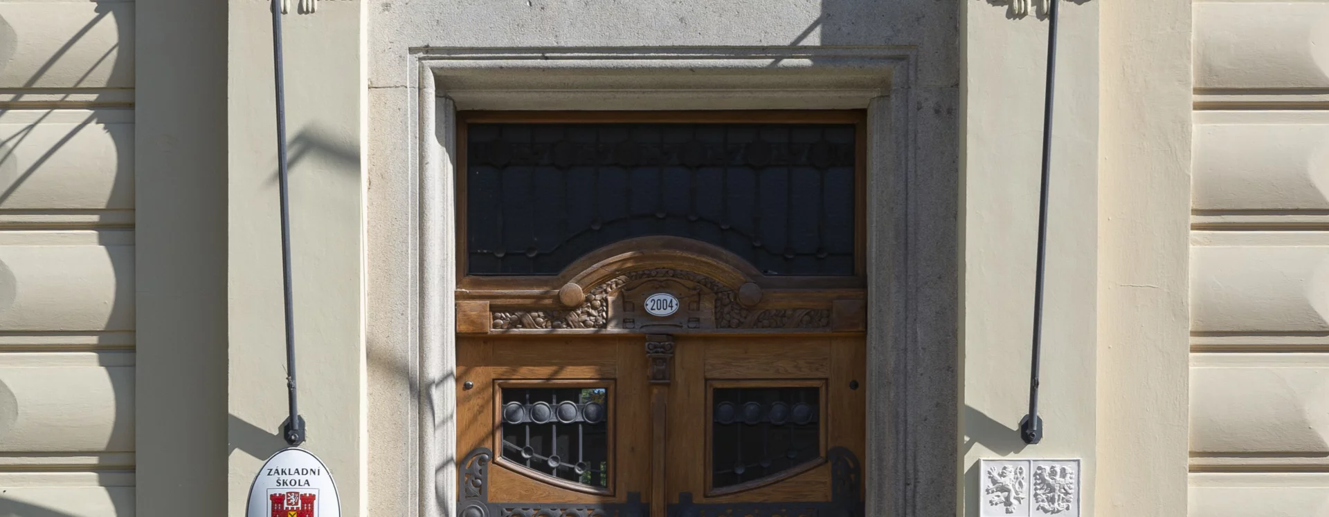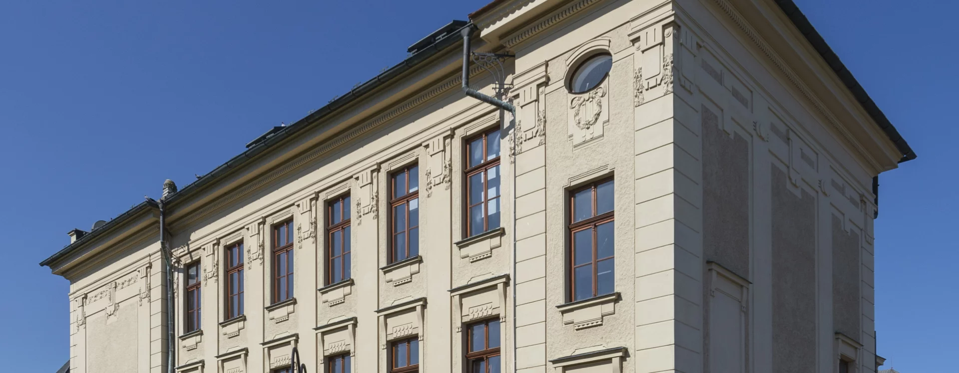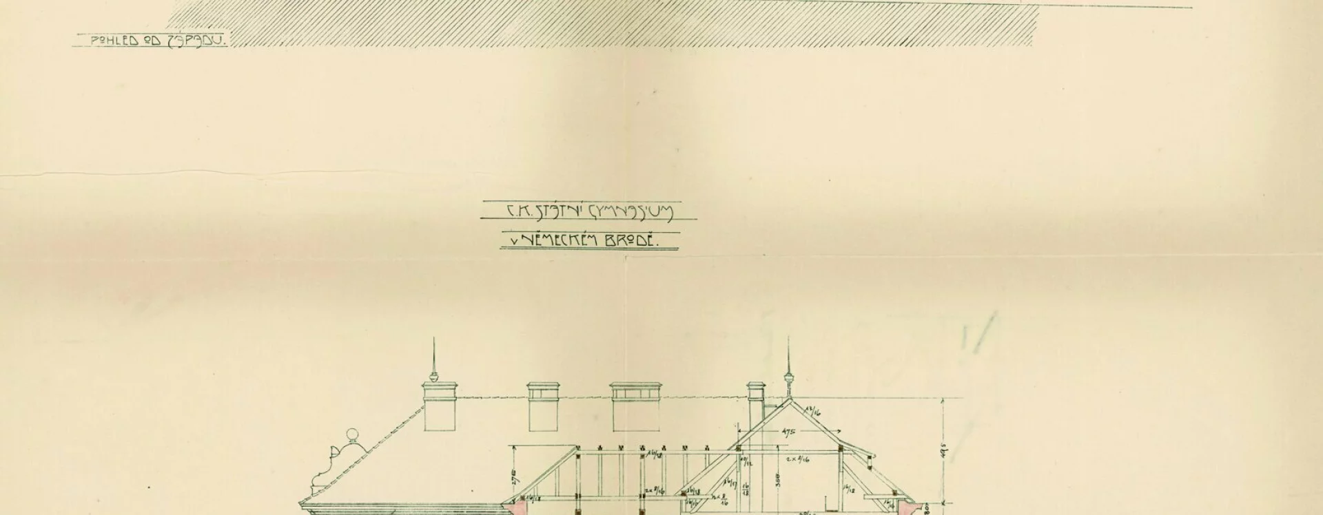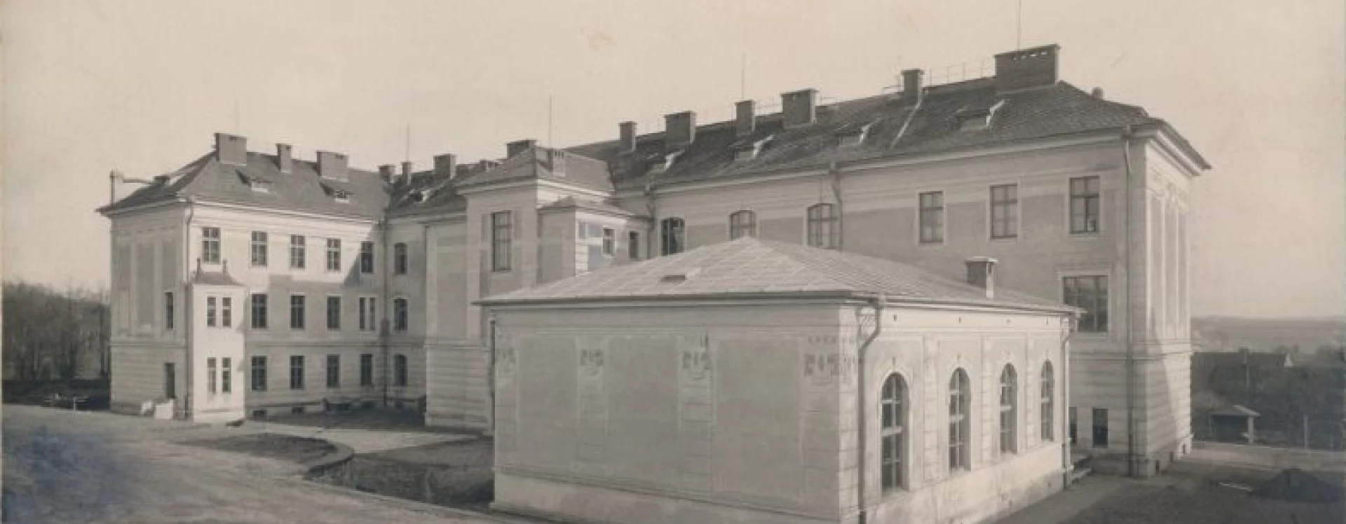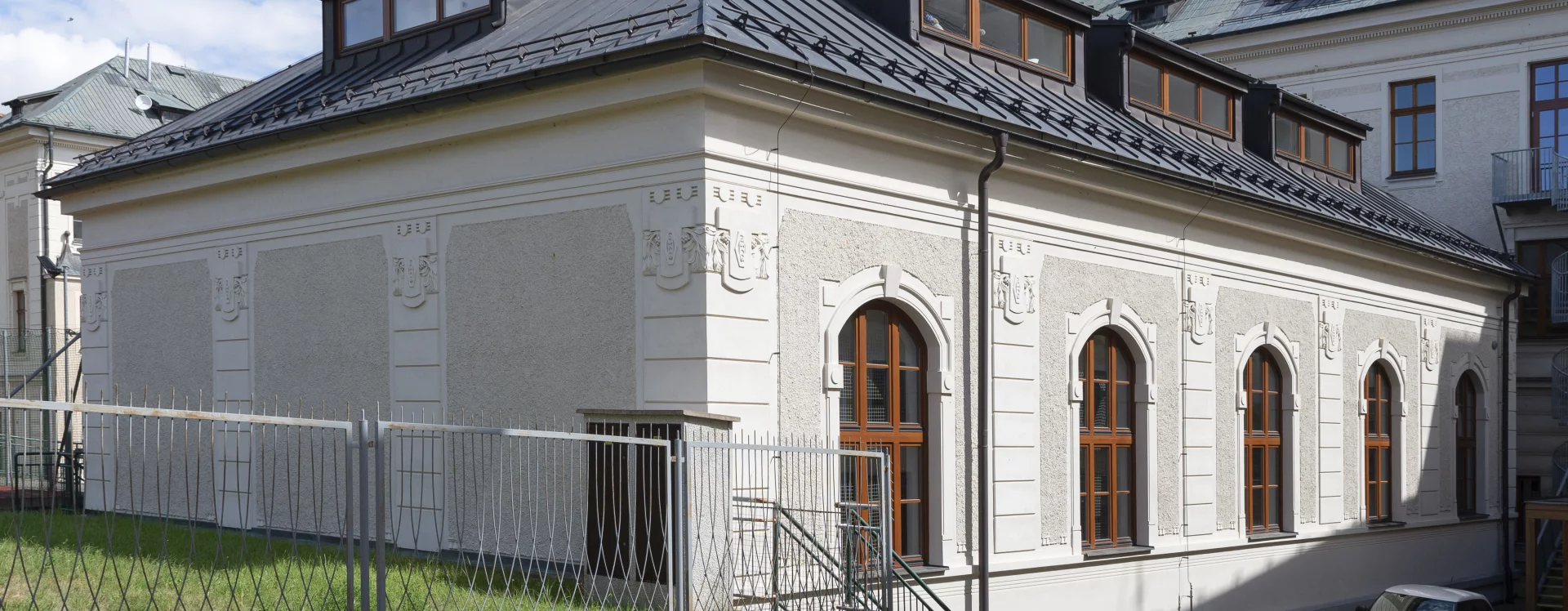 At the beginning of the 20th century, a new secondary school was built on the site of the former monastery garden, which also gave rise to a new street named “Školní” (School) after the exclusive purpose of the local buildings. The secondary (Latin) school was founded in Německý Brod in 1735 and occupied several different buildings over the course of its existence. In 1897, negotiations began between the town and the Ministry of Culture and National Education concerning the construction of a new school. The site selected was the former monastery garden, extending from the monastery towards the Church of the Holy Trinity. The construction department of the imperial-royal governor’s office in Prague was commissioned to draw up the plans. The design for the new secondary school was created in 1905 by the then building councillor Ludvík Lábler. The architect, whose work was largely rooted in historicist styles, designed a three-storey building with a small basement on an L-shaped plan. A gym hall, added to the western end of the north façade, completed the layout in a U-shape. The design blends historicist elements with Art Nouveau motifs. The rusticated ground floor band, tall pilaster order framing the windows, monumental entrance portal, window jambs, accentuated risalits with gables, and the heavy cornice all reflect the Neo-Renaissance style, while the stucco decoration shows the influence of the emerging Art Nouveau. Nevertheless, the work of the renowned architect and conservationist met with the disapproval of the local imperial-royal conservator, Zdeněk Wirth, who lamented the loss of the monastery garden and the disruption of the town’s overall silhouette caused by the oversized structure.