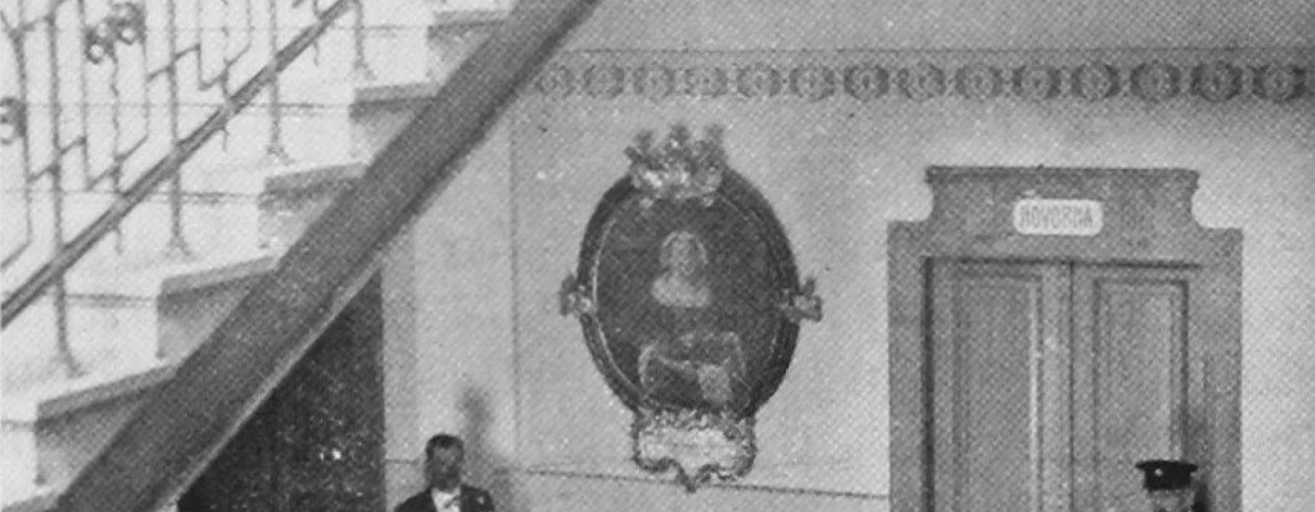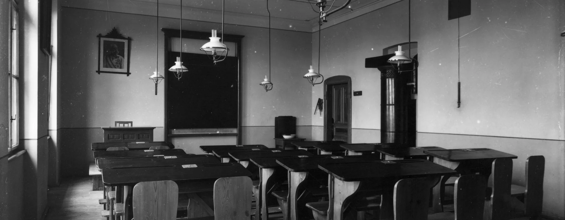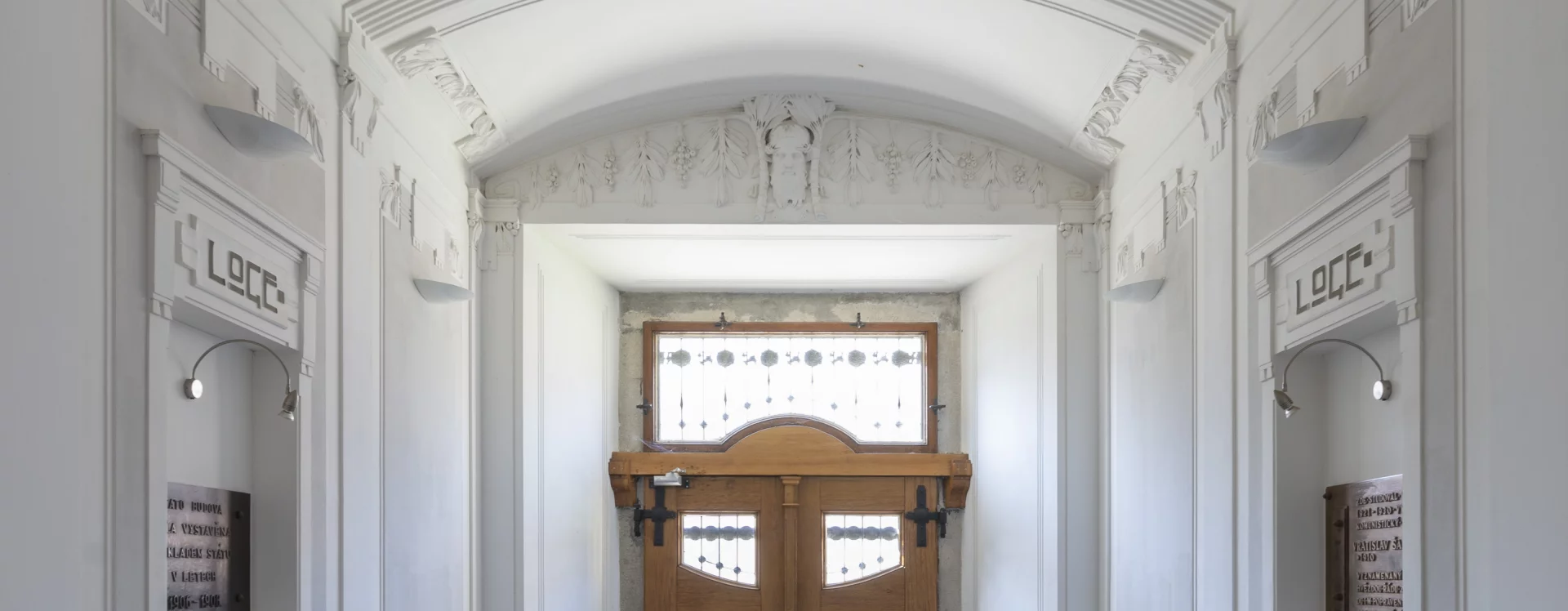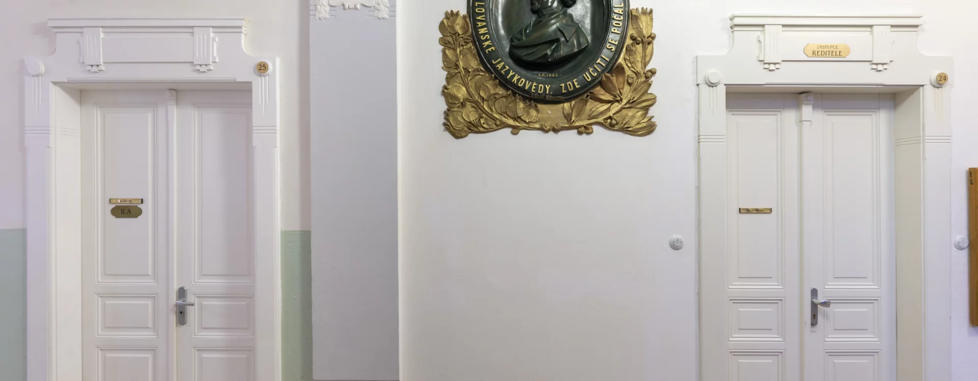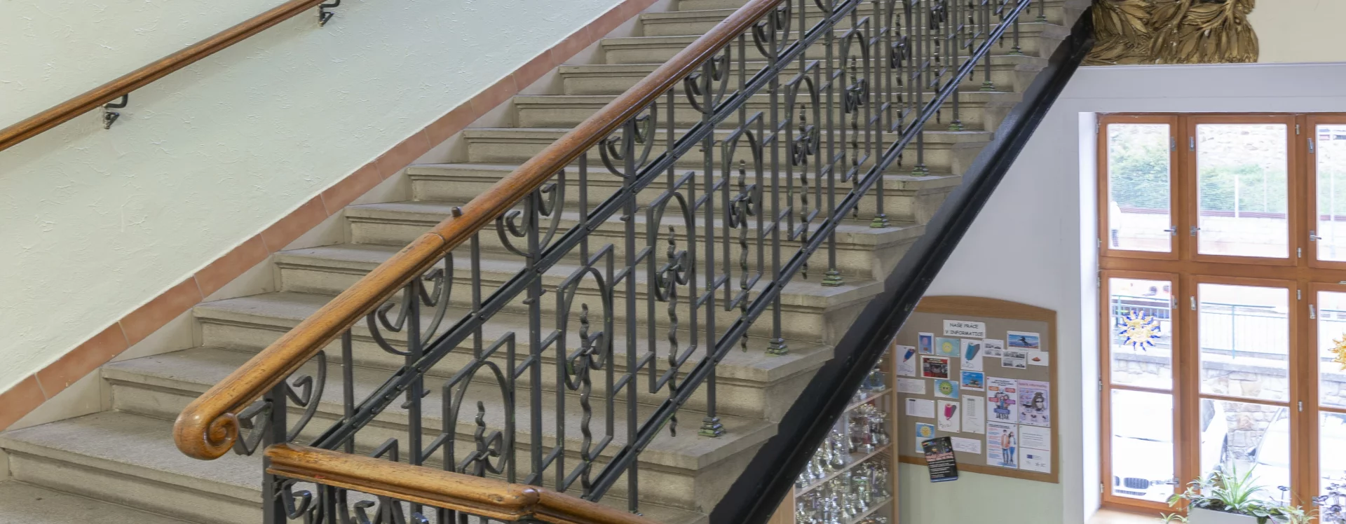 At the beginning of the 20th century, a new secondary school was built on the site of the former monastery garden, which also gave rise to a new street named “Školní” (School) after the exclusive purpose of the local buildings. The secondary (Latin) school was founded in Německý Brod in 1735 and occupied several different buildings over the course of its existence. In 1897, negotiations began between the town and the Ministry of Culture and National Education concerning the construction of a new school. The site selected was the former monastery garden, extending from the monastery towards the Church of the Holy Trinity. The construction department of the imperial-royal governor’s office in Prague was commissioned to draw up the plans. The design for the new secondary school was created in 1905 by the then building councillor Ludvík Lábler. The architect, whose work was largely rooted in historicist styles, designed a three-storey building with a small basement on an L-shaped plan. A gym hall, added to the western end of the north façade, completed the layout in a U-shape. The design blends historicist elements with Art Nouveau motifs. The rusticated ground floor band, tall pilaster order framing the windows, monumental entrance portal, window jambs, accentuated risalits with gables, and the heavy cornice all reflect the Neo-Renaissance style, while the stucco decoration shows the influence of the emerging Art Nouveau. Nevertheless, the work of the renowned architect and conservationist met with the disapproval of the local imperial-royal conservator, Zdeněk Wirth, who lamented the loss of the monastery garden and the disruption of the town’s overall silhouette caused by the oversized structure.