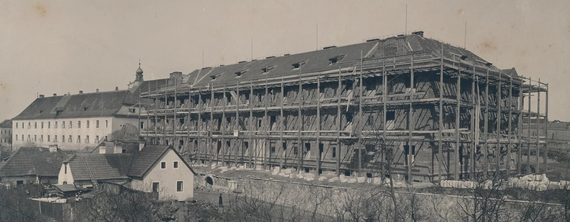 The construction of the building was entrusted to local builder Josef Šupich, whose company prepared the site and dug the foundations in 1906, carried out structural work the following year, and began work on the interior in 1908. The ceremonial opening took place in the still unfinished building on 25 August 1908. As the building stood at a considerable elevation above the newly created street, a stone terrace was constructed to level the site, incorporating a fountain adorned with a mascaron.