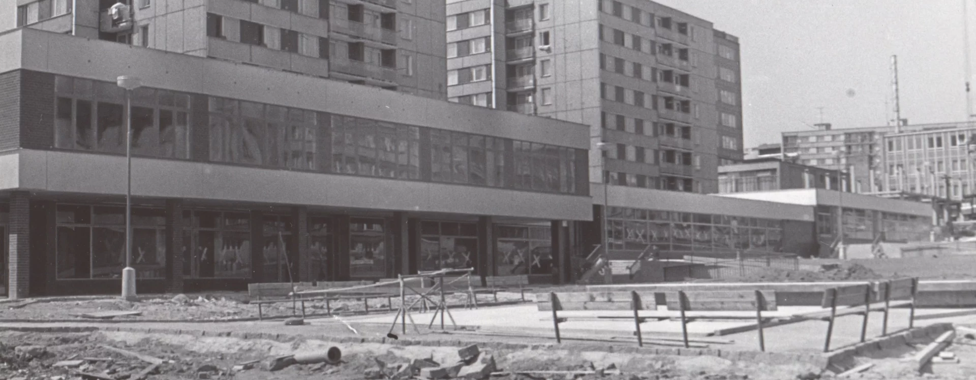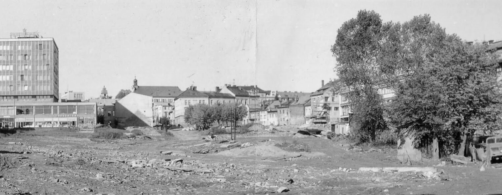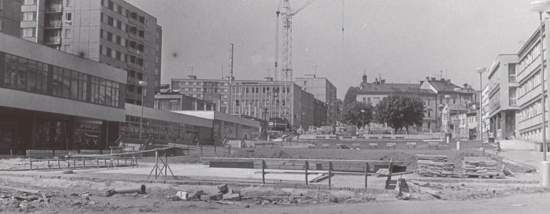 Ahead of construction, residential and industrial buildings on Smetana Square were demolished and some residents were relocated to new homes on Klement Gottwald Square (now the corner of Jihlavská and Nádražní) and the Pražská housing estate, which was completed in 1971.