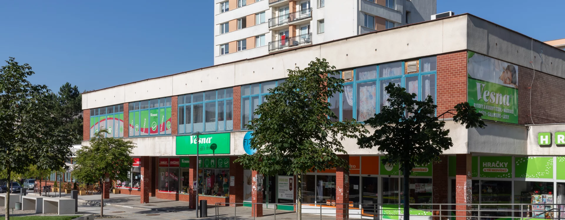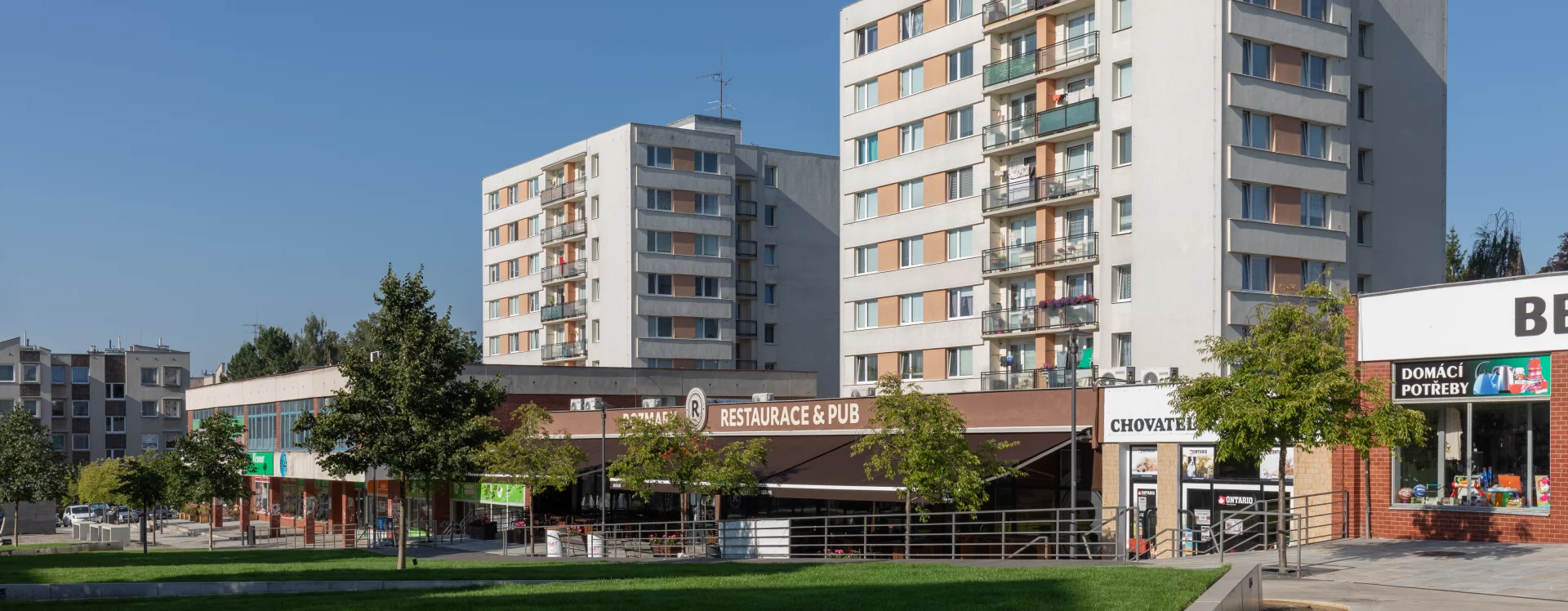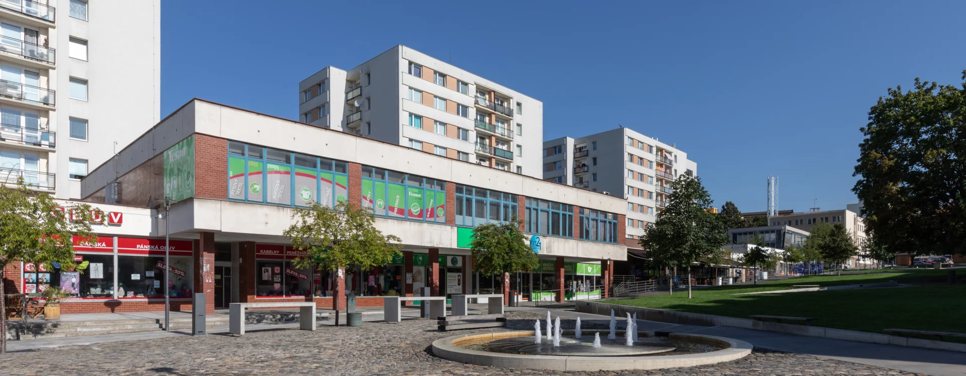 In the second stage, which began in 1978, both the main designer and the contractor changed: architect František Příborský took over as designer, while Pozemní stavby Pardubice became the contractor. The second-stage team abandoned Driml’s plan for three-point houses atop the shopping centre, opting instead for T06B prefabricated houses—typical in East Bohemia—for residential construction in the centre and upper part of the square. The exhibition and ceremonial hall were omitted and the telecommunications building was moved. The shopping centre, which opened in 1982, then closed off the western side of the square.