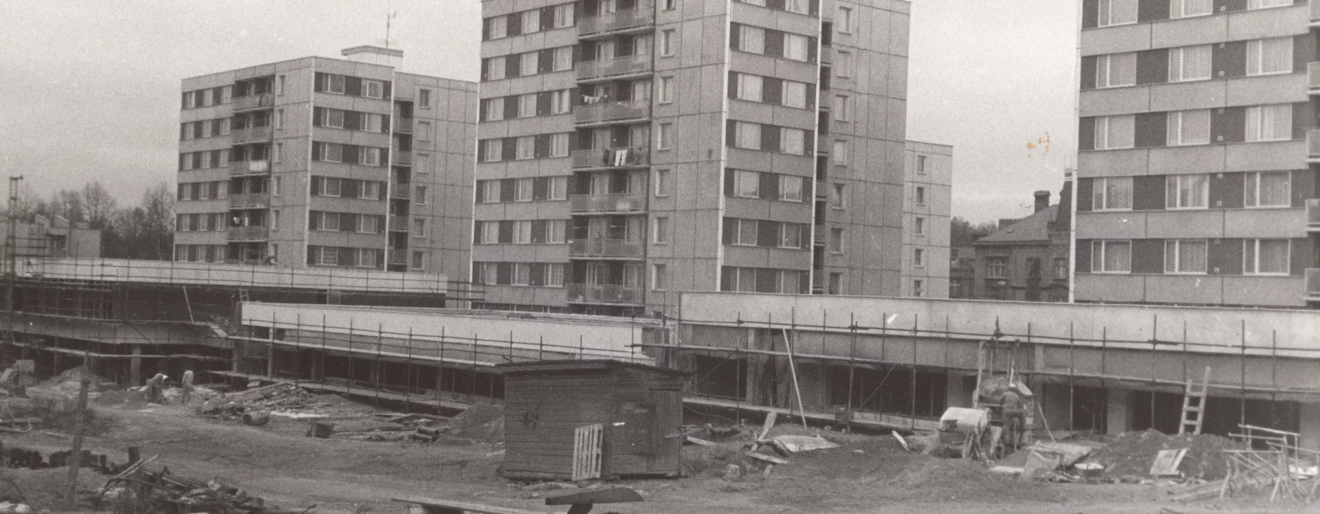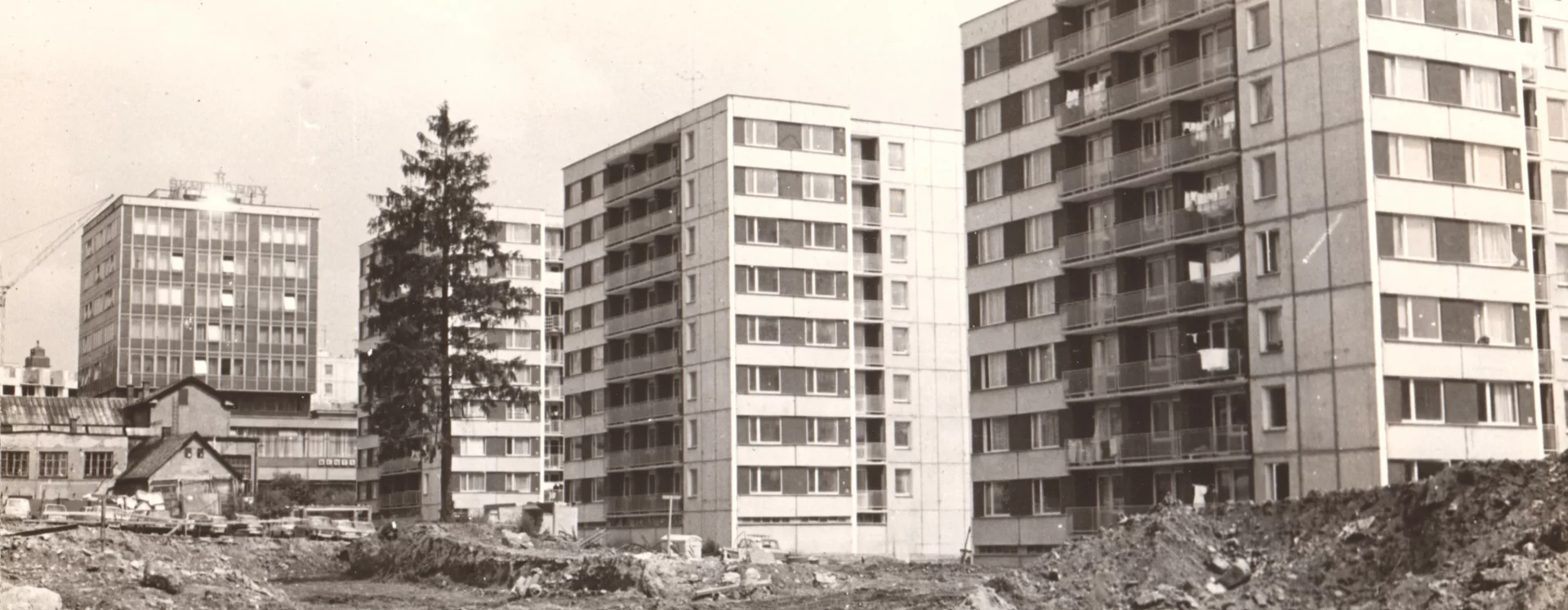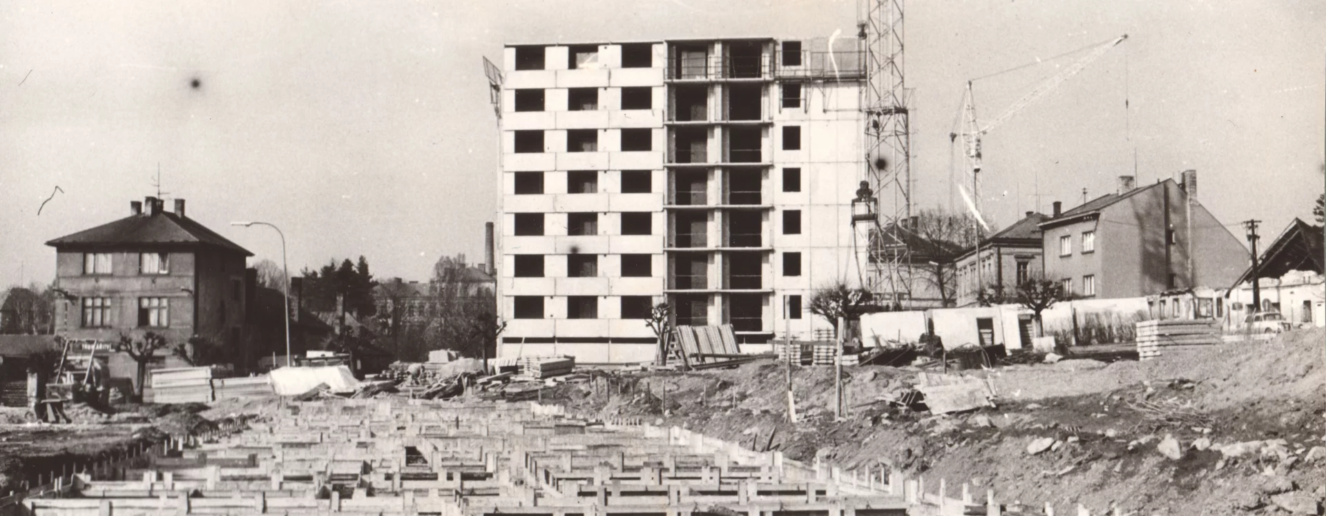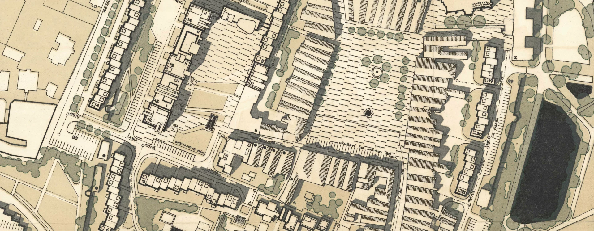 The urban design and construction were developed by Stavoprojekt Hradec Králové in a detailed zoning plan following a public tender. The competition was won by Pardubice architect Lubomír Driml, who became the project’s principal designer. The plan was drawn up in 1972 in accordance with an architectural-historical assessment by the State Institute for the Reconstruction of Historic Towns and Buildings in Prague. Driml’s project envisaged the construction of 688 new residential units divided into three separate blocks, a nursery school for 120 children, a crèche for 55 children, a shopping centre, a grocer’s, a restaurant, an exhibition and wedding hall, a telecommunications building, and 100 collective garages. The entire area was intended to be dominated by four point blocks on pedestals: three residential buildings atop the shopping centre pedestal, and a fourth building serving as the headquarters of the Škrobárny Starch Works industrial enterprise (HB-261).