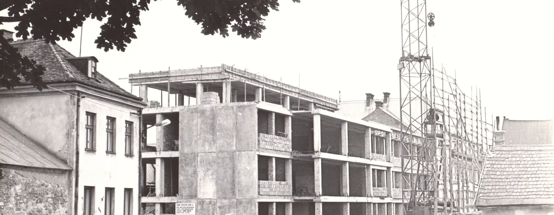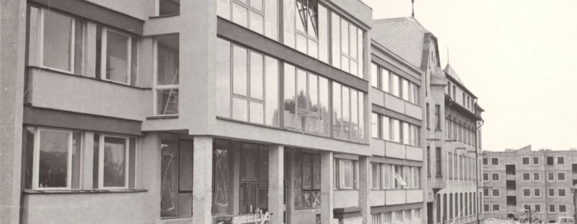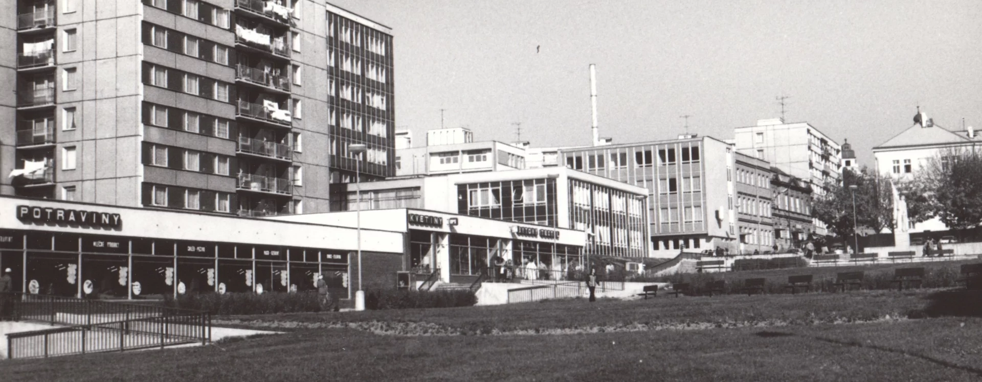 In the first stage, which began in 1973, four-storey buildings were constructed in the southern part of the designated area according to Driml’s design through cooperative construction; these now form V Rámech and Trčkova streets (HB-VP-SN1). A year later, an administrative building for the District Agricultural Administration, designed by the Pardubice branch of Agroprojekt (Mr Sobel), was built, which, together with the post office building, defined the eastern side of the new square.