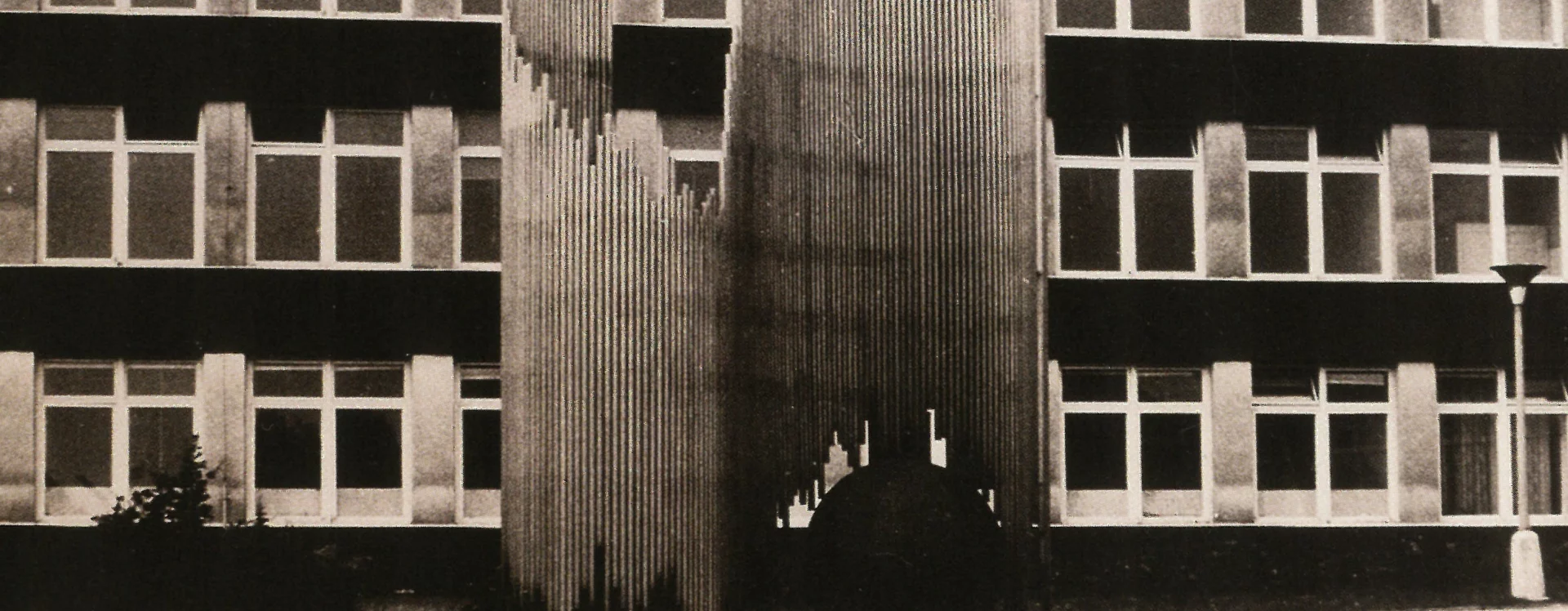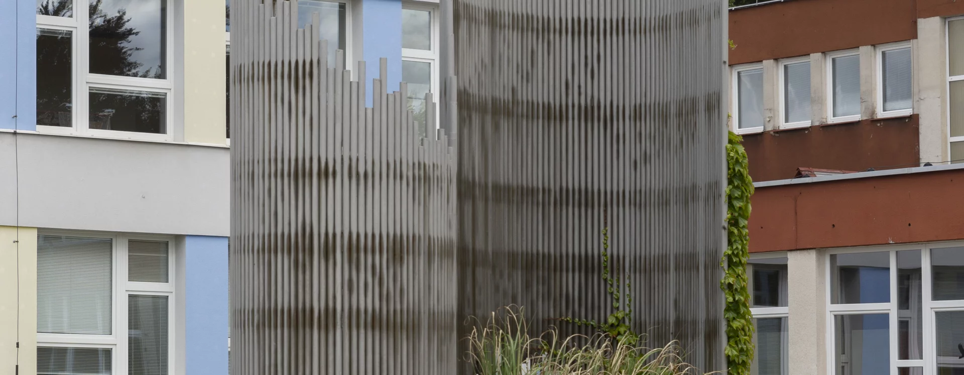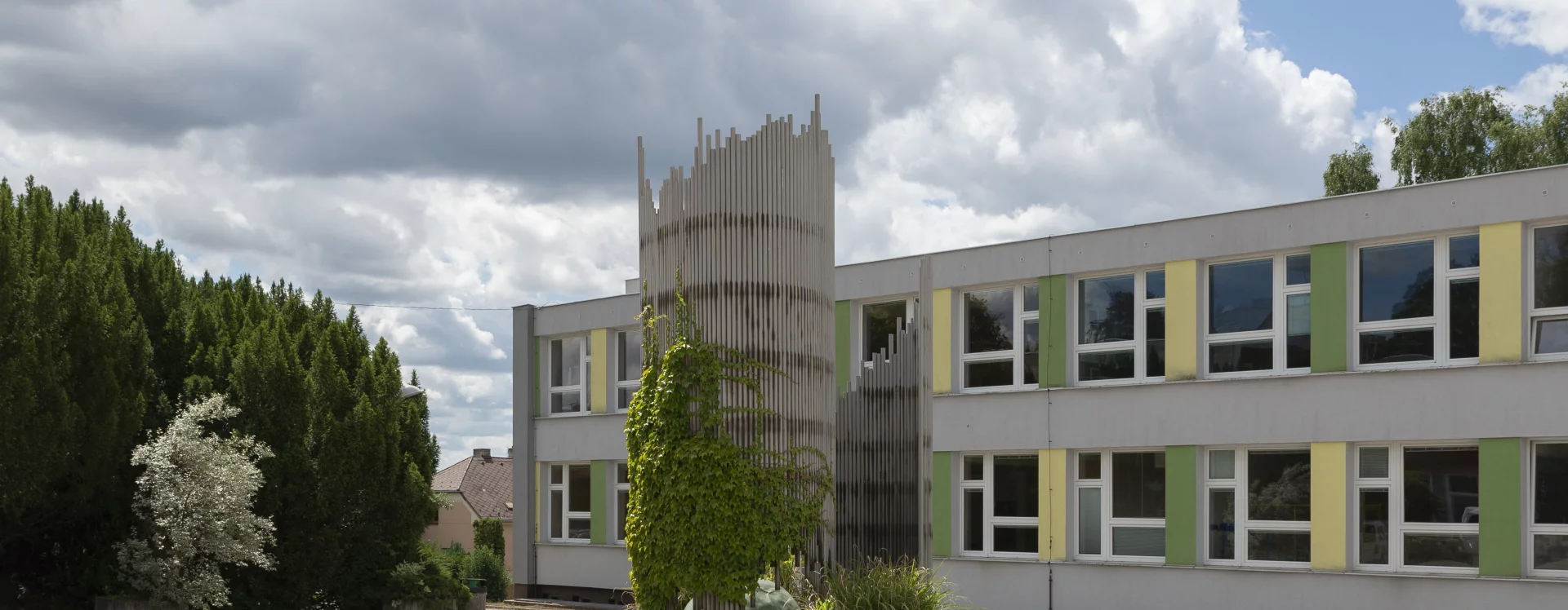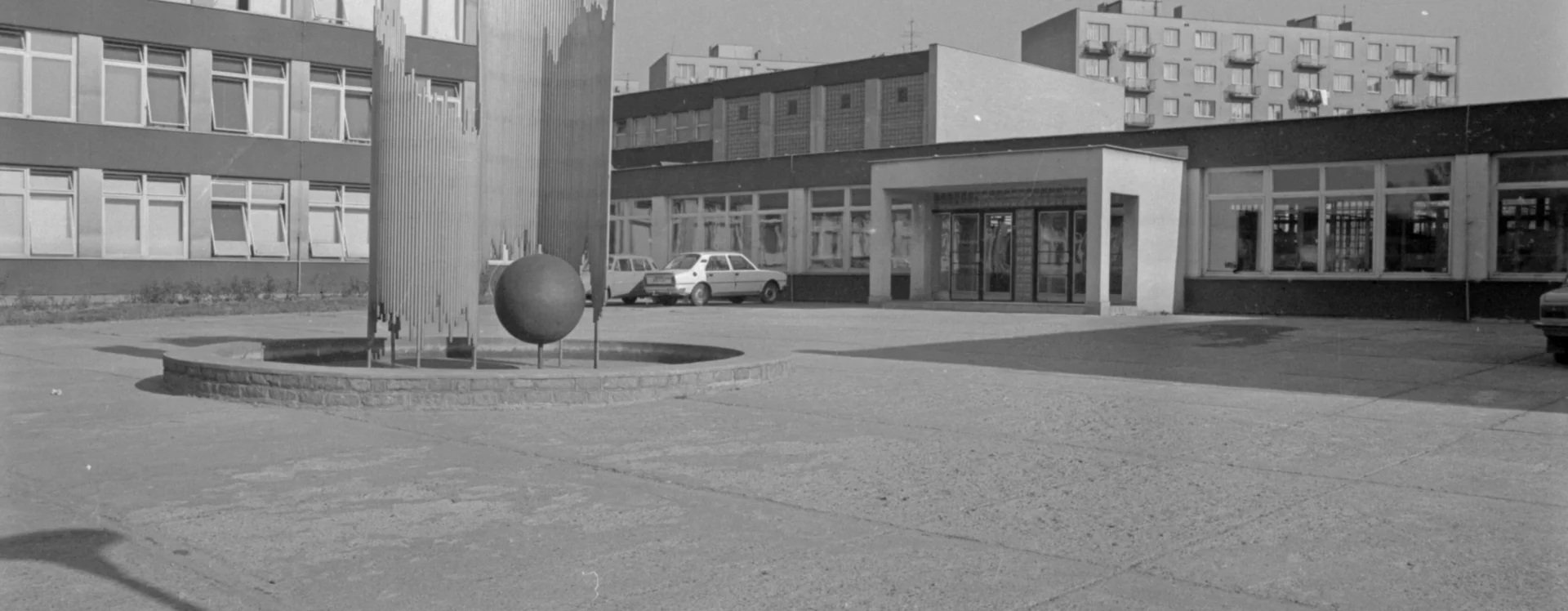 The pavilions were arranged around the central courtyard of the school, in the middle of which was a fountain by the Havlíčkův Brod sculptor and university teacher Karel Hyliš (1928–2024) and his friend, the architect Jiří Jirmus from the Stavoprojekt office in Jihlava. It was a large, technically demanding work of art called The Birth of an Idea. Encircling the sphere, formed from hammered copper-alloy sheets, are spiral walls composed of steel tubes of varying lengths, linked together by internal iron bands. The abstract sculpture does not close in on itself, but blends in with the surrounding space.