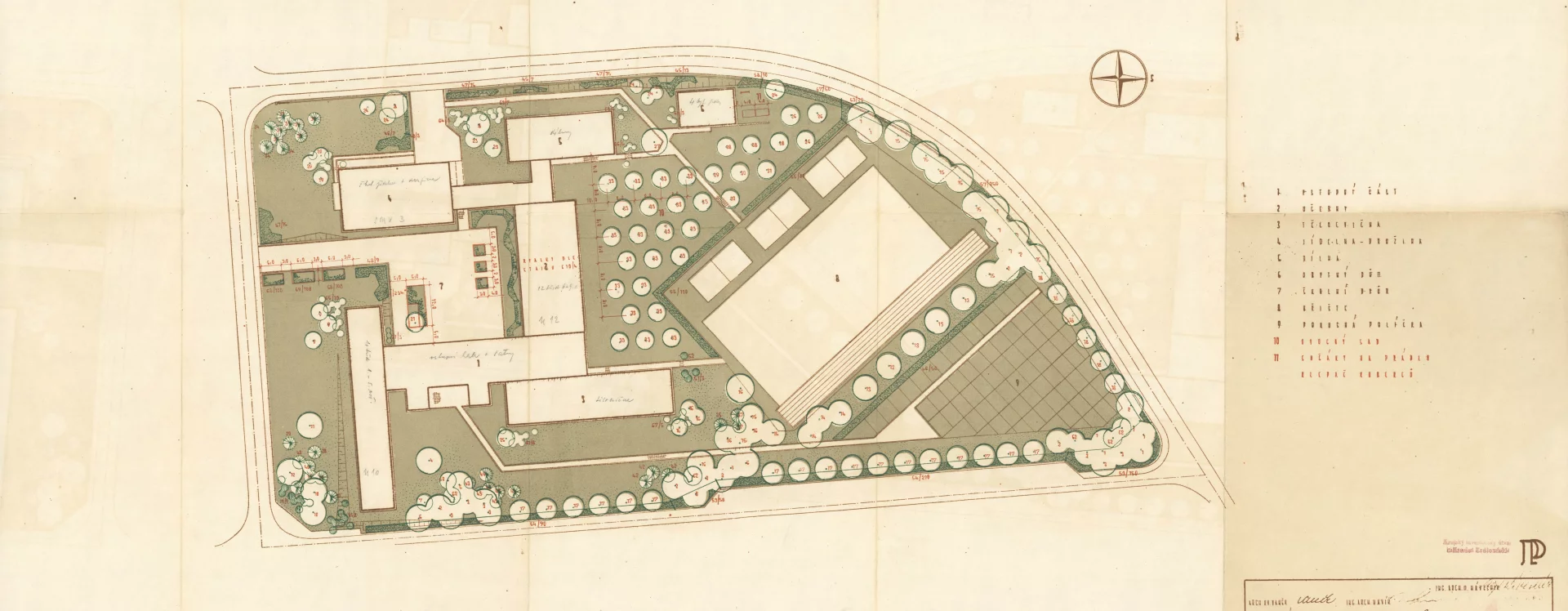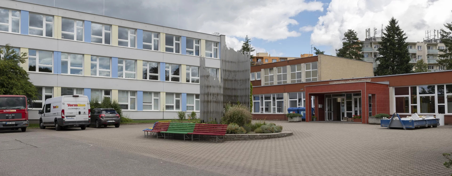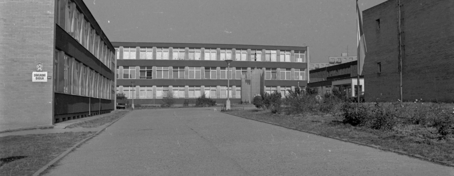 The extensive complex, which is a typical example of socialist architecture, was designed by the architect G. Havíř from the Pardubice branch of Stavoprojekt Hradec Králové. The five school pavilions were designed from a standardized modular reinforced concrete skeleton, infilled with bricks. The buildings’ moderate height—no more than three stories—gave the complex a pleasant character. Another advantage was the carefully planned spatial layout of the site, complemented by detailed landscaping that included fruit trees and a vegetable garden.