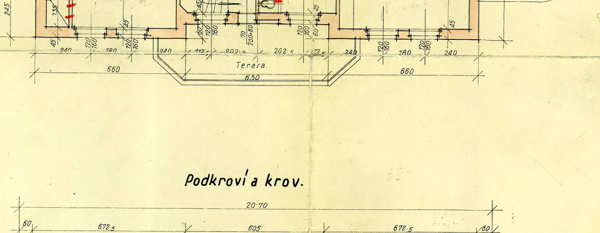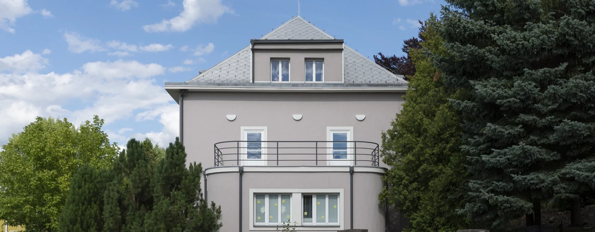 Three ground-floor sections project from the basic cubic mass of the villa, each differing in plan shape. The entrance risalit has a polygonal ground plan, the dining room curves in a semicircular form towards the terrace, while the conservatory features rounded corners. In all these areas, there were terraces on the first floor; the one above the dining room was later removed to enlarge the children’s room.