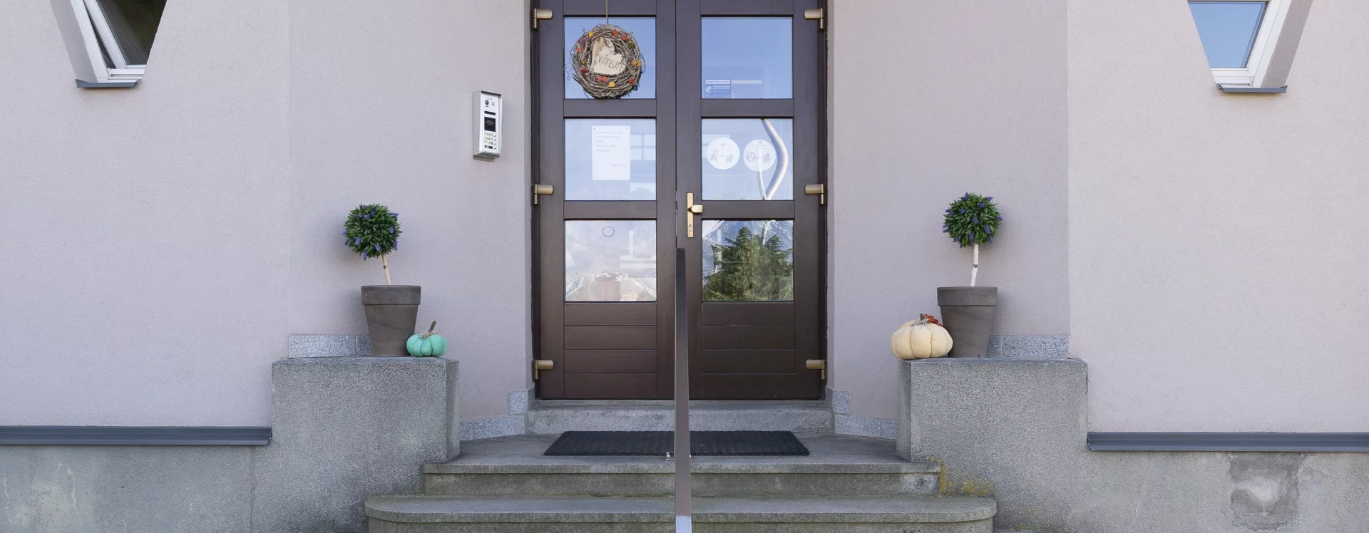 The facades are simple and unarticulated, with broad window and door surrounds providing them with a sense of depth and relief. The entrance risalit features atypically small, polygonal windows which, besides their aesthetic function, also prevent unwelcome views into the main entrance area.