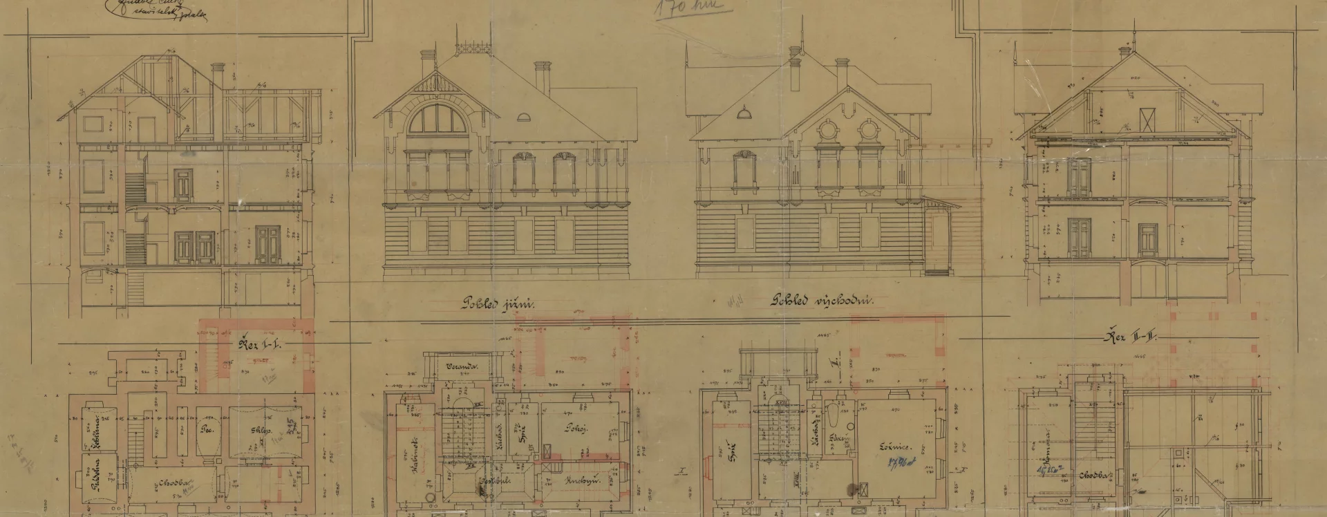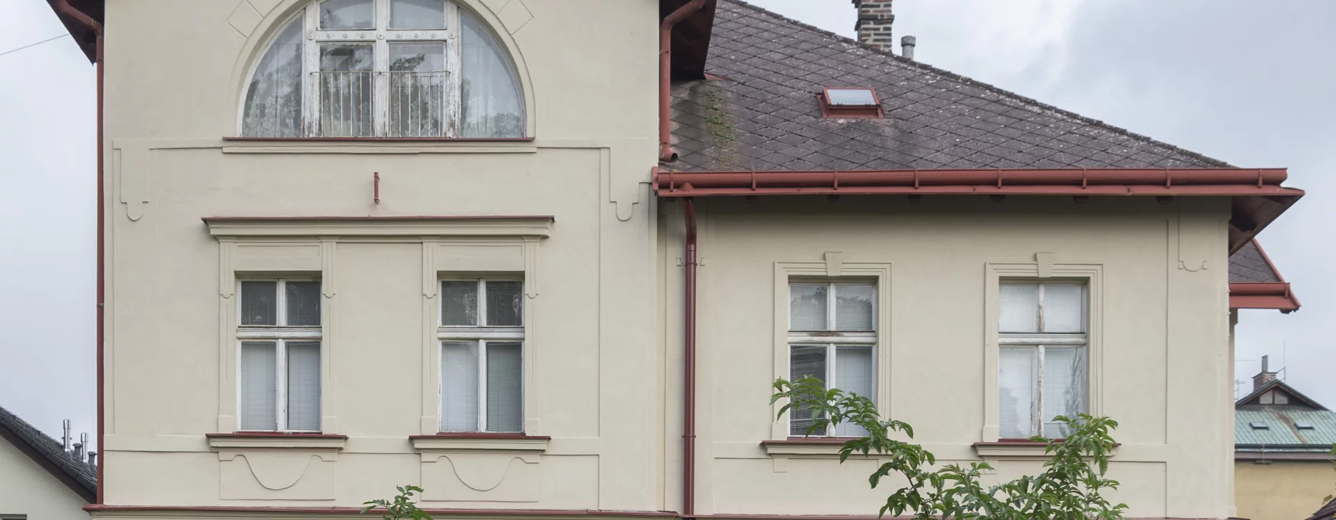 The villa was designed by the local construction firm of František and Otakar Liška. Traditional floor plans were combined with a restrained facade design, whose only distinctive feature was perhaps the lunette window in the raised section of the building facing the park below the hospital. The owner took advantage of the installation of the water mains for the hospital and had running water brought “to the laundry room, bathroom, hallway, and closets.”