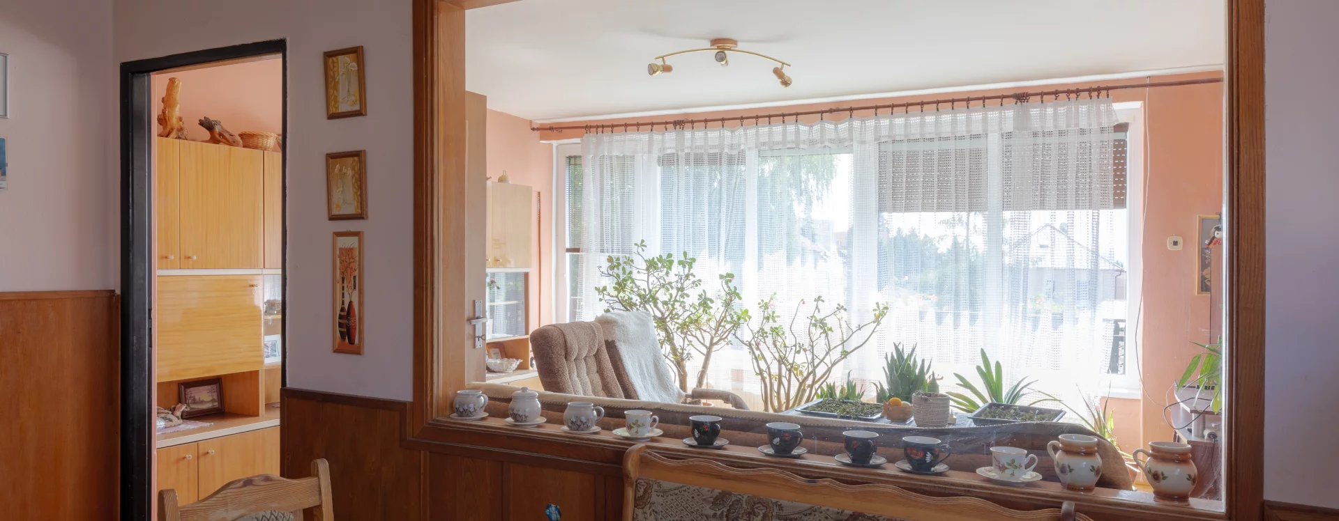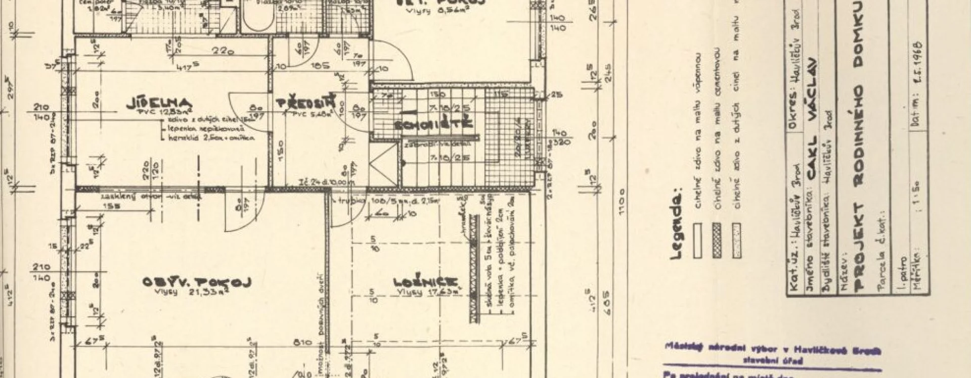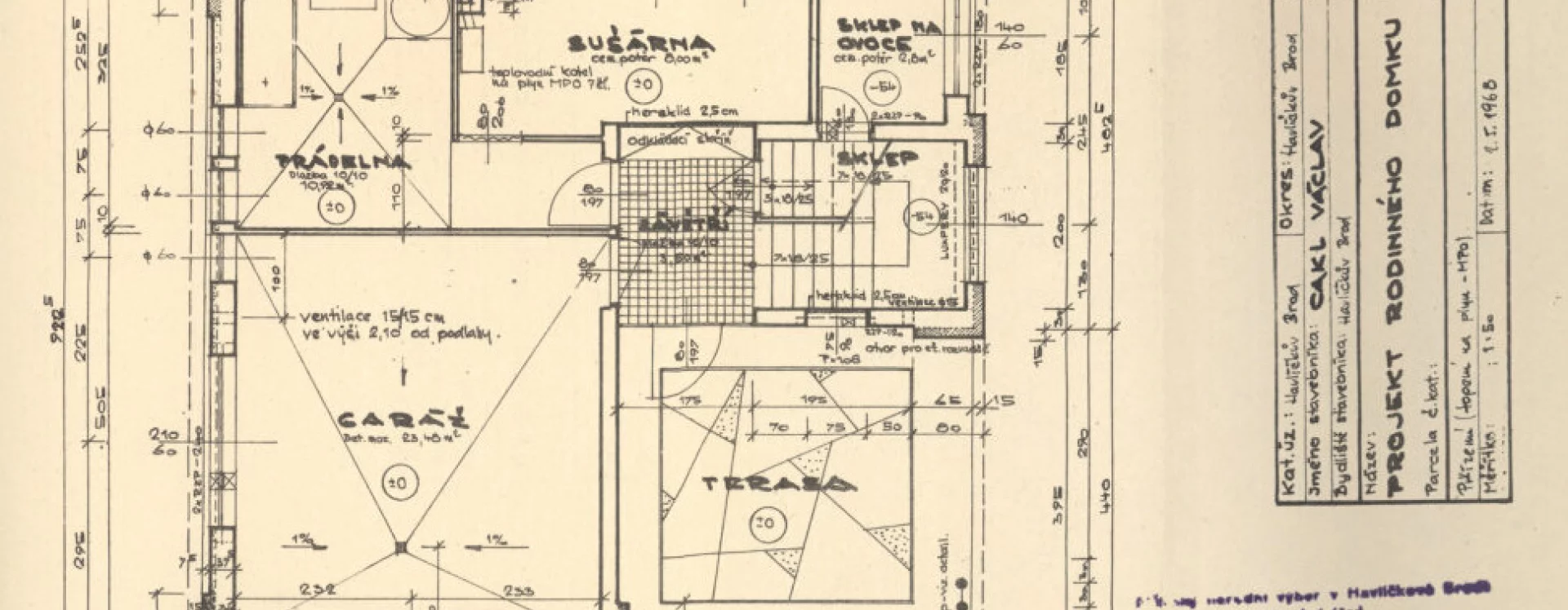 Between 1968 and 1970, the Cakl couple built a standardized detached house on a corner plot, now formed by the intersection of Práčat and Jeronýmova streets, according to a design by the Šumperk builder Josef Vaněk (1932–1999).