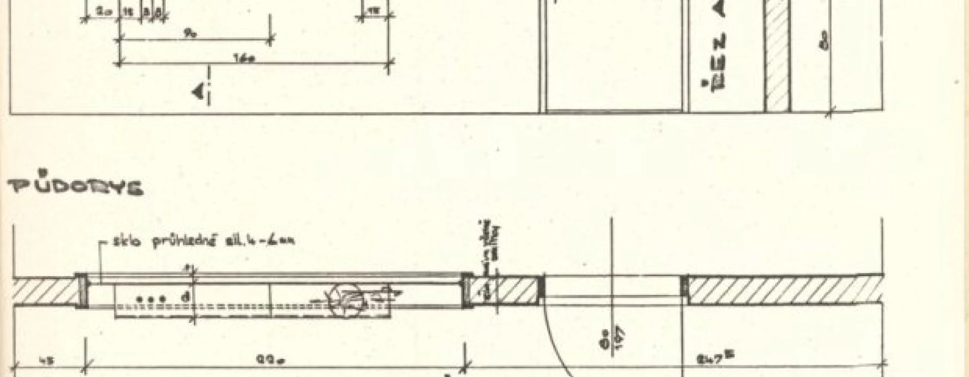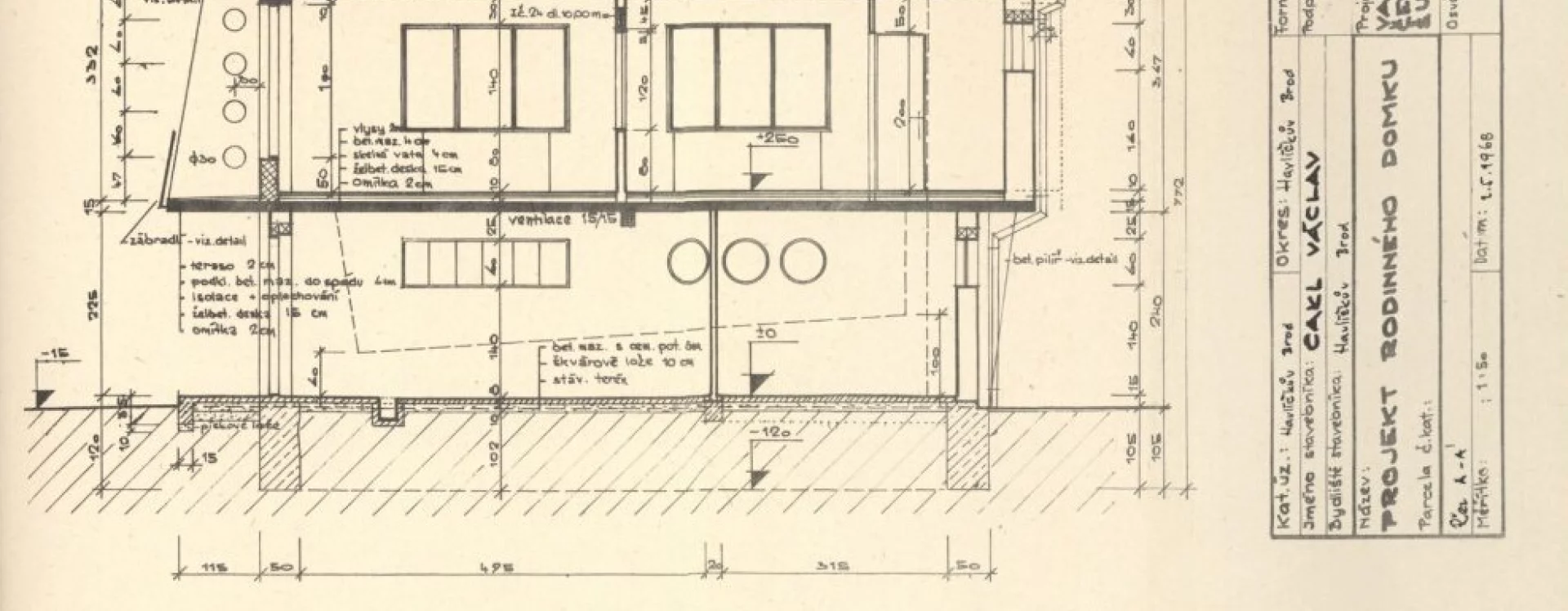 For 842 crowns (roughly the equivalent of one month’s salary), builders could purchase plans for a small two-storey house, the ground floor of which served as utility space (garage, boiler room, laundry room, drying room, fruit and potato cellar), and the first floor, accessible via a prefabricated staircase, contained an apartment consisting of a hallway, toilet, bathroom, kitchenette with pantry, dining room, children’s room and living room with bedroom, from which there was access to a balcony. Although Vaněk proposed several variants of the project, the exterior retains the common element of a flat roof, a protruding first floor with a balcony with ribbon windows, and the use of motifs of various slopes and circles based on the so-called Brussels style. The project was particularly attractive due to its relatively low budget (100,000 crowns) and speed of construction – Vaněk declared that the house could be built by one bricklayer and two assistants in two months.