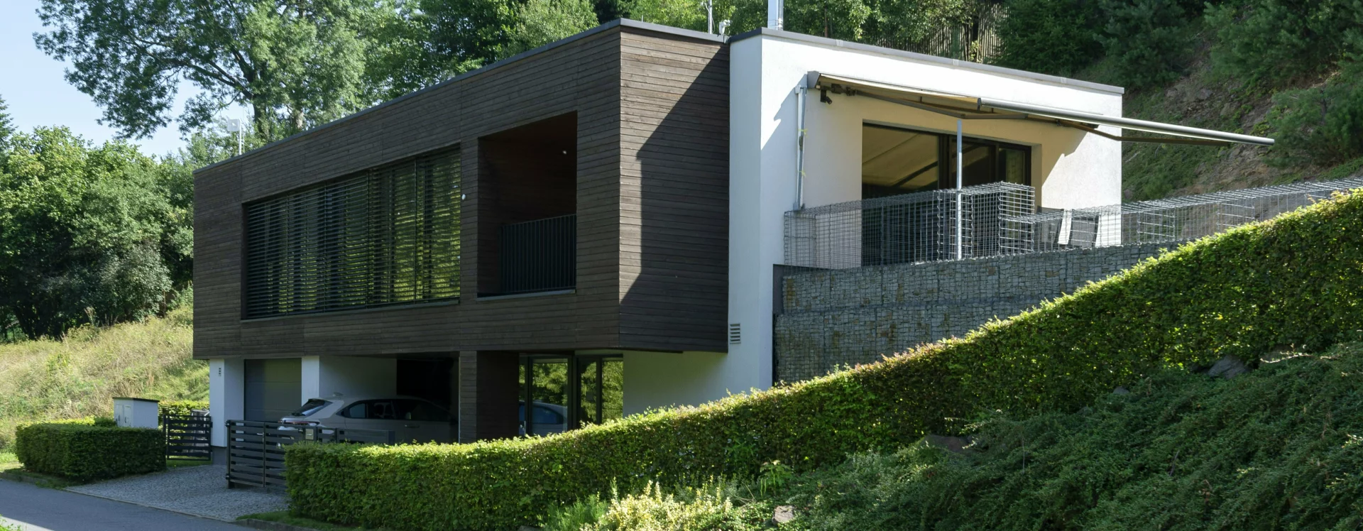 The two-storey building has a ground floor partially embedded into the sloping terrain. The upper level visually consists of two adjoining rectangular volumes with a fully glazed front facade clad in Siberian larch and a flat roof. The second floor, serving as the main living area, is built from ceramic blocks, while the ground floor—housing the building’s technical facilities—is made of monolithic reinforced concrete. The two levels are connected by a staircase illuminated from above by a skylight set into a masonry clerestory, with the main wall featuring a vertical green garden.