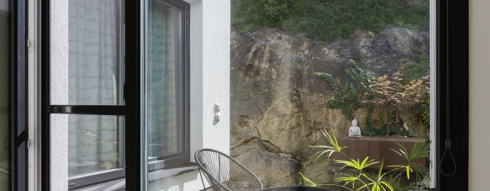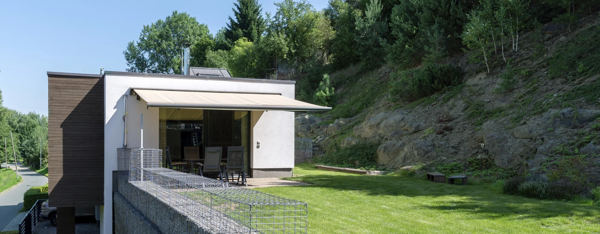 The well-organized layout includes a corridor linking the various living spaces and providing access from the terrace to a small relaxation garden, created by terracing the plot and constructing a vertical gabion wall. The collaboration between the architect and the well-informed clients resulted in a high-quality, functional building set on an atypical plot in a quiet part of Havlíčkův Brod, not far from the town reservoir.