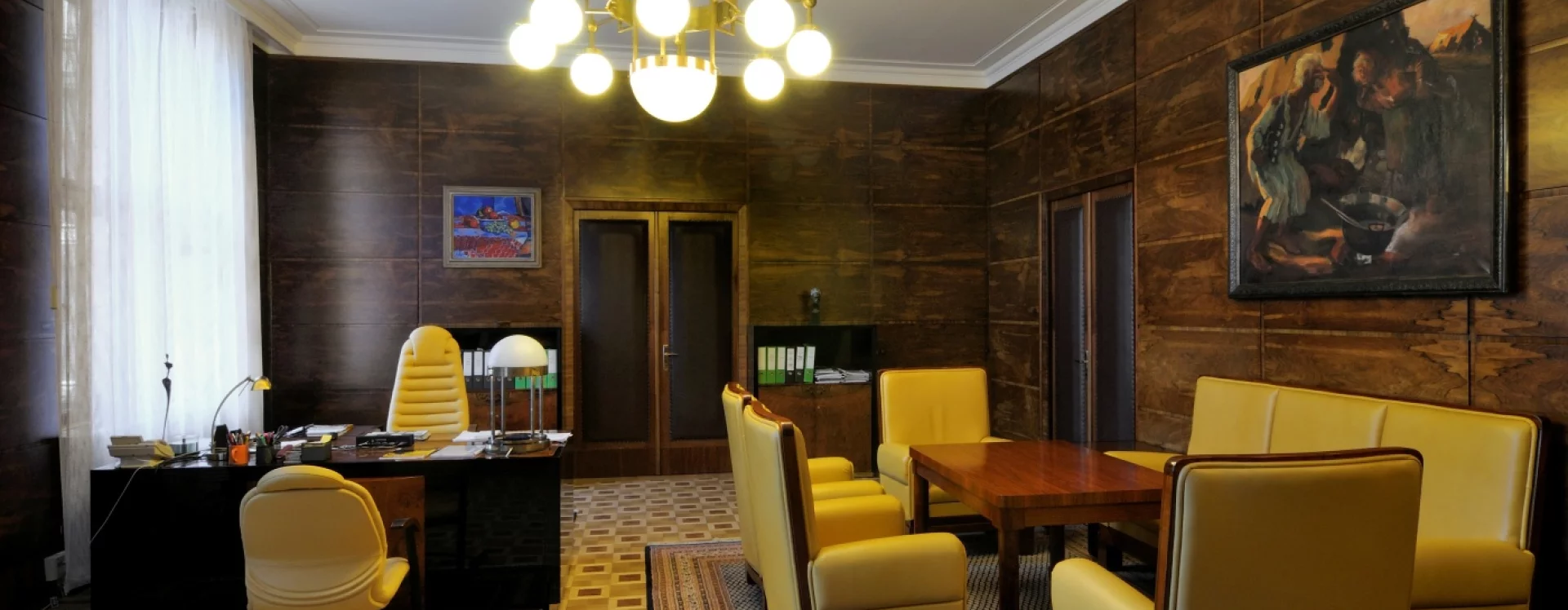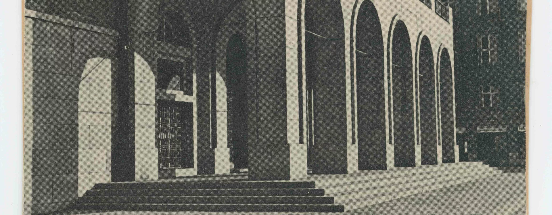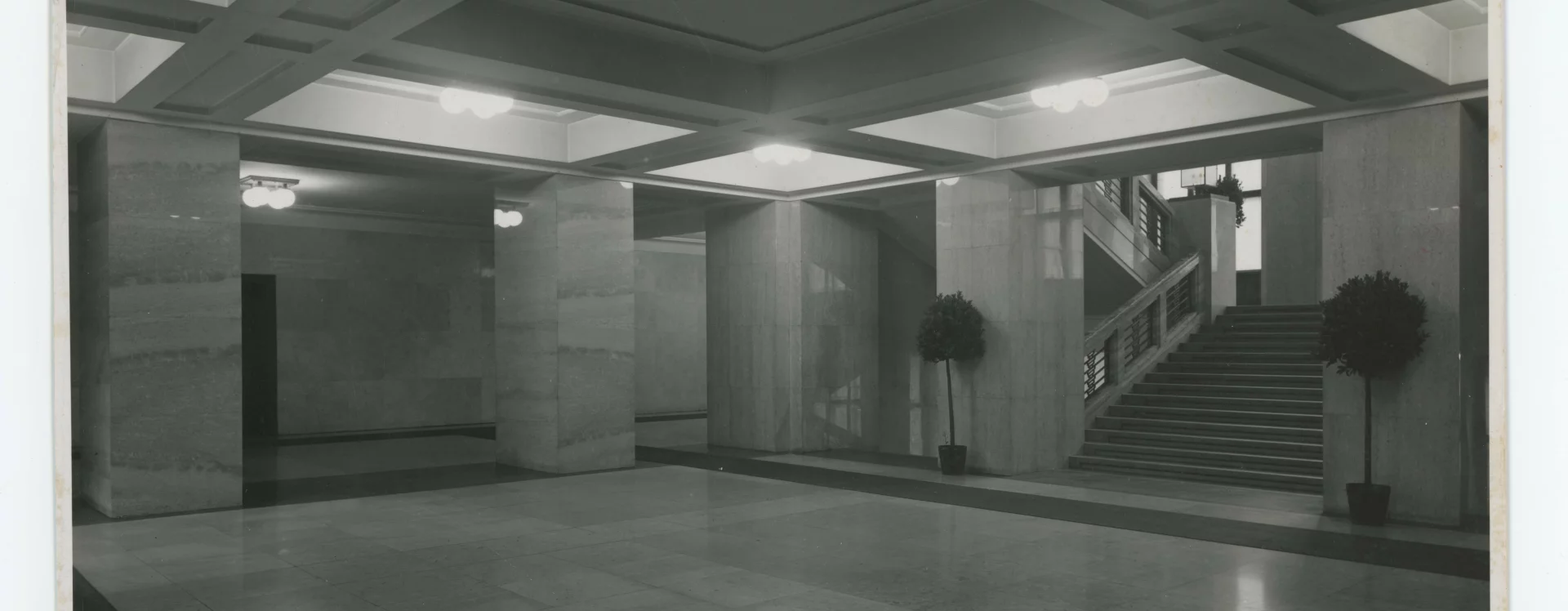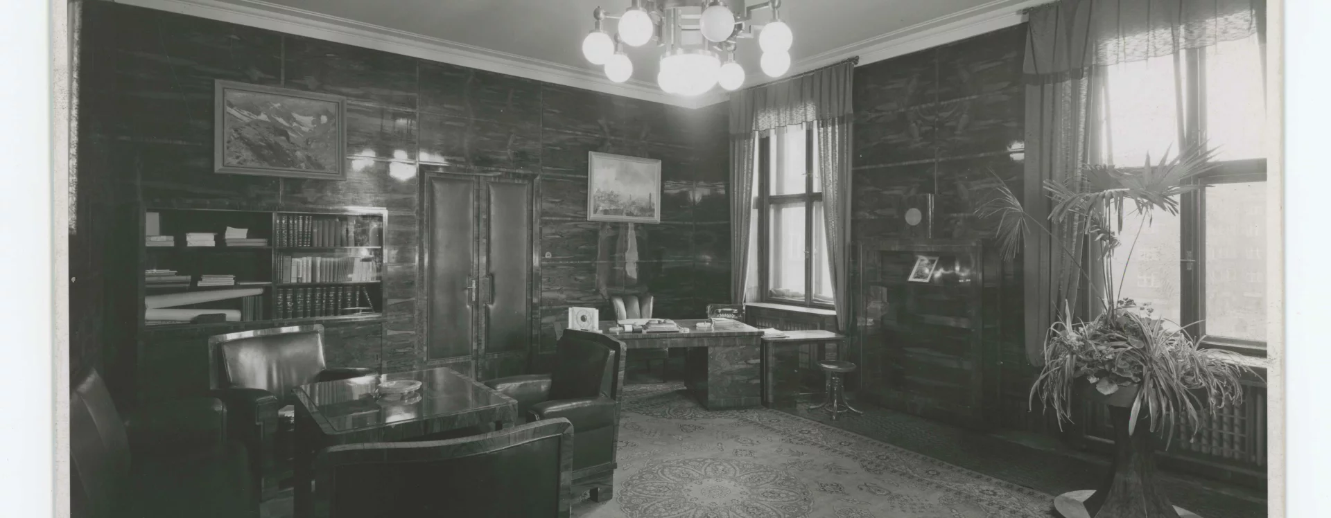 Having proven himself through these tasks, the young architect was also entrusted with designing the town hall interiors. Several alternative drafts survive for the main assembly hall for the municipal council and board, in which he explored the use of a top-lit space. The short sides of the hall contained visitor galleries, while the stage featured an organ. Kotas also designed the mayor’s office, a reception hall, and a restaurant with a terrace overlooking the park. As in his work for the Municipal Savings Bank, he emphasised representative character through the use of high-quality materials: fine woods, marble, travertine, and Silesian granite. Sculptors Josef Axmann and Rudolf Březa added artistic details such as bronze balustrade panels and votive plaques flanking the main entrance. The entrance façade was adorned with bronze sculptures representing mining, metallurgy, commerce, and science by the Brno sculptor Václav H. Mach, cast by Franta Anýž from Prague.