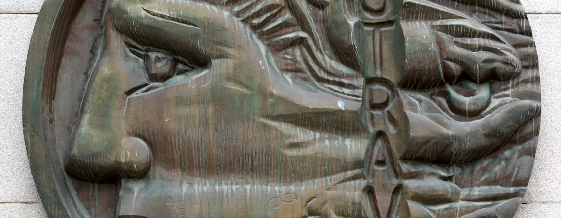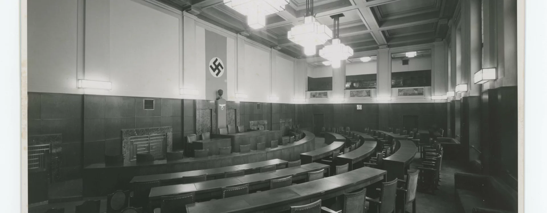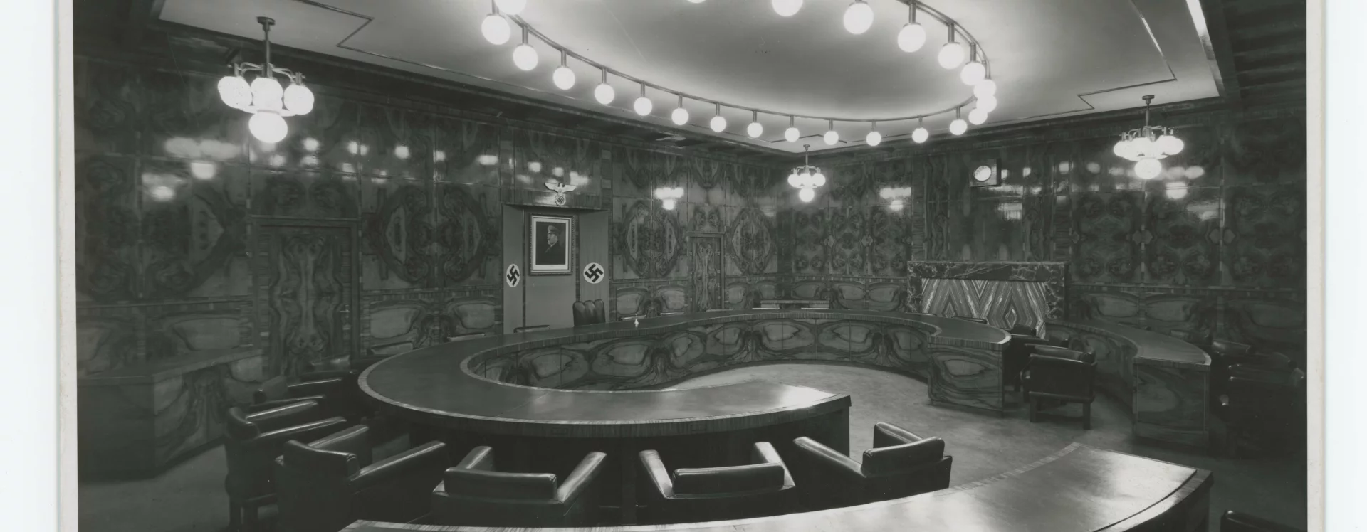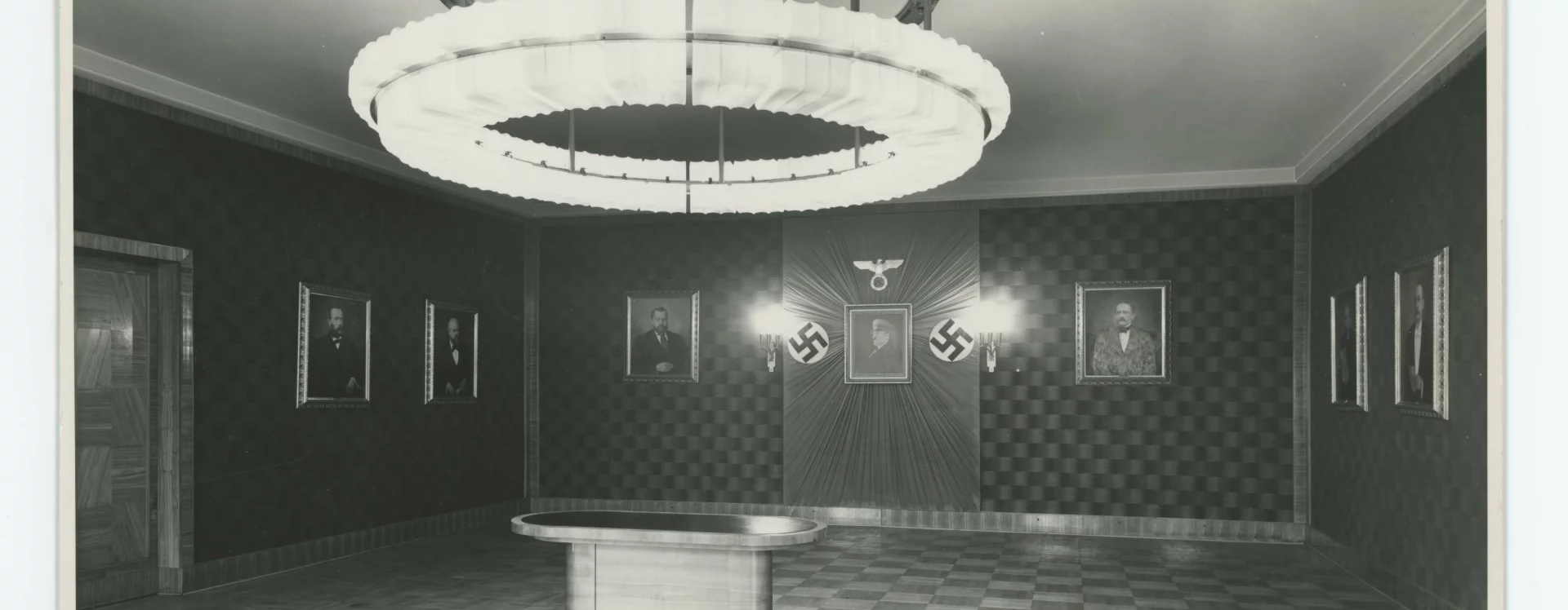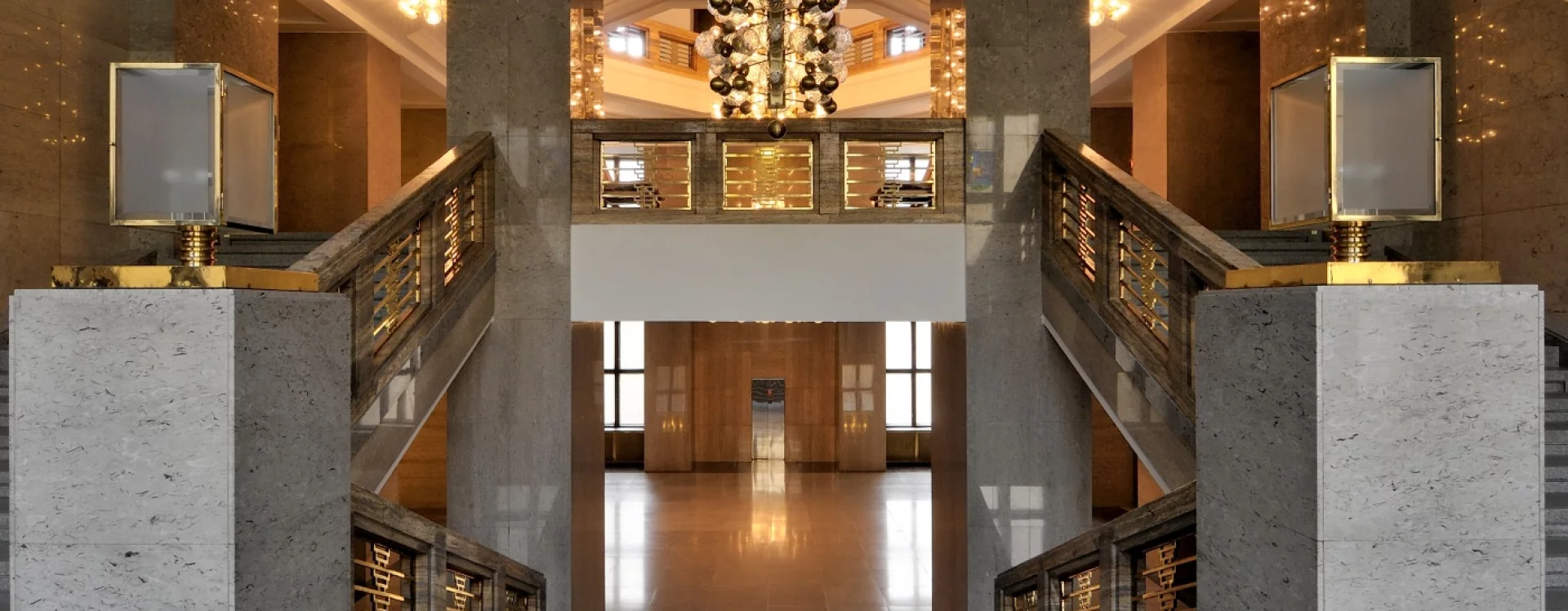Having proven himself through these tasks, the young architect was also entrusted with designing the town hall interiors. Several alternative drafts survive for the main assembly hall for the municipal council and board, in which he explored the use of a top-lit space. The short sides of the hall contained visitor galleries, while the stage featured an organ. Kotas also designed the mayor’s office, a reception hall, and a restaurant with a terrace overlooking the park. As in his work for the Municipal Savings Bank, he emphasised representative character through the use of high-quality materials: fine woods, marble, travertine, and Silesian granite. Sculptors Josef Axmann and Rudolf Březa added artistic details such as bronze balustrade panels and votive plaques flanking the main entrance. The entrance façade was adorned with bronze sculptures representing mining, metallurgy, commerce, and science by the Brno sculptor Václav H. Mach, cast by Franta Anýž from Prague.