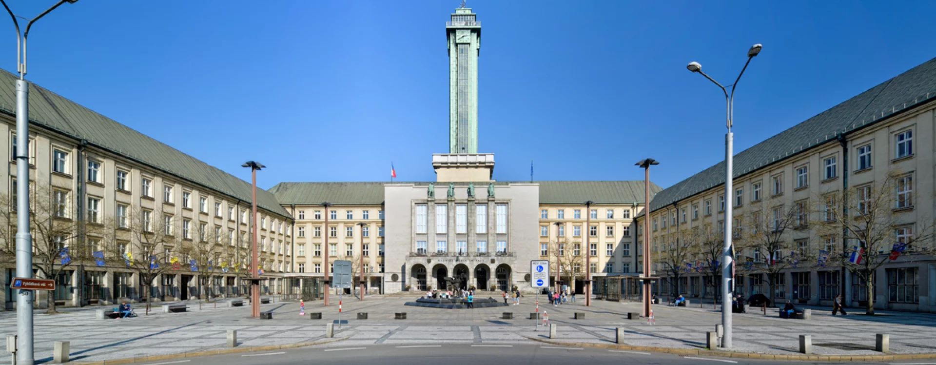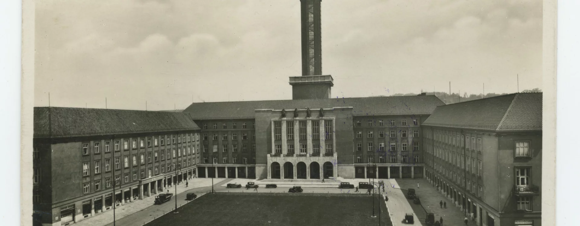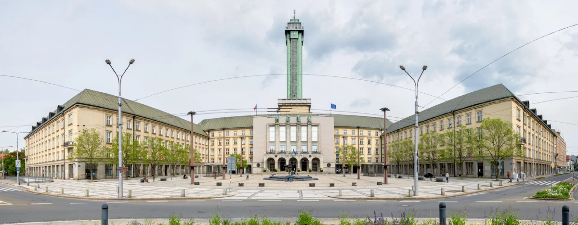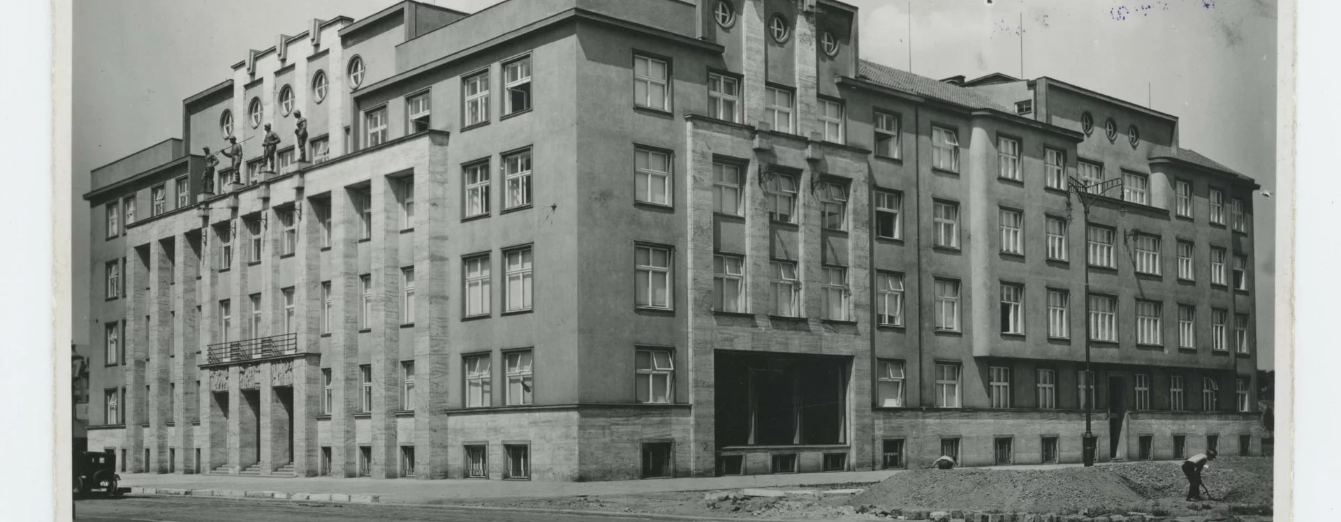 From the Middle Ages until the 1920s, the town hall of Moravská Ostrava stood on the historic square (now Masarykovo Square). As the town grew, the existing building no longer met the needs of the expanding municipality. A crucial impulse for constructing a new town hall was the plan to merge Moravská Ostrava with neighbouring municipalities (Vítkovice, Přívoz, Zábřeh, Mariánské Hory, Hrabůvka, and Nová Ves) to form Greater Ostrava. At the same time, the 1920 Act on the Establishment of regional administrative districts (called “župy”) introduced entirely new territorial administrative units for which the respective centres were expected to provide suitable premises. Moravská Ostrava therefore began planning a new building that could house both the municipal administration and the future district offices. From several possible sites, the city selected the area of the former shooting range (Nová střelnice) near the River Ostravice. Although outside the historic core, it lay close to other offices, institutions and company headquarters, was well connected by public transport, and offered space for creating a dignified public square.