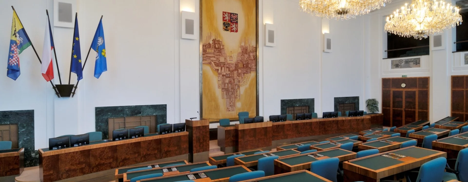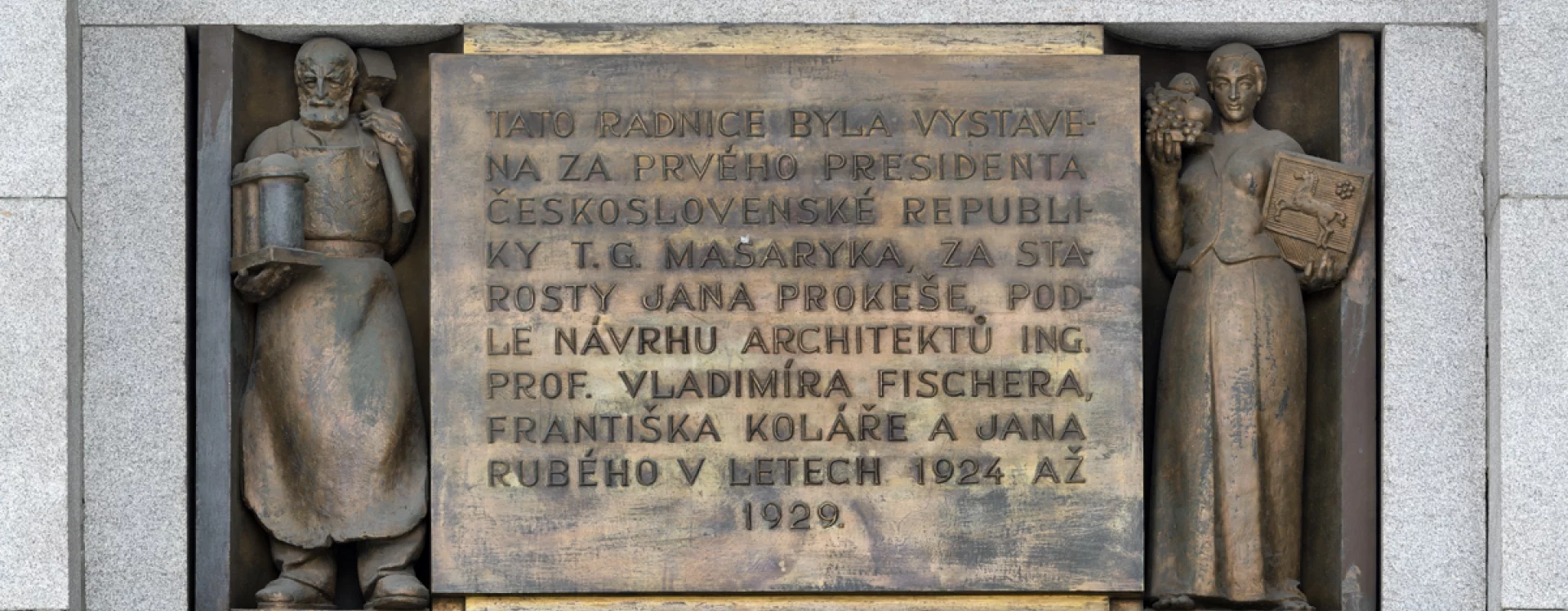 The symmetrical building, enclosing a square named after Mayor Jan Prokeš, consists of four parts, each with its own building number. The wings have a two-tract floor plan with a central corridor providing access to offices and other rooms. The main central wing (today no. 1803) with two courtyards and the dominant tower is fronted by a five-bay stone-clad risalit with an arcaded portico. The risalit is crowned by an attic with four bronze allegorical figures by Václav H. Mach. This wing housed representative rooms, council and board chambers, and the mayor’s offices. Many original interiors have survived, including the central vestibule and the main triple-flight staircase with stone cladding, paving, and brass cubic light fittings designed by Karel Kotas; as well as the mayor’s office and the council chamber. The assembly hall has undergone some alterations – such as the removal of stained-glass windows in the second half of the twentieth century – yet its spatial arrangement, including galleries, remains intact. The paternoster lift has also survived, albeit modified in the 1990s. The northern wing (today no. 1800), structurally independent except for the central heating system, housed the district office with the district governor’s apartment, the cadastral office, the tax office and the revenue authority. The southern wing (today no. 1802) served as administrative offices, and the perpendicular residential wing (today no. 1801) provided apartments for municipal employees.