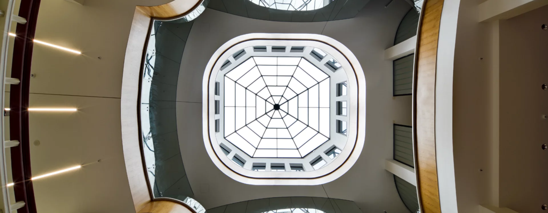 The first design, completed in February 1928, envisioned a six-storey building (a ground floor plus five upper floors) on an irregular pentagonal plan, with an oval skylight in the centre and a double-flight horseshoe staircase leading to the third upper floor. Access to the fourth and fifth upper floors, where offices and service areas were located, was provided by a single-flight fan-shaped staircase on the right-hand side. Entrances to the ground floor were located both at the prominent corner and on the left-hand side through a passage lined with shop windows. The façade, in contrast to the richly designed interior, was austere and composed as a grid of large rectangular windows. The revised plans from July 1928 reduced the design to five storeys (a ground floor plus four upper floors). Compared to the earlier version, Frommer changed the skylight from oval to cartouche-shaped and relocated the fan-shaped main staircase, now reaching only the second upper floor, to the rear of the space. Between the skylight and the staircase, a mezzanine with an open snack bar was inserted at the level of the second upper floor. From the third upper floor upwards, the skylight assumed an octagonal form, while access to the higher storeys was provided by a simple staircase at the rear and an additional side staircase. The nine-axis, slightly angled façade facing 28. října Avenue was more decorative than in the first design. The ground floor was articulated with large shop windows and two entrances. Above the display windows, pierced friezes with openwork decoration and the letter T were inserted, surmounted by a continuous narrow moulded cornice bearing the name TEXTILIA above the entrances. The upper storeys featured rectangular, horizontally divided windows; in the second to fourth upper floors, the windows above the entrances were fitted with small segmental balconies with decorative metal railings. The vertical composition of the façade was accentuated by pilaster-like strips, originally intended to be topped with small pyramidal finials, which were never executed – just as the larger pyramids with the TEXTILIA lettering planned above the entrances were omitted. The façade was meant to be clad in marble but was eventually finished with ceramic tiles. The building also received modern neon signage, a novelty at the time. The ground floor accommodated spacious sales areas selling fabrics, underwear, costume jewellery, and travel goods, as well as toilets with washrooms, two lifts, and a passage. The first upper floor offered women’s and men’s clothing and housed a snack bar, while the second and third upper floors featured children’s fashion, hats, and household textiles. The fourth upper floor was reserved for administrative and operational functions, including offices, an accounting department, a telephone exchange, goods reception, a sample room, a testing area, and workshops.