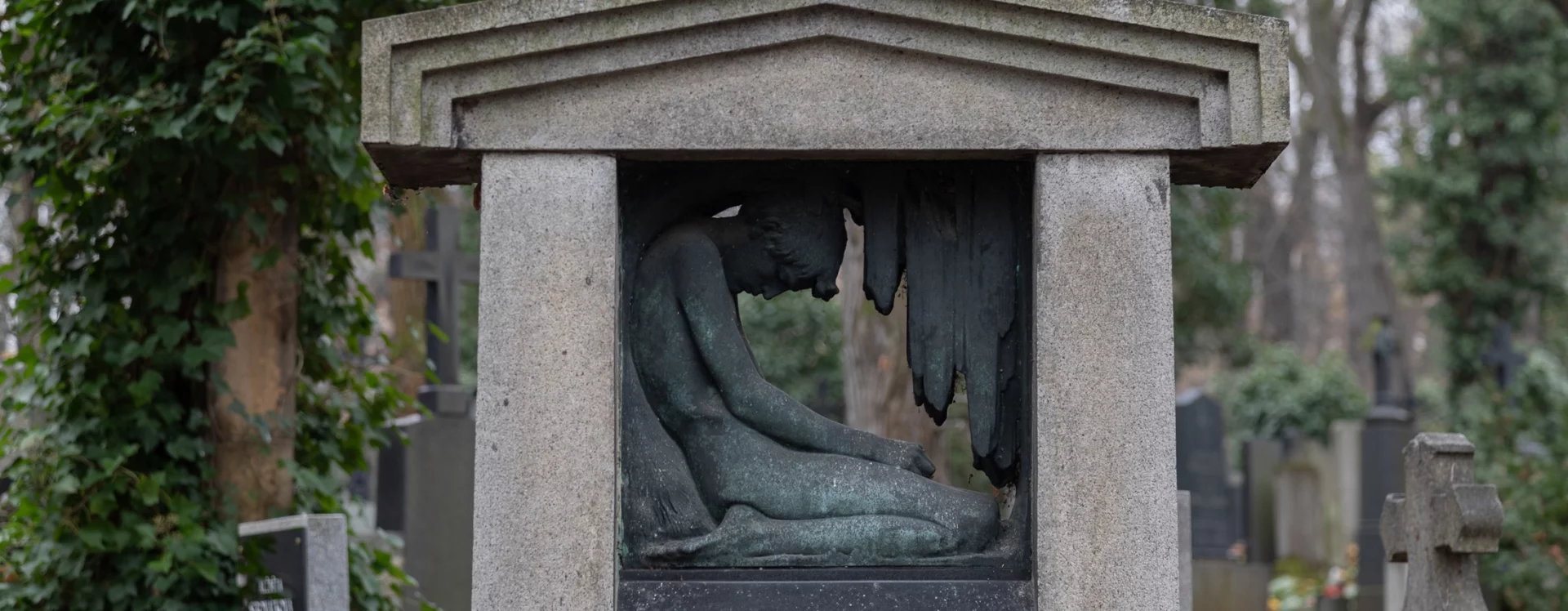 The symmetrical, tectonically structured composition has been done in honed Mrákotín granite. The end pieces on the ledger, especially the polygonal section at the front, evoke the semblance of a bed. The stele is crowned by a classicist tympanum that forms a small roof above the sculptural decoration and the black gabrodiorite inscription tablet. The main thing, however, is the small space underneath the roof, an opening almost entirely filled with a relief by Stanislav Sucharda depicting a crouched, mourning youth and the branches of a weeping willow. In this small frame, the burden of grief is expressed subtly, free of the era's typical pathos. It even includes a small unexpected miracle: through the narrow opening one cannot help but catch sight of the space beyond the monument, the sight of "somewhere further on."