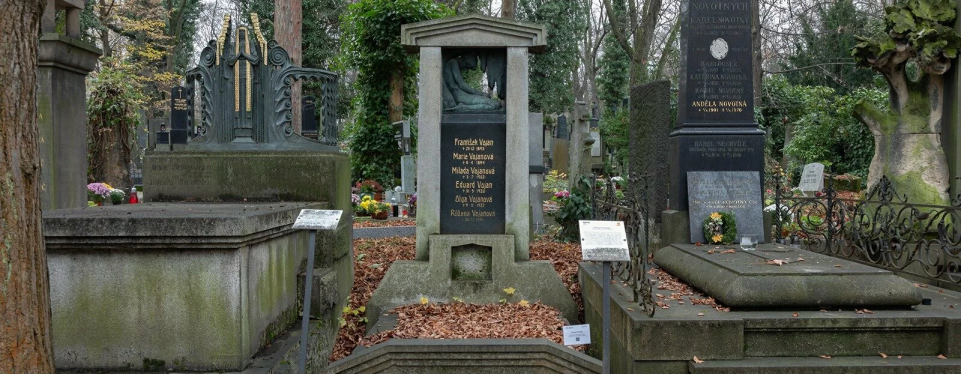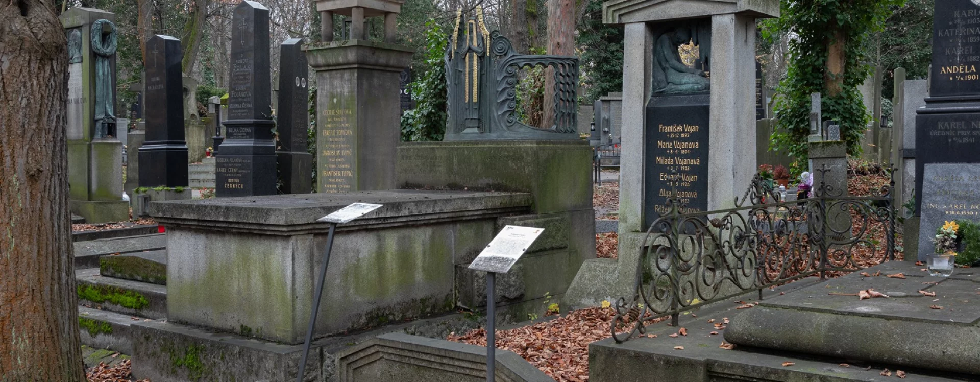 Just a few months after completing a monument for the popular actor Slukov and almost right next to his grave, the same creative duo – architect Jan Kotěra and sculptor Stanislav Sucharda – produced a grave monument for another legendary actor of the National Theatre, Eduard Vojan. It is of an entirely different design, however, among other things because it was not erected to commemorate the actor himself; instead, Vojan commissioned the memorial for his deceased three-year-old daughter Milada. Since the inscription tablet was later replaced, this fact is no longer apparent, and so the monument is generally perceived as being dedicated to Eduard Vojan.