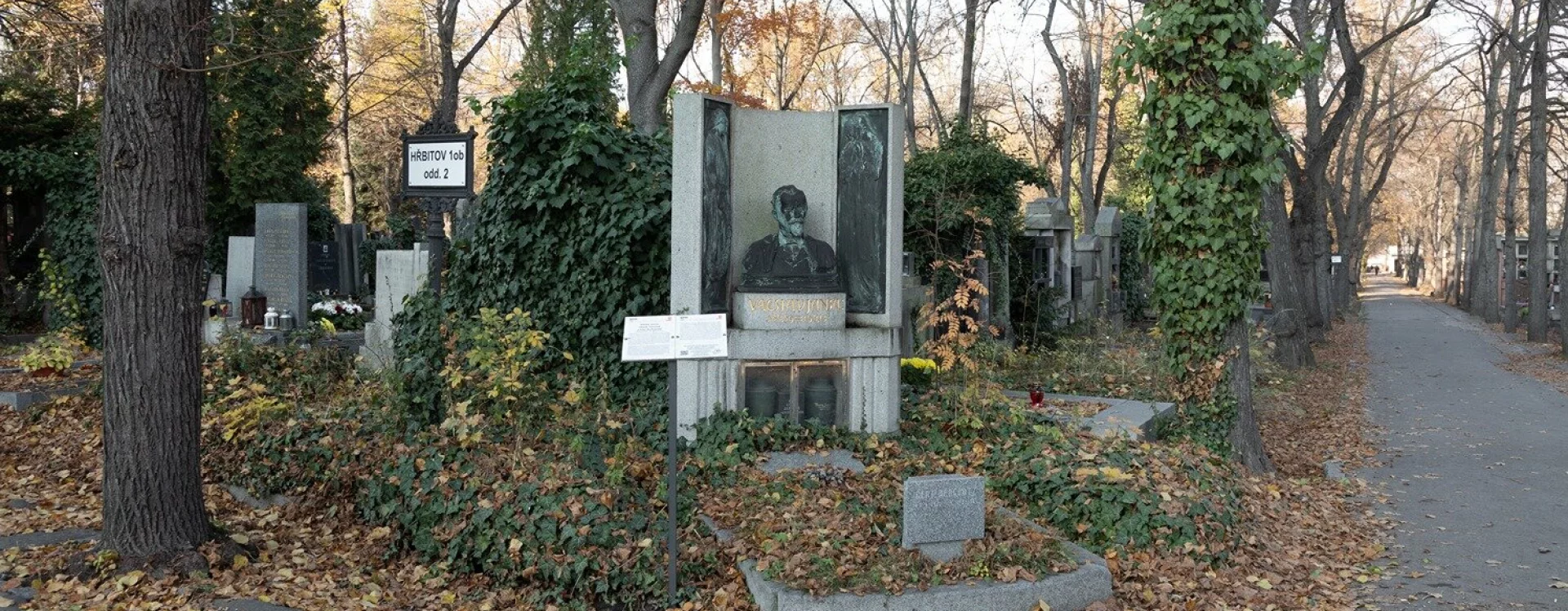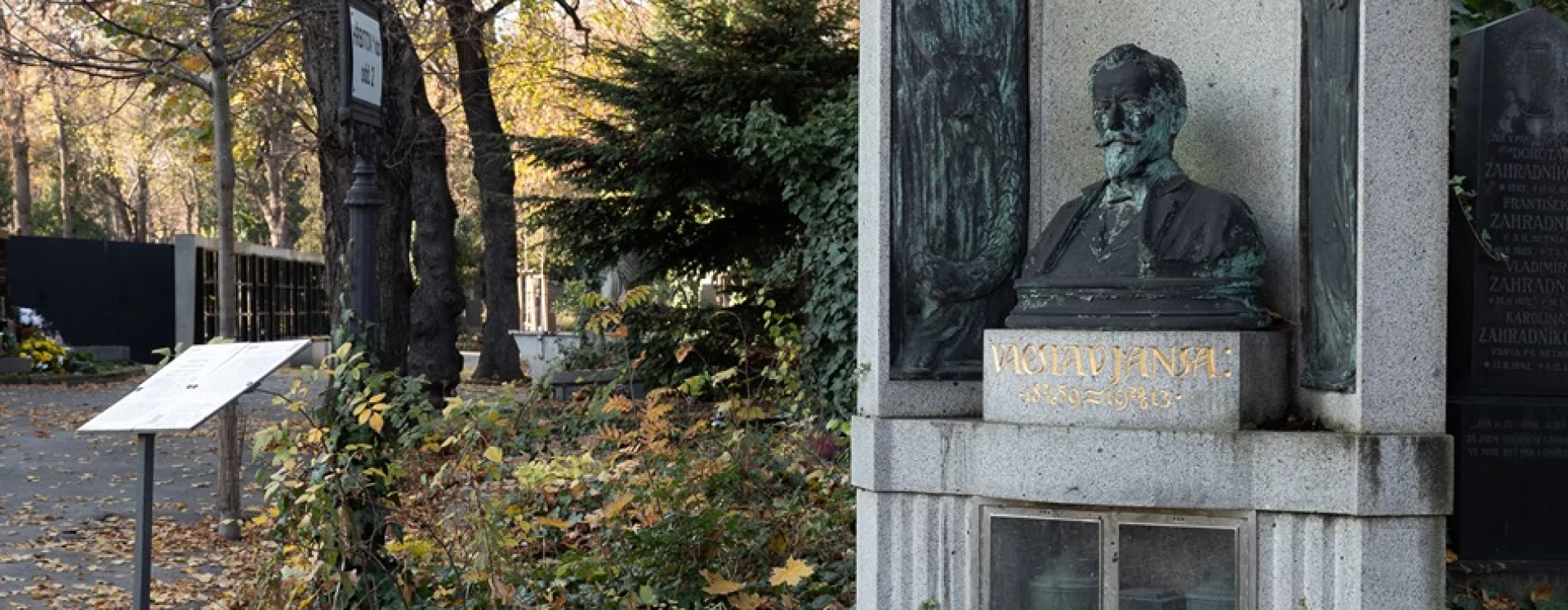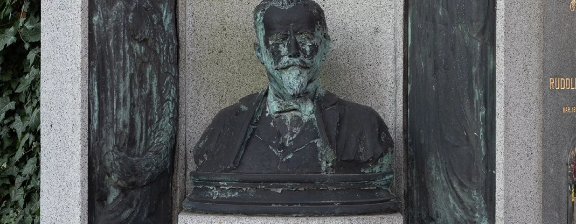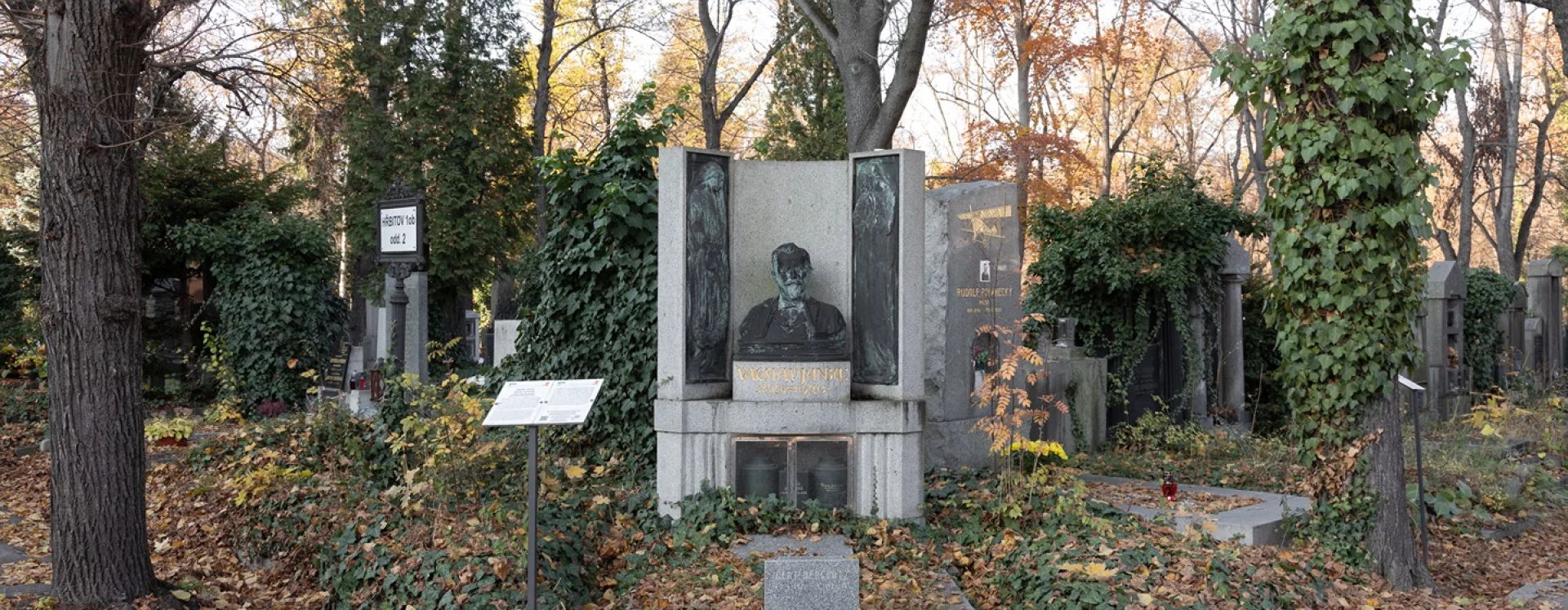 This unique grave marker, which is also a monument to an exceptional artist, was designed free of charge by the architect Josef Fanta using an earlier bust by Vilím Amort in which the sculptor depicted his friend Václav Jansa in his prime. Unusually, the urn with Jansa’s ashes was placed above-ground at a time when this manner of burial was not yet legal in Austria-Hungary. Following his death, Jansa’s body was brought to the German town of Zittau for cremation, and the urn was temporarily stored at the Náprstek Museum (which already housed urns containing the ashes of Vojta Náprstek and his wife Josefa). Besides one could already opt to be buried at a municipal cemetery established by the City of Prague instead of a Catholic cemetery, Jansa’s wish not to be buried in the ground could be fulfilled.