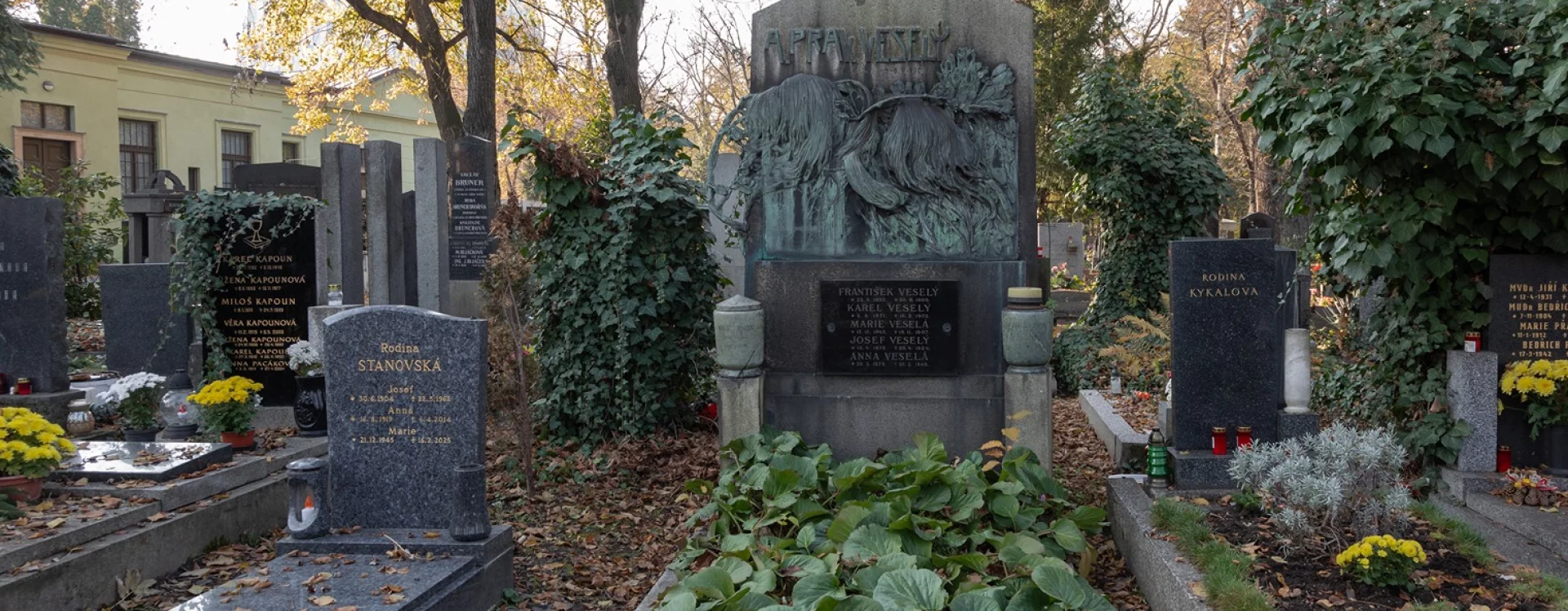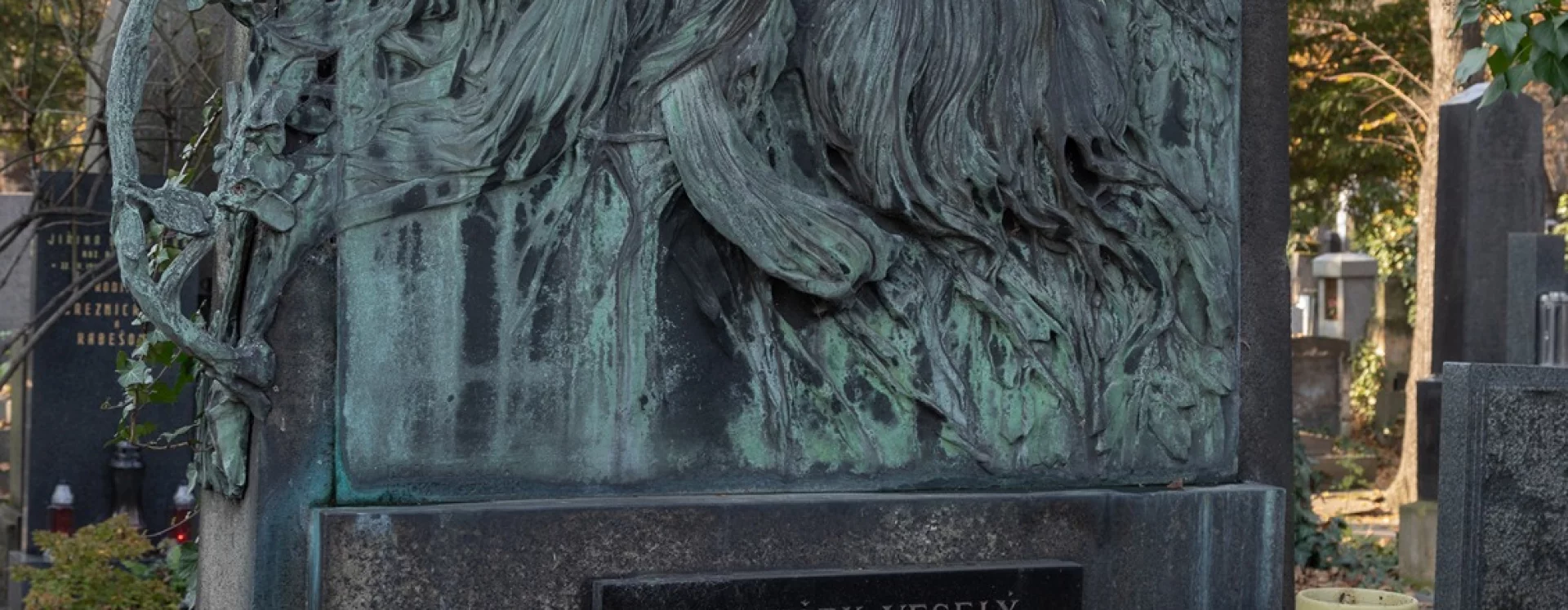 The sophisticated choice of large stylized Art Nouveau lettering announcing the name of the deceased may well be a reference to Veselý’s work as a typographer. A black plaque bearing the names of other family members was later placed at the lower part of the stele. The addition of the two columns with urns is one of several alterations whose exact dating remains unknown.