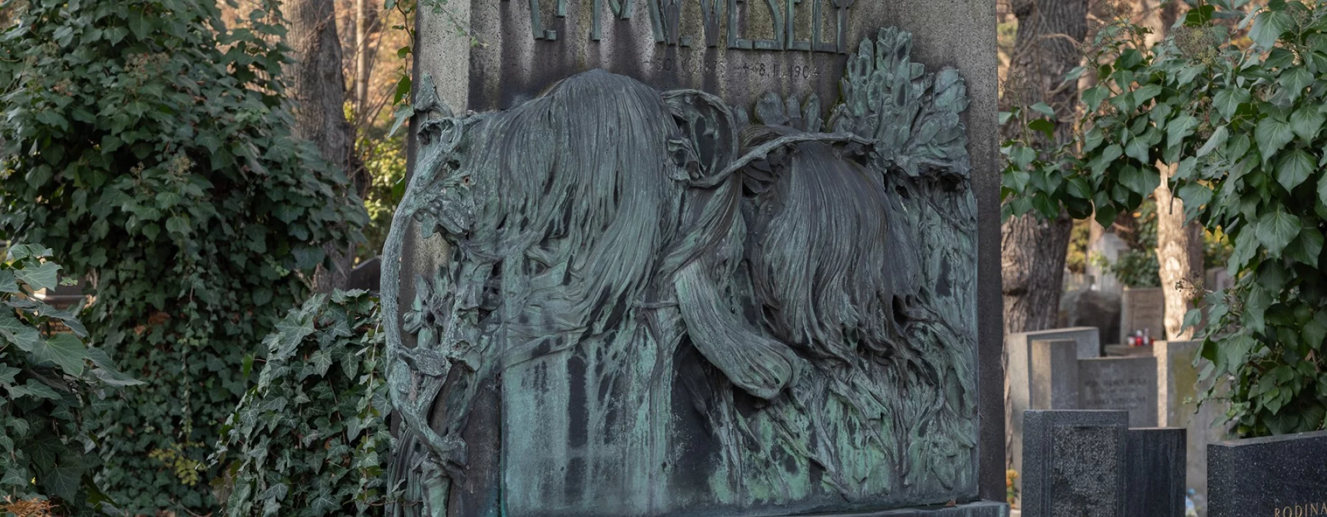 The Art Nouveau grave marker is one of several distinctive works at Olšany dedicated to a prematurely deceased individual whose untimely departure inspired the client to commission a grand design.