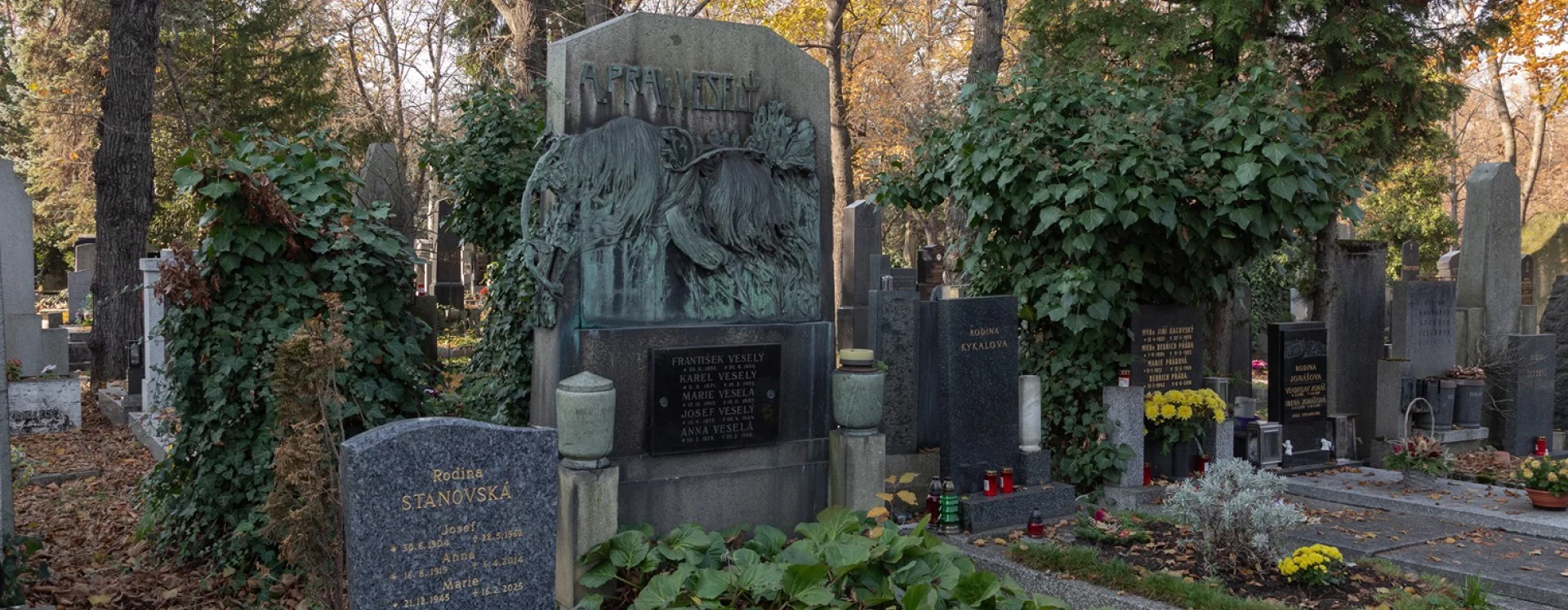 The grave is the burial site of the typographer, journalist, and writer Antonín Pravoslav Veselý, a representative of leftist socialist politics in the late nineteenth century. Veselý was active in the Workingmen’s Political Club in Prague and edited several magazines: Základ, Omladina, and Pokrokové listy. He later joined the Czechoslovak Social Democratic Party and edited the party newspaper, Právo lidu. In 1894, he was sentenced to seven months in prison as part of the Omladina Trial. During his incarceration he contracted tuberculosis, and he died from the consequences of the disease at age thirty.