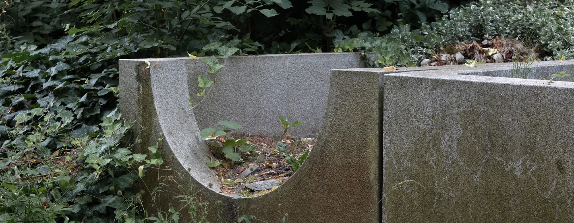 To the original gravestone – a classical yet unusual massive stele made of polished light granite, decorated with a bronze portrait medallion, and inscribed with the Mánes siblings' names in large, distinctive letters – Gočár added a Purist frame made of similarly light honed Mrákotín granite, whose volume compensates for the uneven terrain. In place of the usual small metal fence, he chose a massive stone border, into whose front end he cut a semicircular opening that seems to mirror the dark circular outline of the medallion on the light stone. With this design, Gočár was also referencing the basic shapes popularly used by the National Style, which was on the rise after Czechoslovak independence.