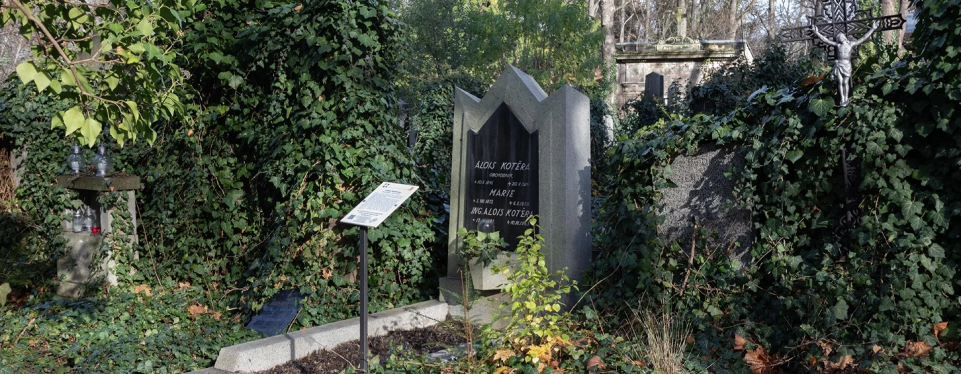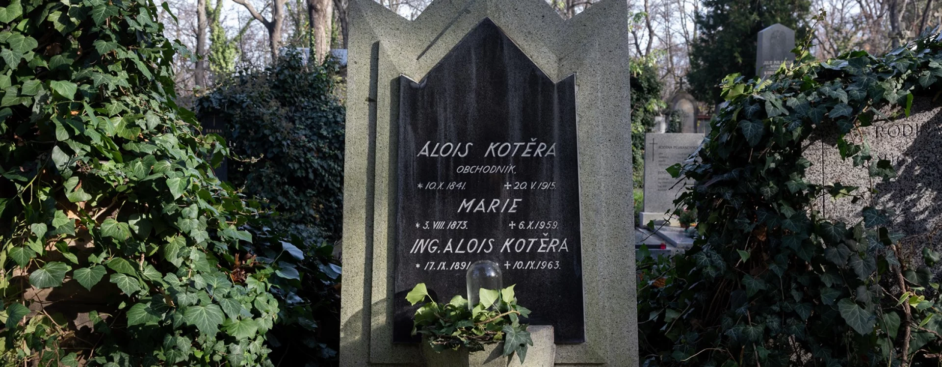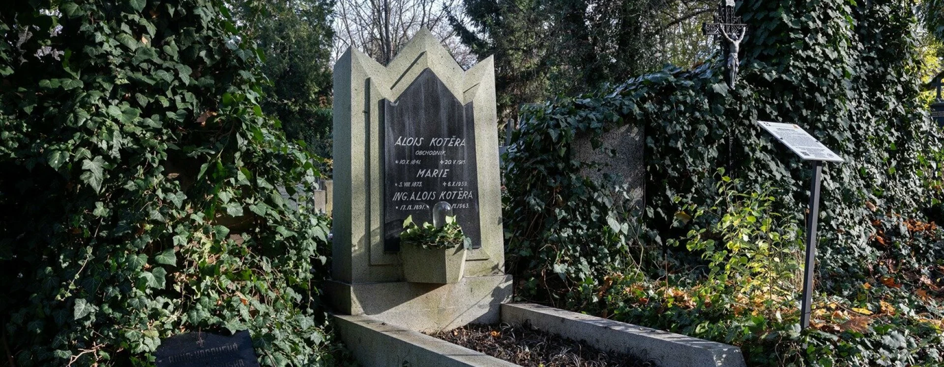 Jan Kotěra designed this grave for his relatives during the difficult years of the First World War, when the sharp decline in building activity made private tombs and grave monuments welcome commissions for architects. The grave was for Alois Kotěra, whom the literature usually identifies as the architect's uncle. Next to his name, the inscription on the gravestone describes him simply as "merchant." Buried alongside him are Marie (1853–1959) and Alois Kotěra (1891–1963).