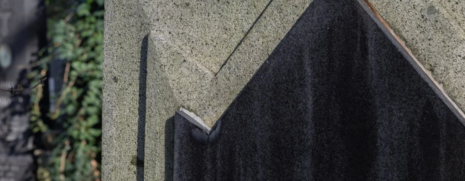 The gravestone was carved from light honed Požáry granite, while the inscription tablet is made of black polished Swedish granite. The distinctive color contrast between these materials accentuates the grave architecture's dynamic impact. The names on the tablet are written with an angular "E" whose form reflects Cubist typography's tendency toward deformation and fragmentation and its use of sharp edges and angled lines.