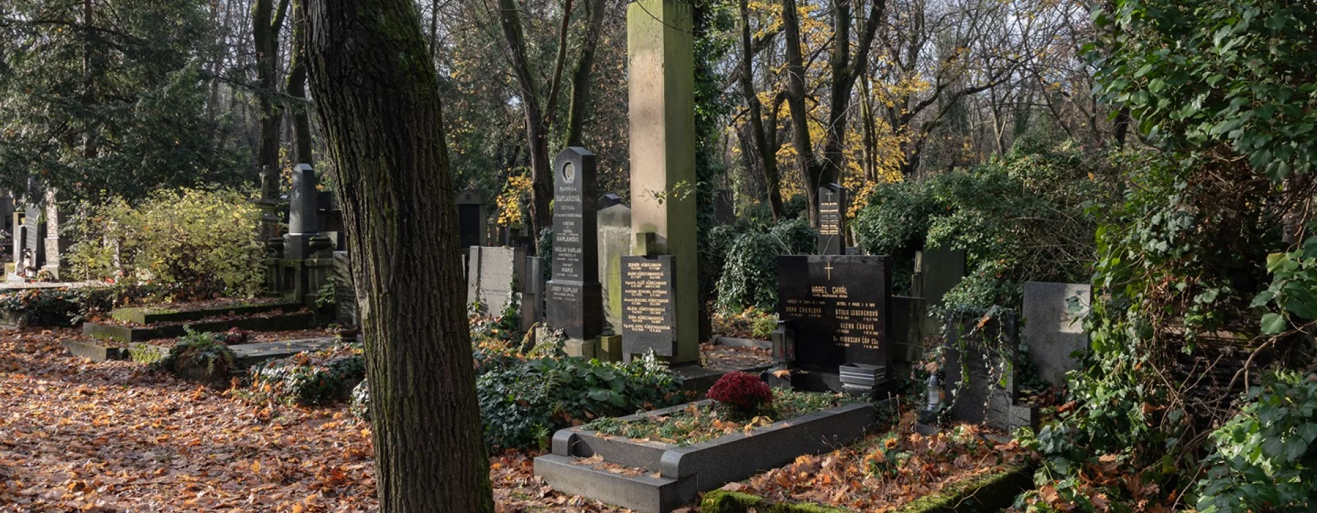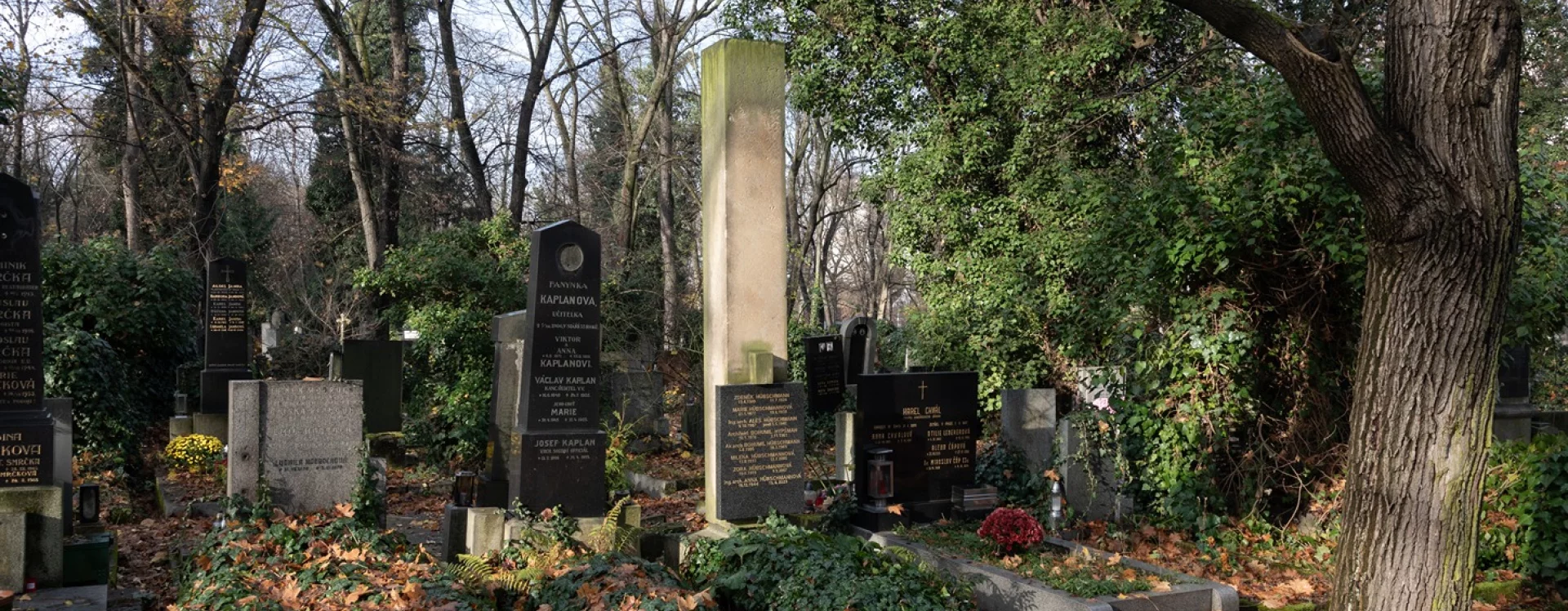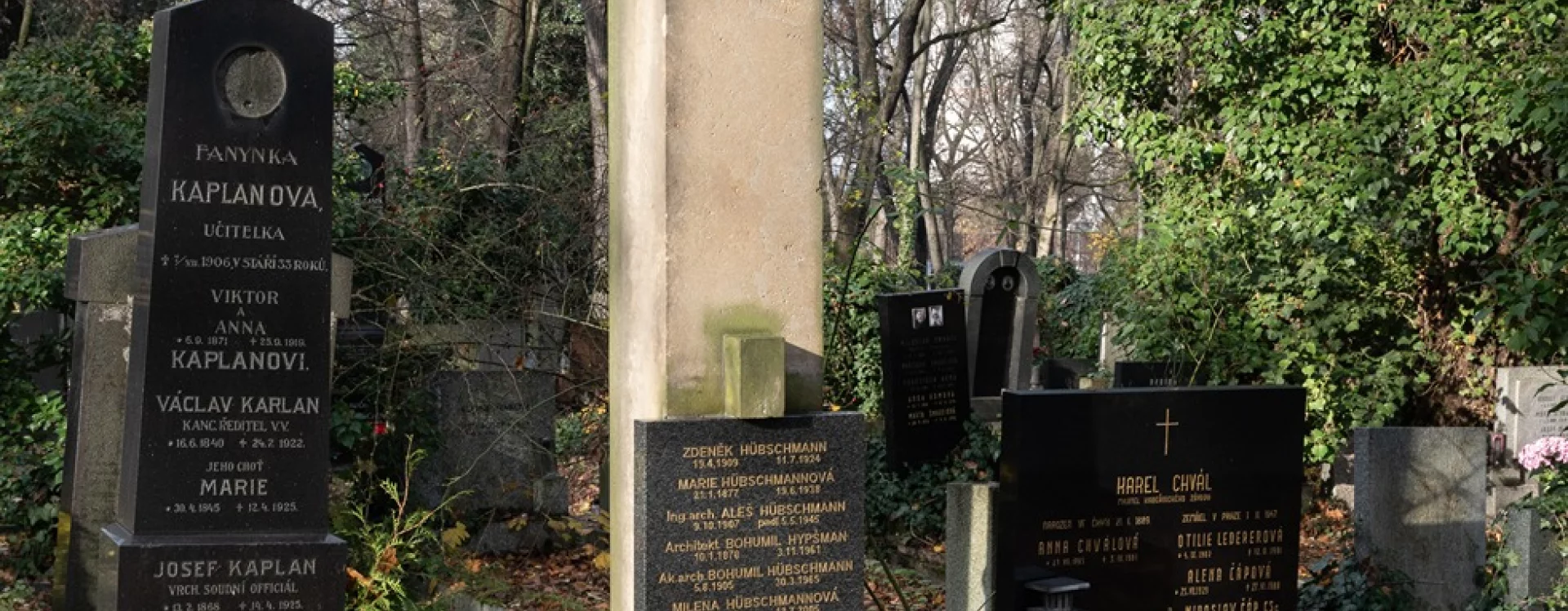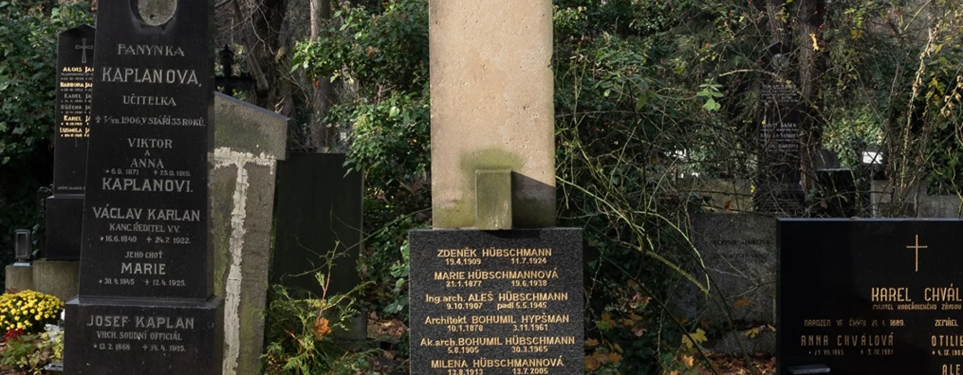 The grave is also the final resting place of his other son, the architect Aleš Hübschmann, who was killed during the Prague Uprising in May 1945. The gravestone's author himself was born in Prague in 1878 as Bohumil Hübschmann, but he officially changed his surname to Hypšman in 1945. Bohumil's brother Antonín, likewise an architect, was killed in the First World War. His older brother Otakar Hübschmann, an Austrian and Czech politician and a member of the Imperial Council in the early twentieth century, is also buried at Olšany, albeit in a different section (V, 10, 104).