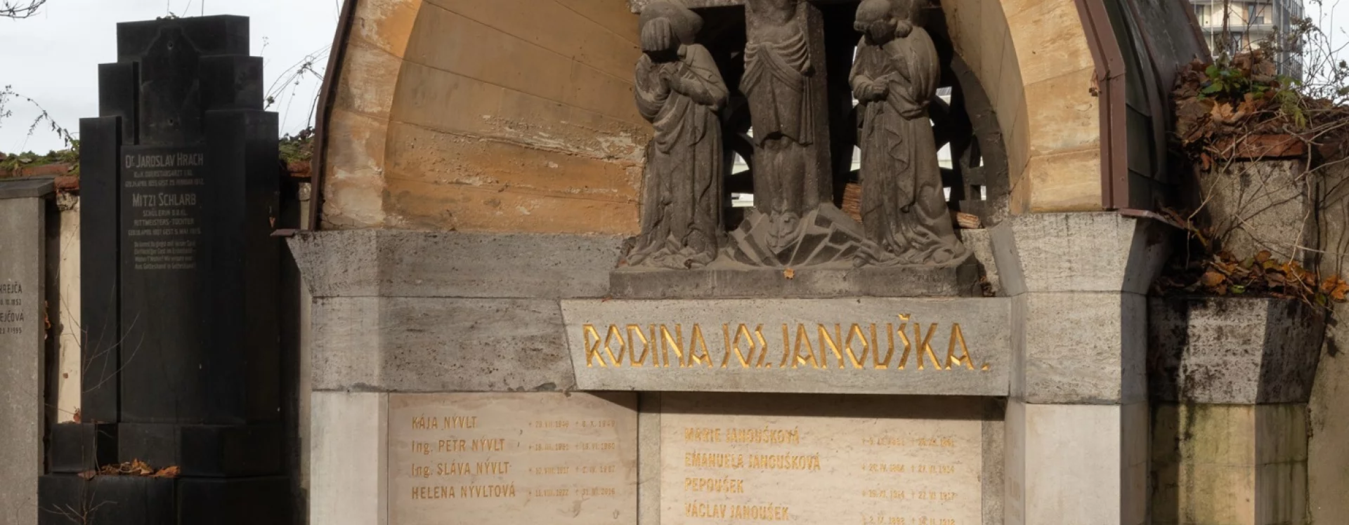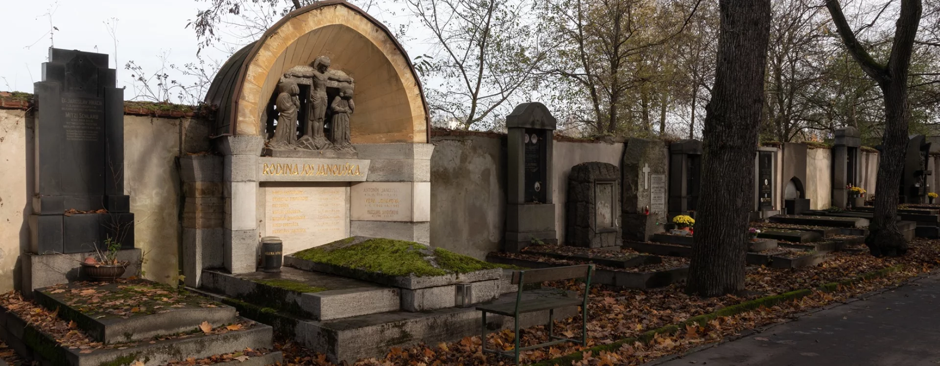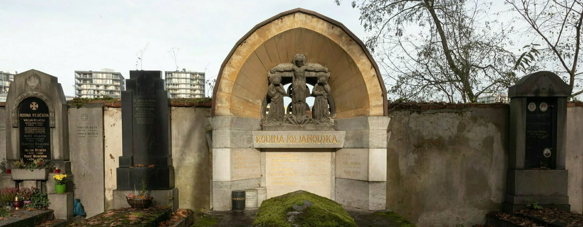 The large crypt, which according to the inscription panels contains the physical remains of at least nine members of the Janoušek family and five members of the Nývlt and Jonák families, is set against the northern cemetery wall along one of the cemetery's main paths and is clearly visible from afar. Kotěra's first funerary work, it shows Cubist influences even though he had previously distanced himself from the style.