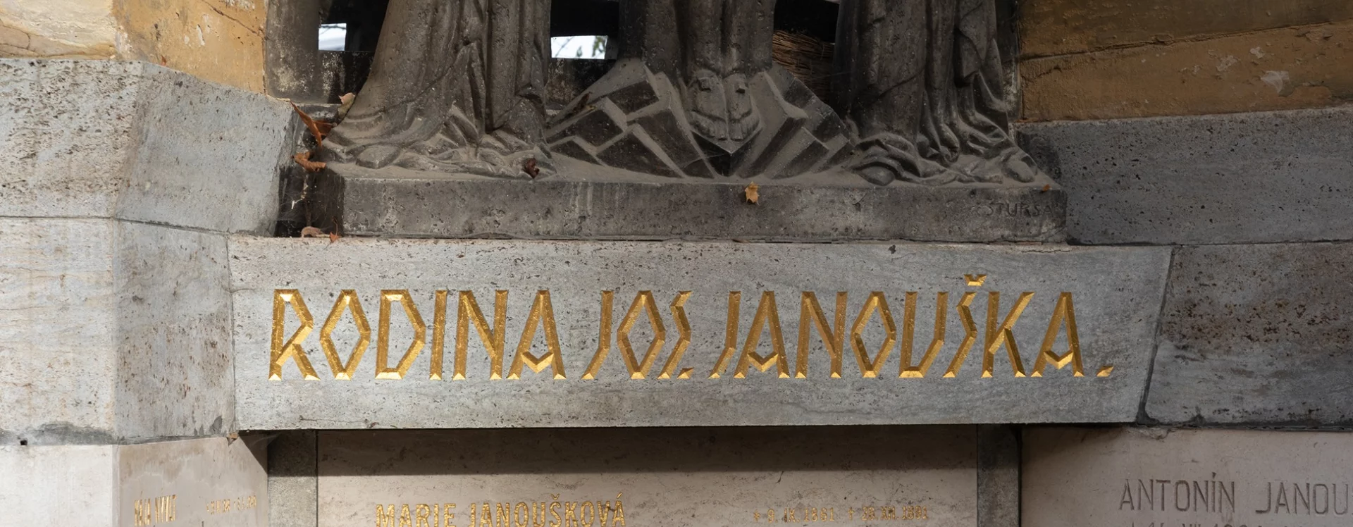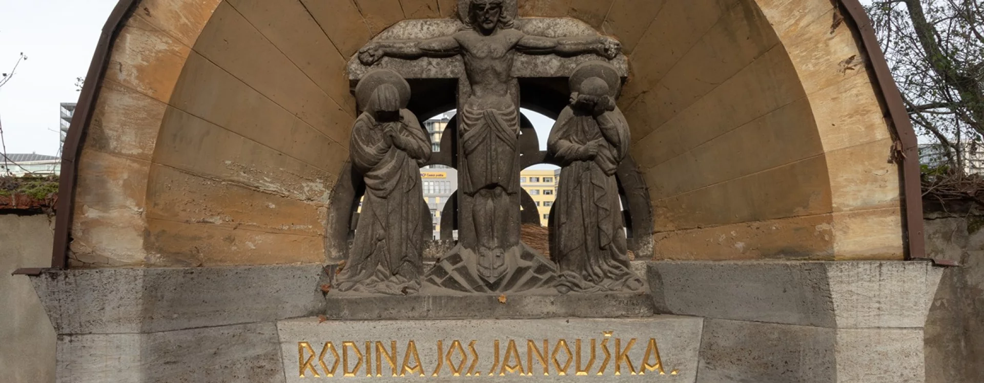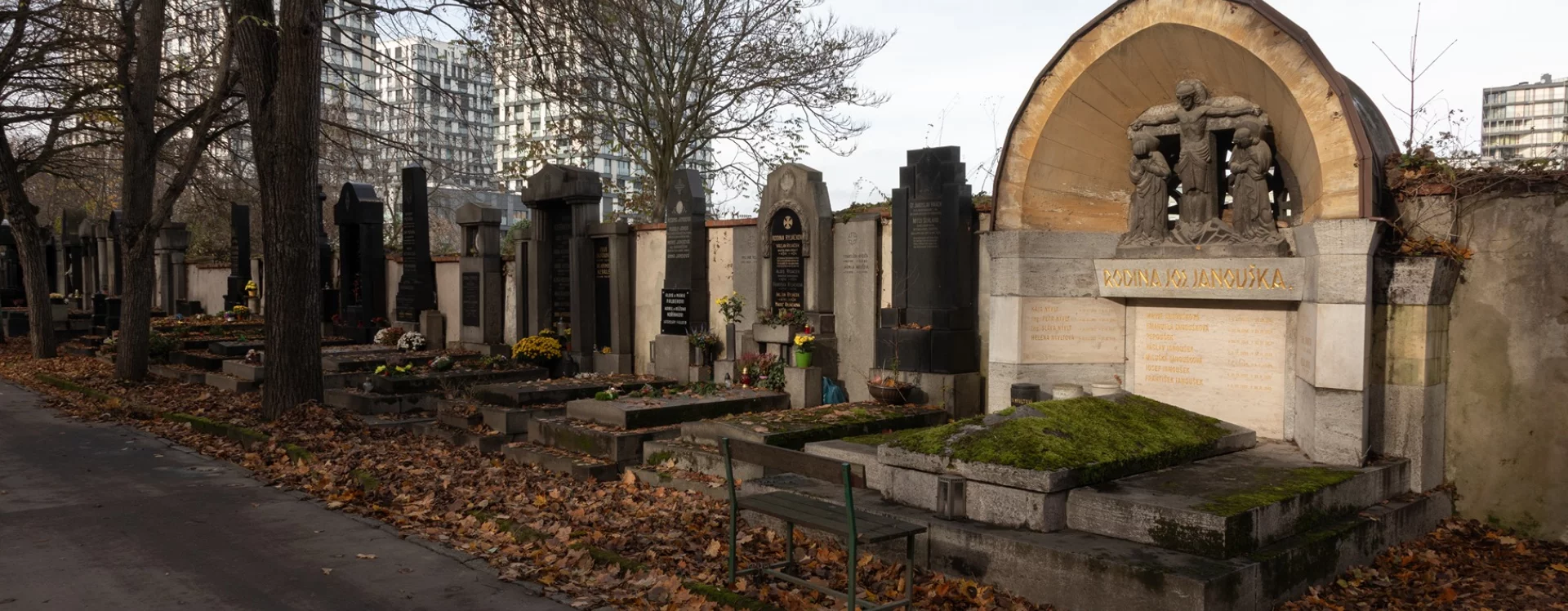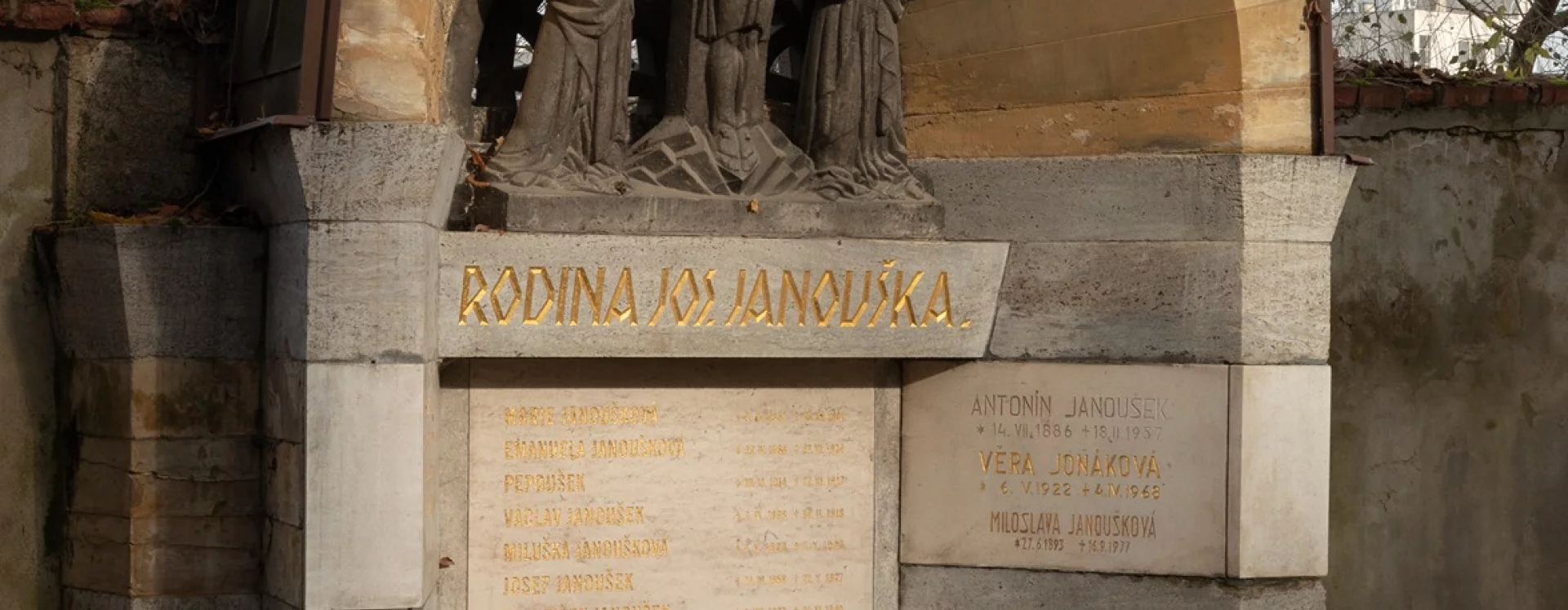 The large crypt, which according to the inscription panels contains the physical remains of at least nine members of the Janoušek family and five members of the Nývlt and Jonák families, is set against the northern cemetery wall along one of the cemetery's main paths and is clearly visible from afar. Kotěra's first funerary work, it shows Cubist influences even though he had previously distanced himself from the style.