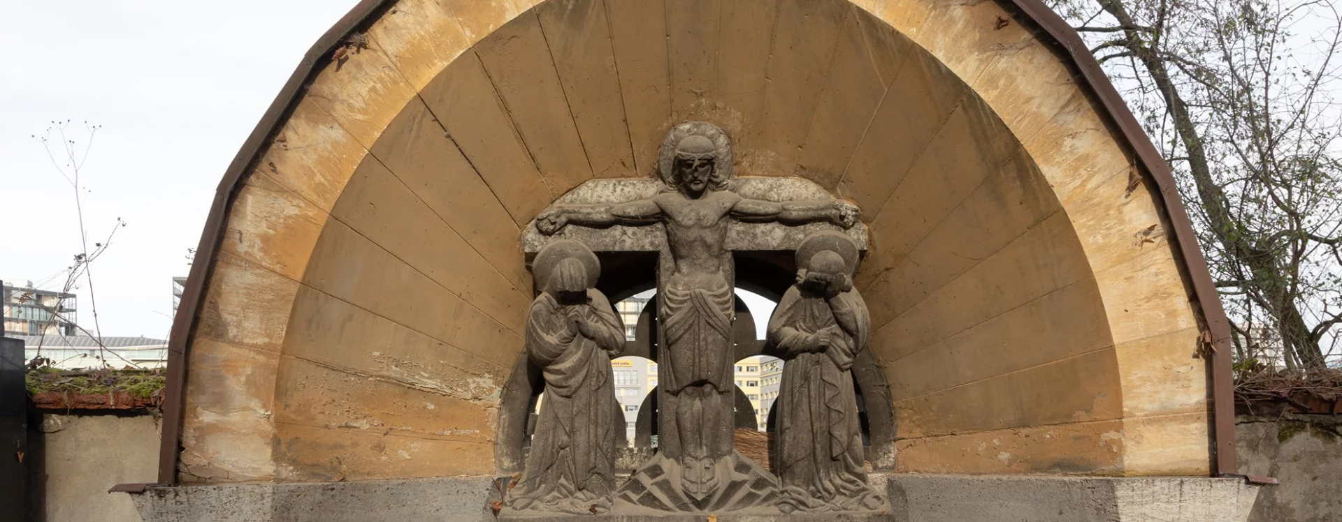 The ledger and the Calvary group are made of shelly limestone, while the tympanum vault is of marlstone, a material that can be seen as a reminder of the earliest Christian churches in the Czech lands. Because this stone is sensitive to environmental influences, it was later protected with a sheet-metal covering. The lower part of the tympanum, including the inscription panels, is made of Istrian limestone.